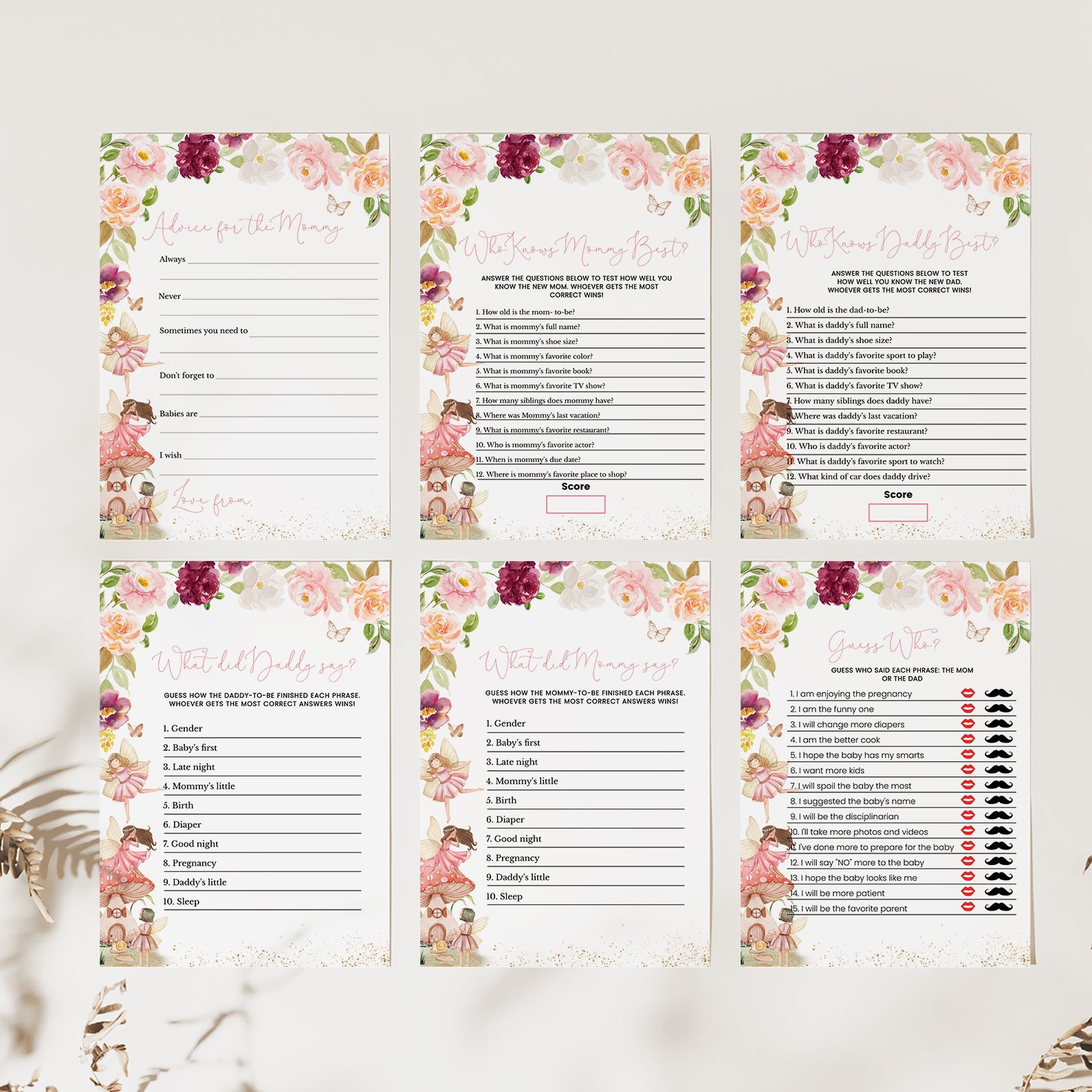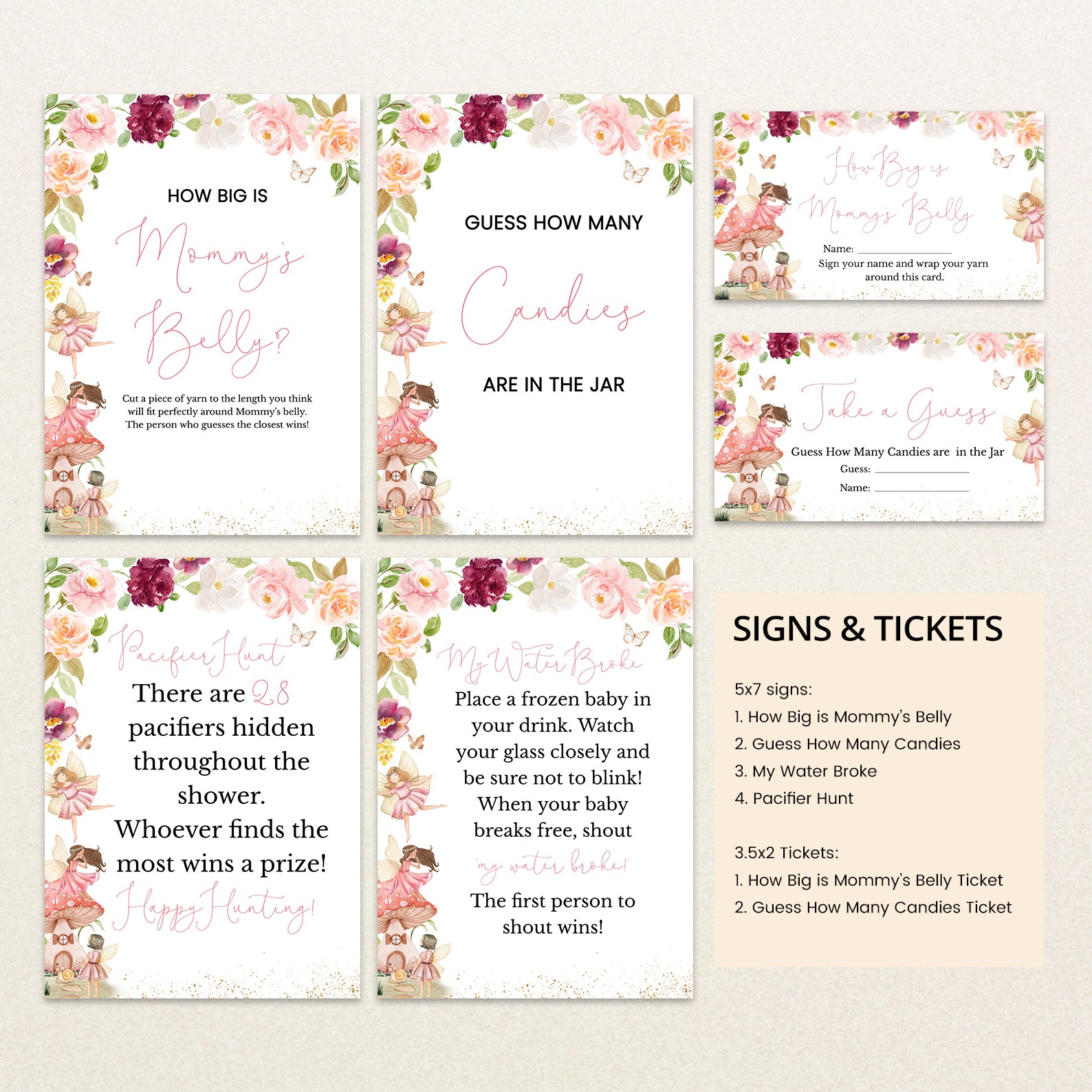 1. Purchase this Fairy Fall Baby Shower Game Bundle with Flowers & Gold Accents template