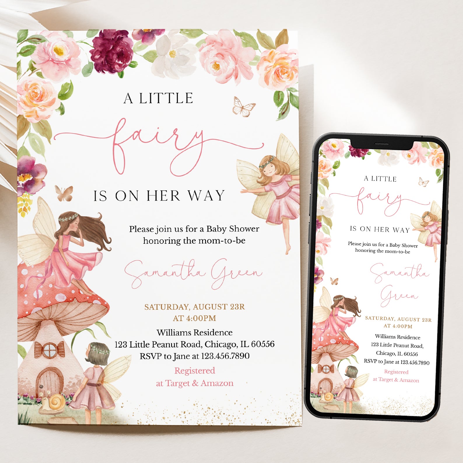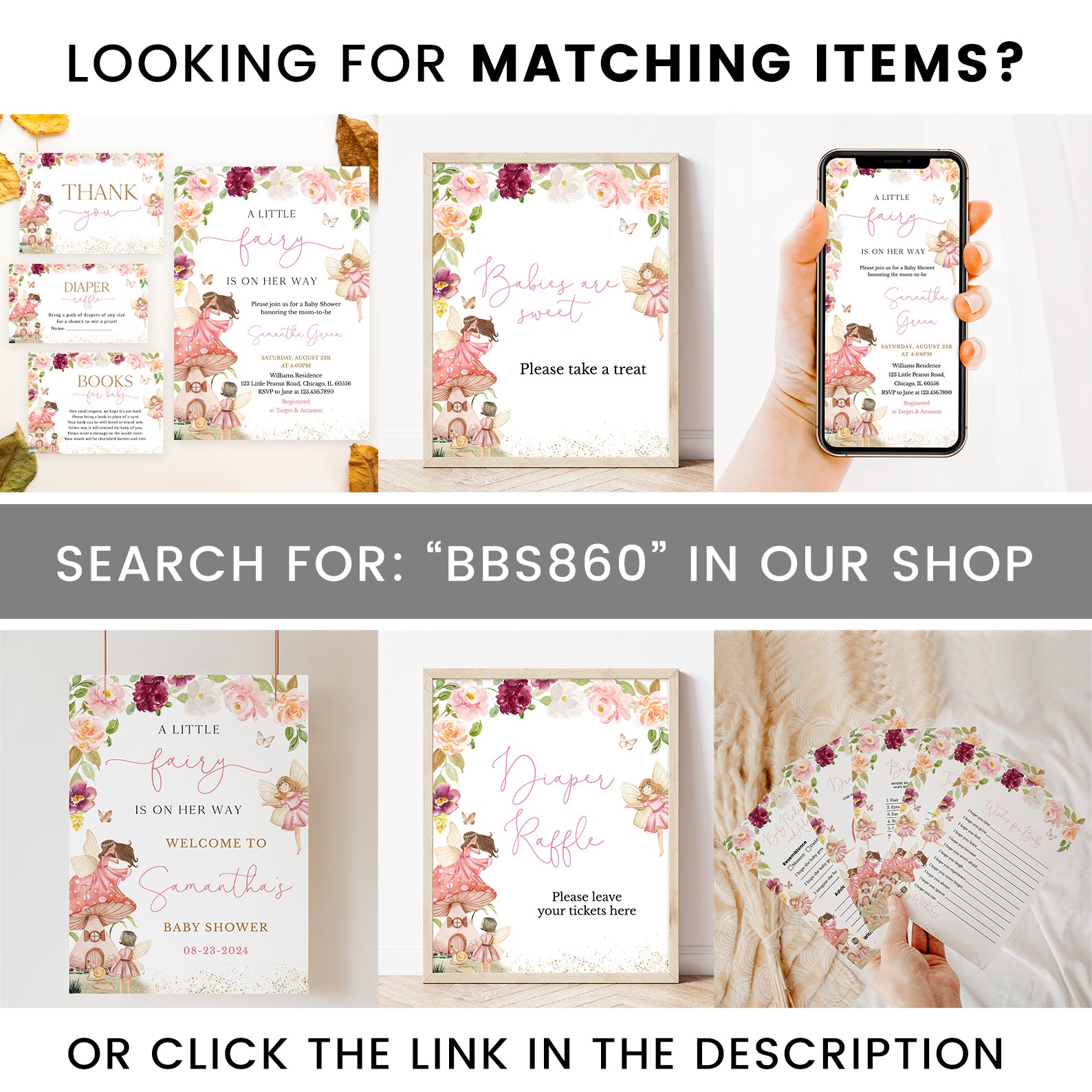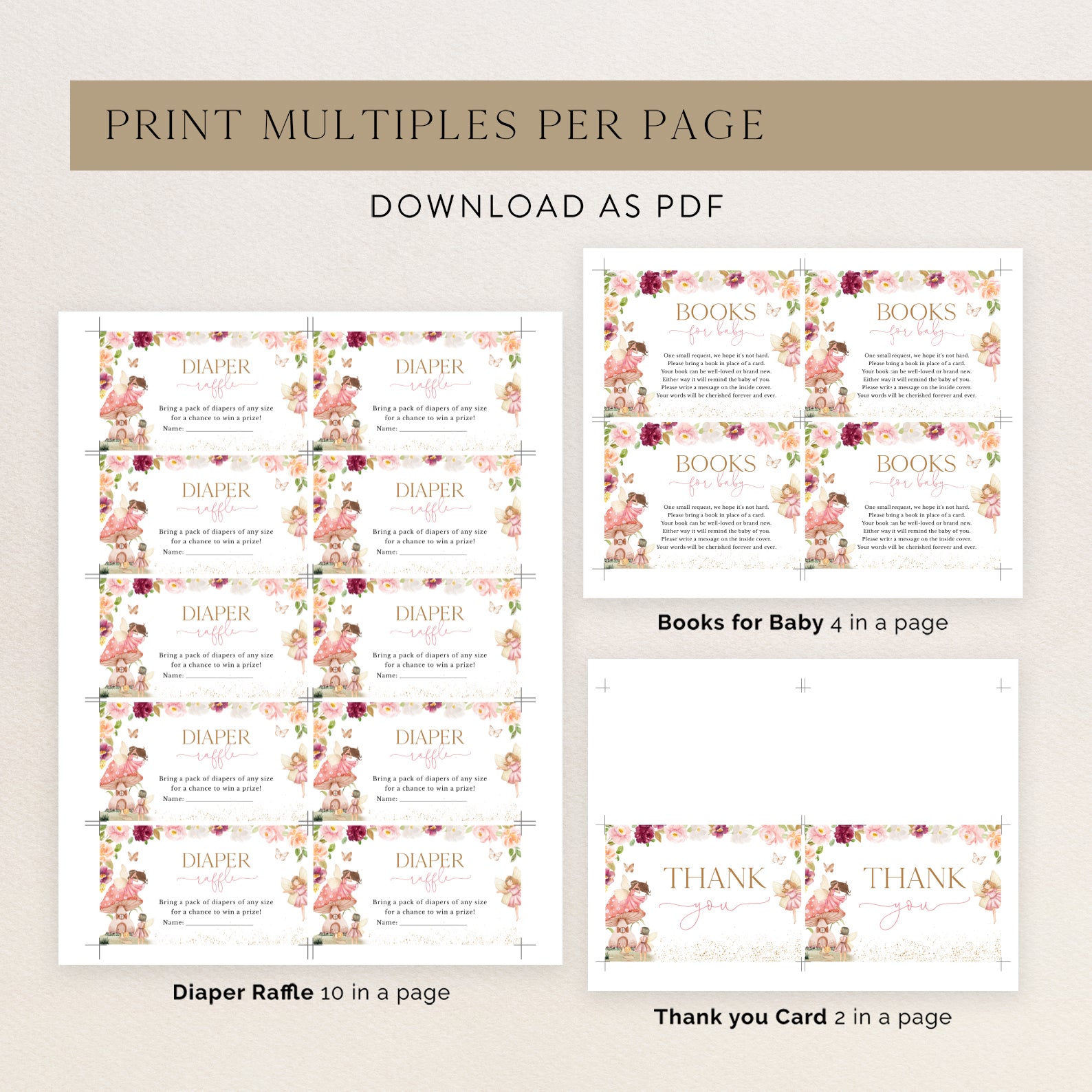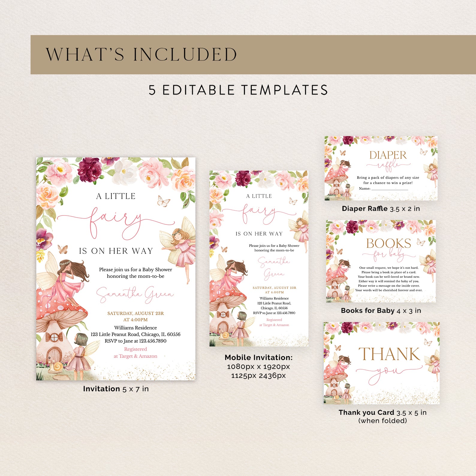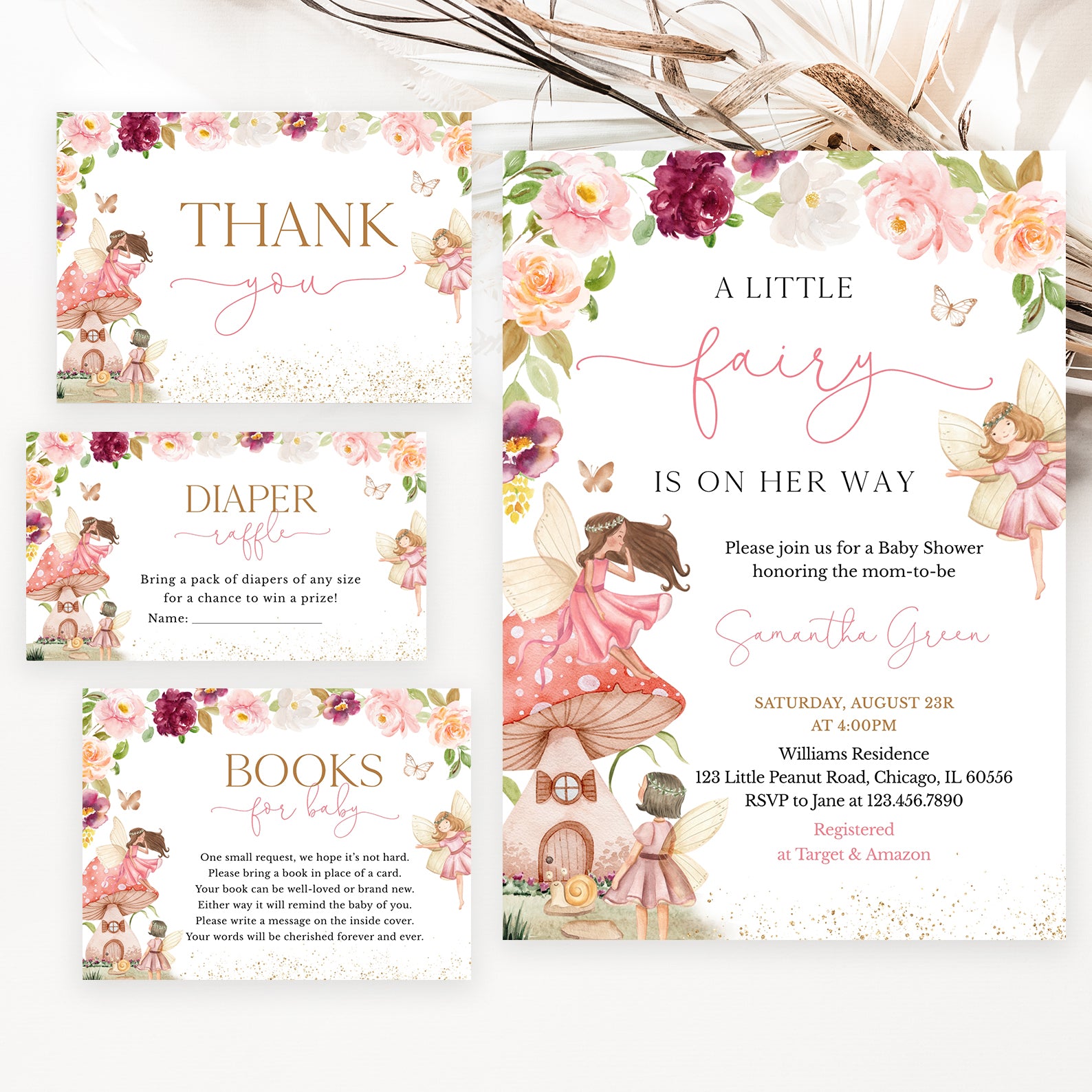Celebrate your little one's arrival with our Fairy Fall Baby Shower Bundle. This set includes an invitation, mobile invite, diaper raffle, books for baby card, and thank you card, all featuring whimsical fairies, watercolor flowers, and a red mushroom house. Perfect for a magical autumn gathering!