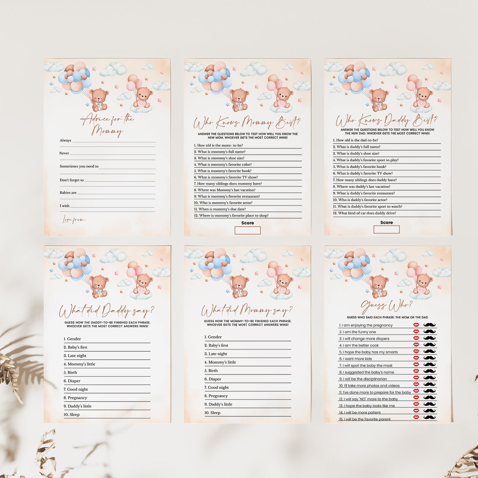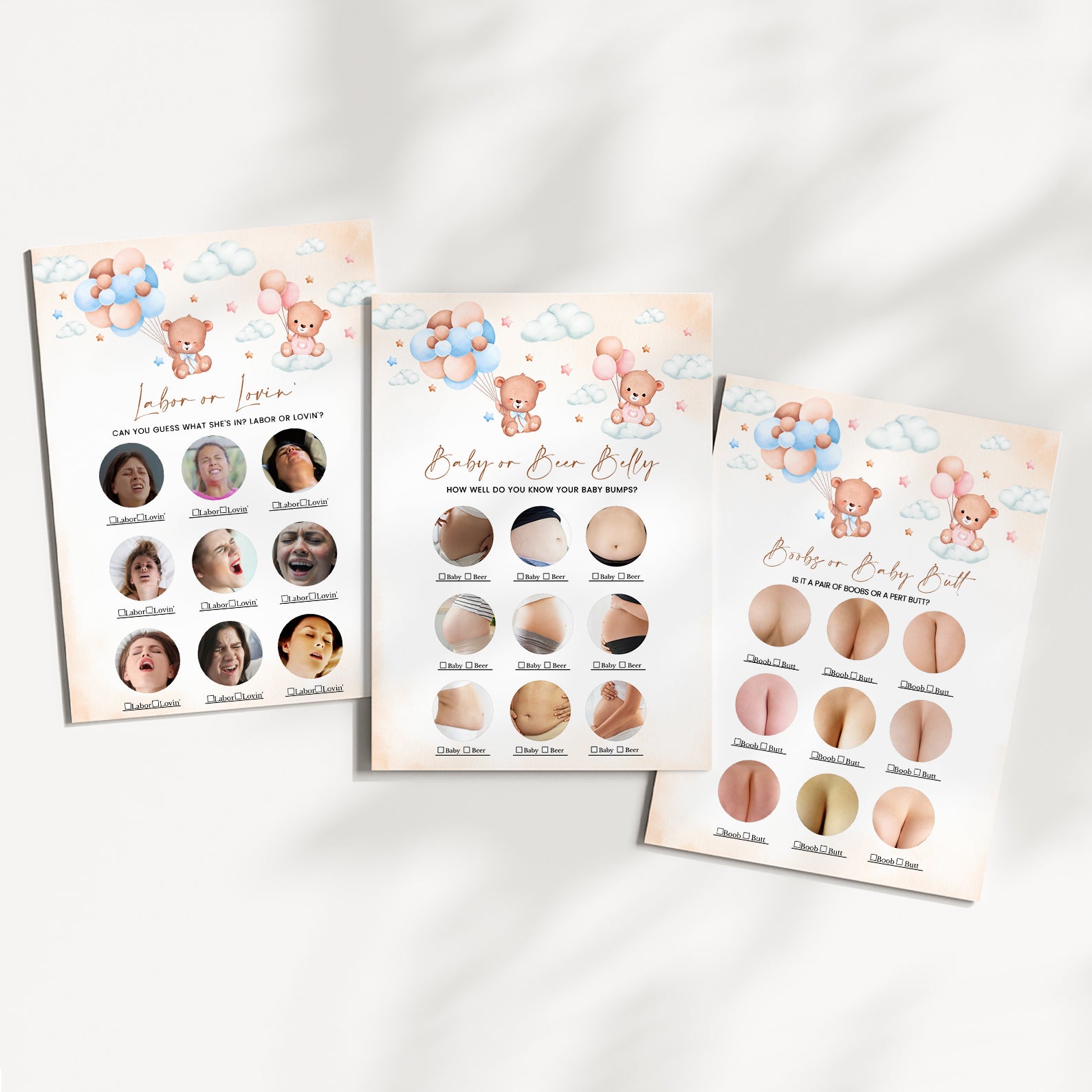 Pink & Blue Bear-Themed Gender Reveal Baby Shower Game Bundle