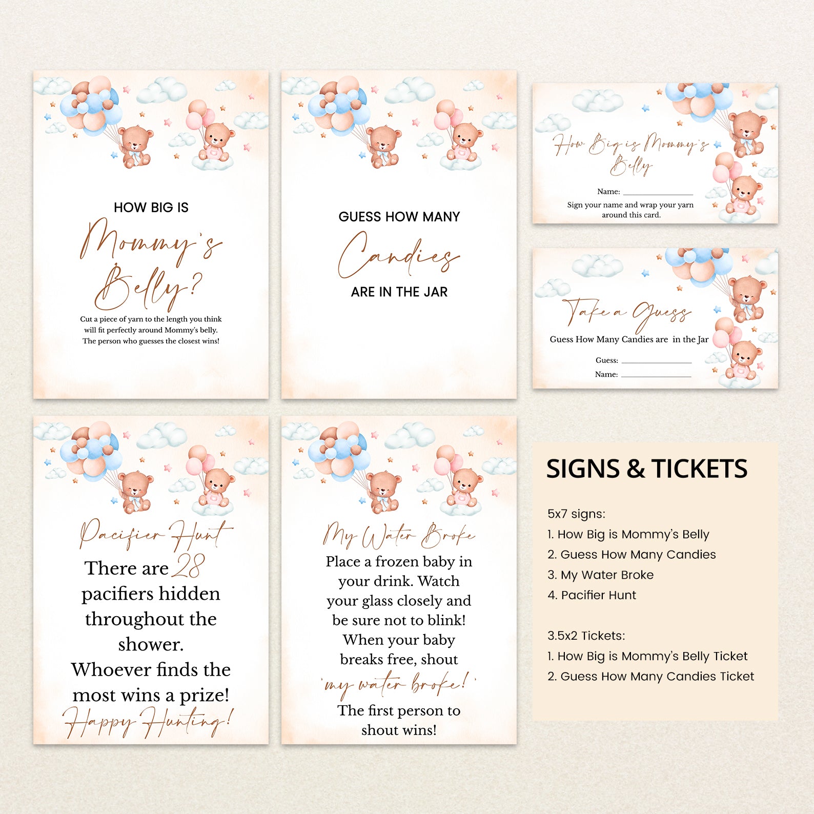 Celebrate your little one's upcoming arrival with our "We Can Bearly Wait" Baby Shower Game Bundle! This adorable bundle features 60 editable baby shower games, each designed to complement the whimsical charm of your "We Can Bearly Wait" invitation. With playful teddy bears, blue ribbons, and soft pink and blue accents, these games will add fun and excitement to your special day. Effortlessly customizable and easy to share, this game bundle ensures that your guests will enjoy every moment of your celebration, making your baby shower truly unforgettable!