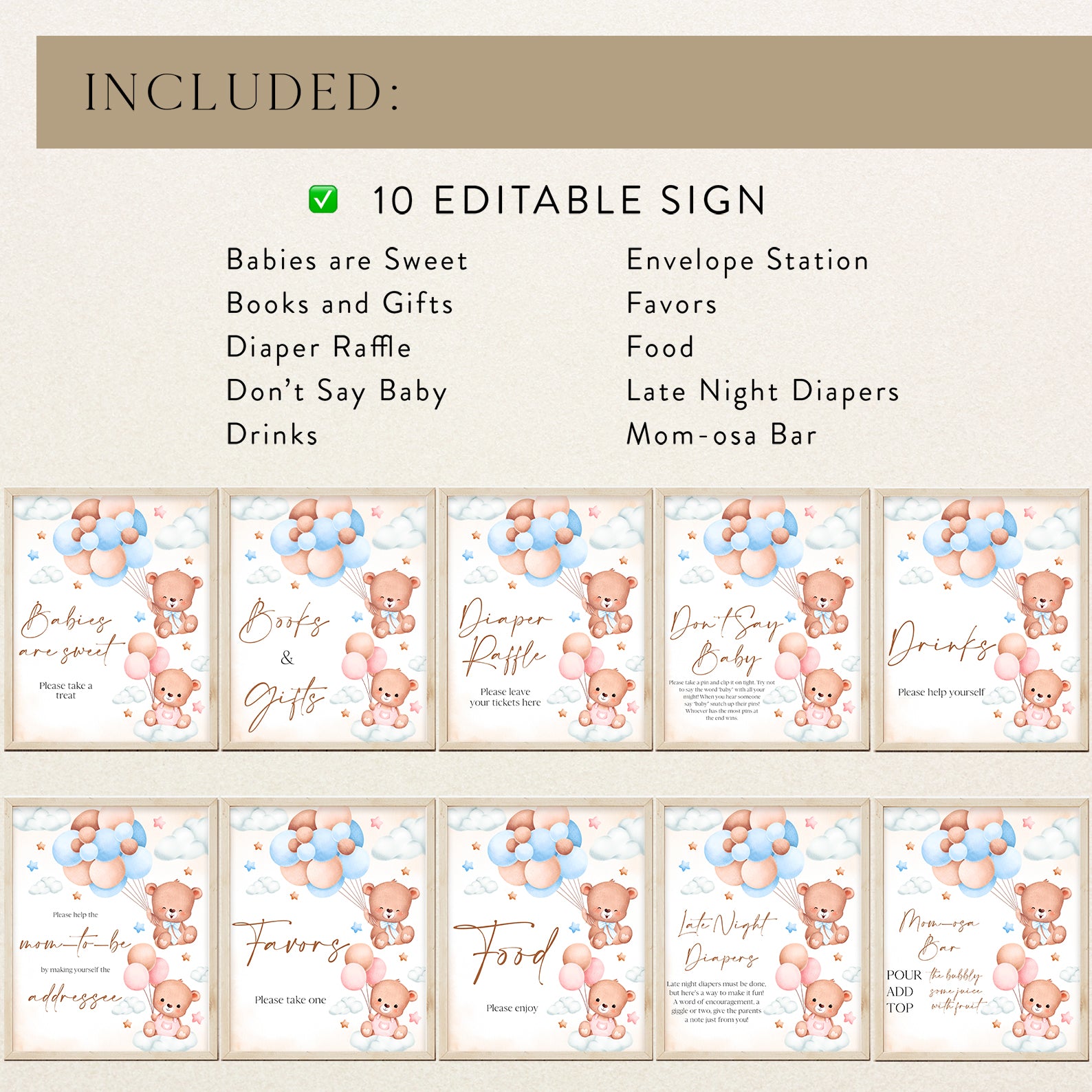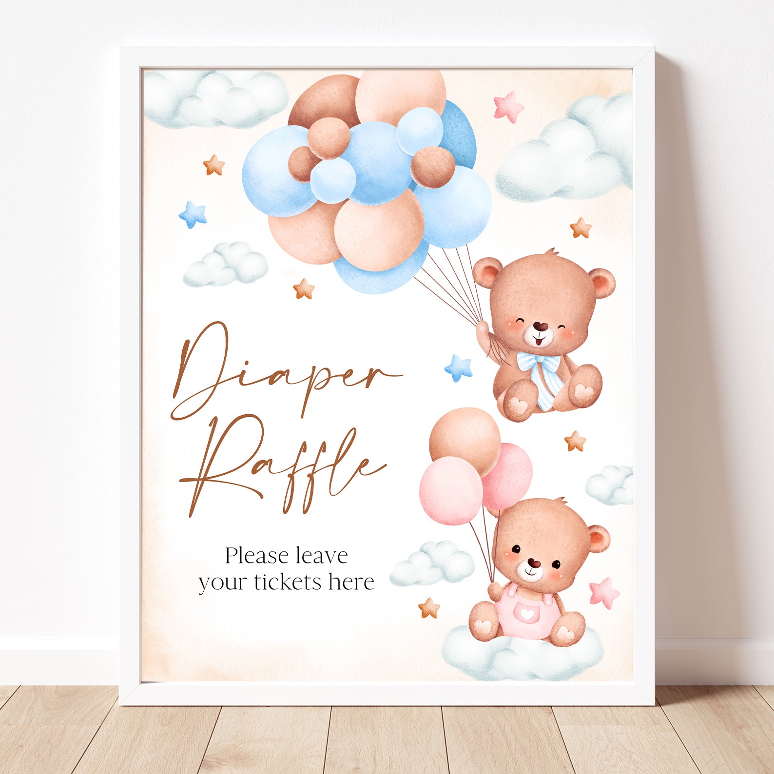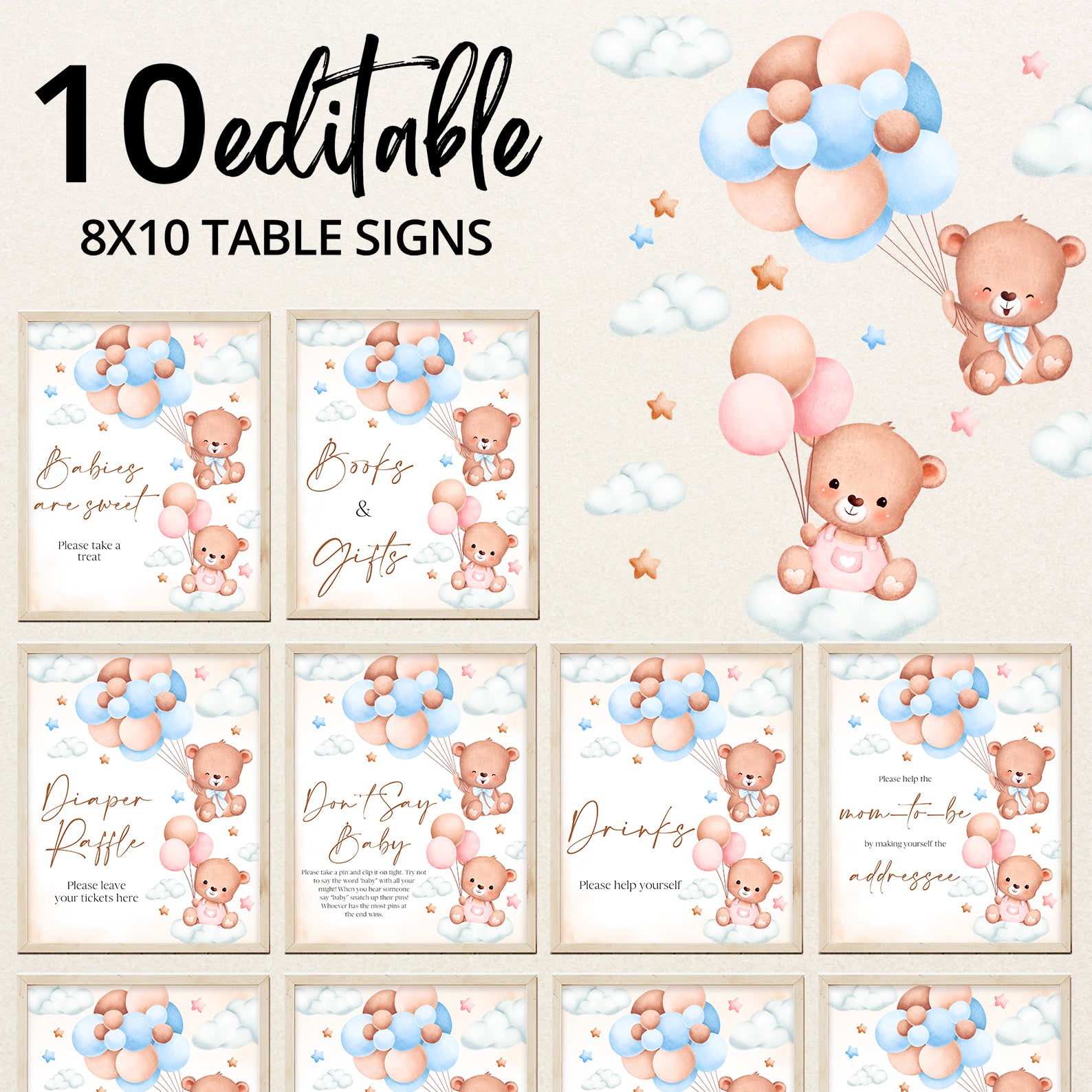 Add a sweet and whimsical touch to your baby shower with this adorable set of ten editable table signs! Featuring playful teddy bears, soft clouds, and twinkling stars in charming pink and blue accents, these signs perfectly complement your "We Can Bearly Wait" gender reveal theme. The set includes: Babies Are Sweet, Books and Gifts, Diaper Raffle, Don't Say Baby, Drinks, Envelope Station, Favors, Food, Late Night Diapers, and Mom-osa Bar signs—ideal for adding both style and organization to your celebration!