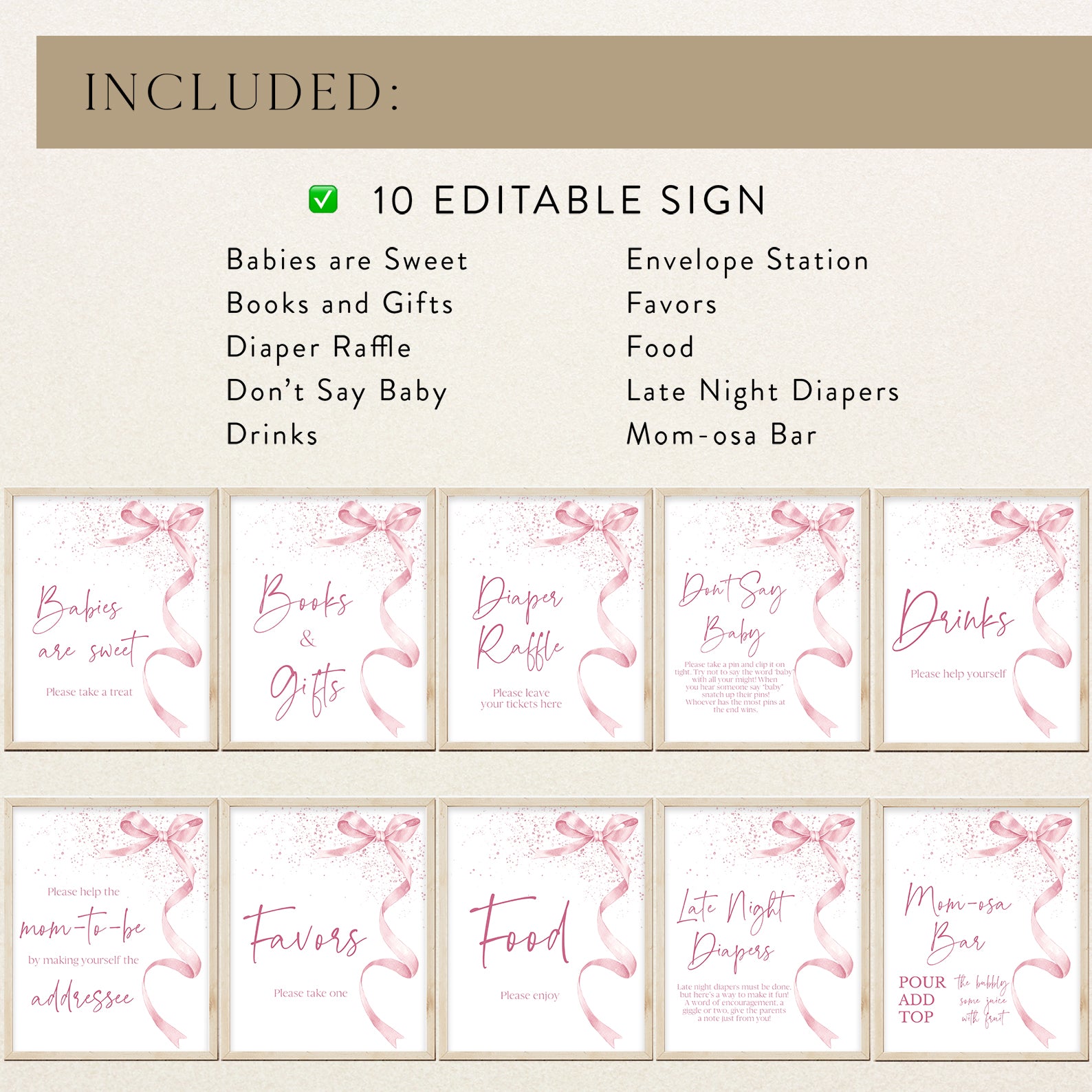 Add a touch of elegance to your baby shower with this charming set of ten editable pink-themed table signs! Featuring a minimalist design with soft pink accents and a delicate ribbon on the right side, these signs are perfect for creating a cohesive and stylish look. The set includes: Babies Are Sweet, Books and Gifts, Diaper Raffle, Don't Say Baby, Drinks, Envelope Station, Favors, Food, Late Night Diapers, and Mom-osa Bar signs—ideal for adding a graceful and organized touch to your celebration!
