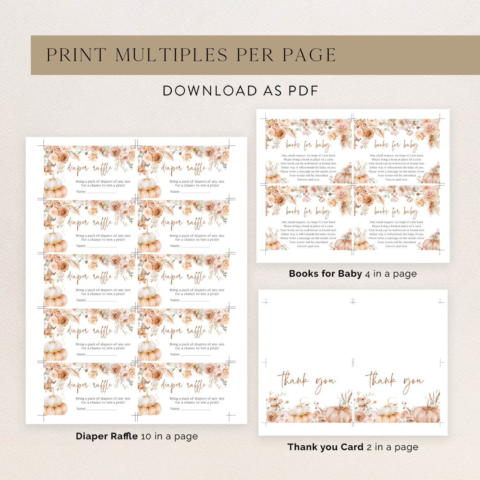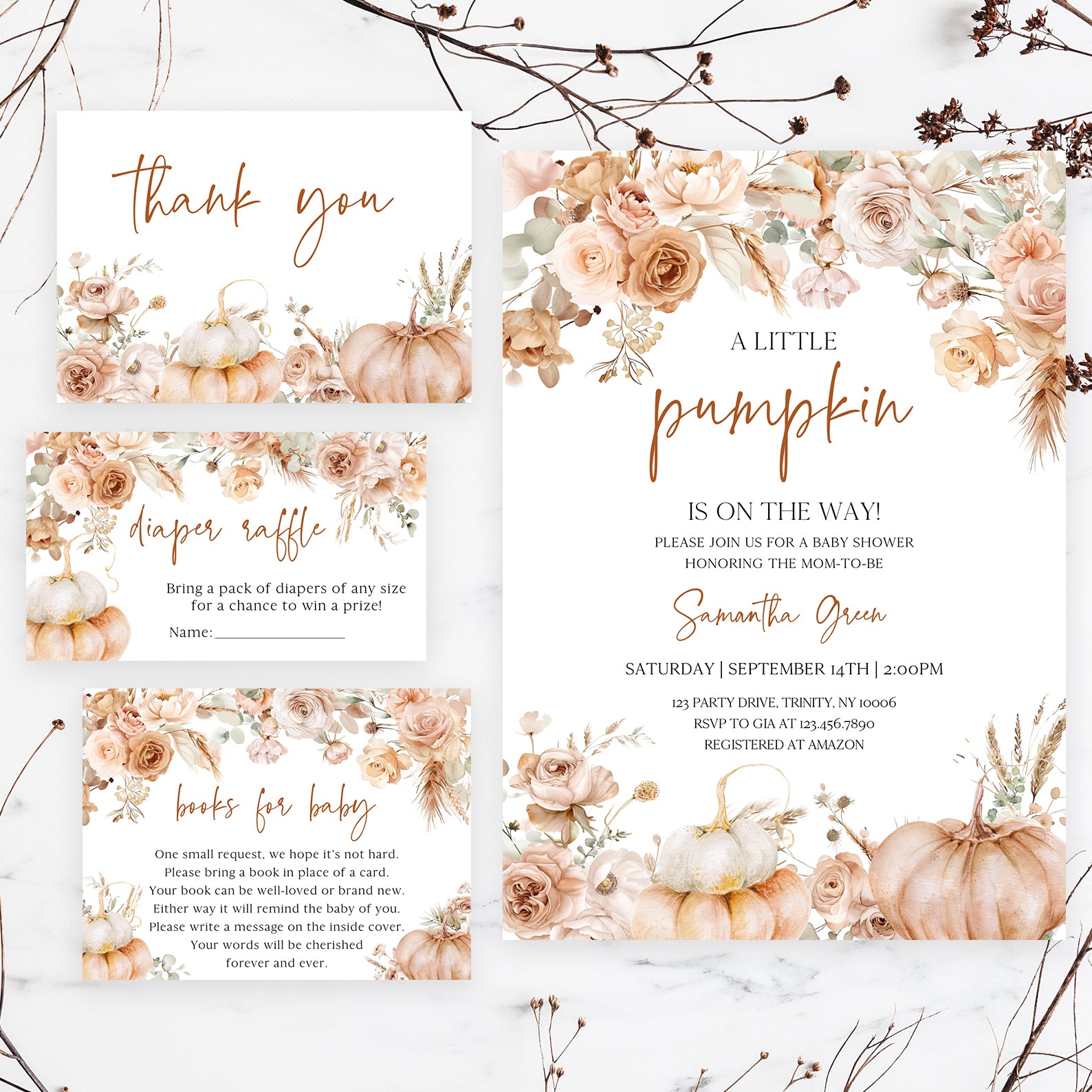 Celebrate your little one with our 'A Little Pumpkin is on the Way' Fall Baby Shower Bundle. This set includes an invitation, mobile invite, diaper raffle, books for baby card, and thank you card, all featuring a charming design with watercolor autumn flowers and pumpkins. Perfect for a cozy autumn gathering!