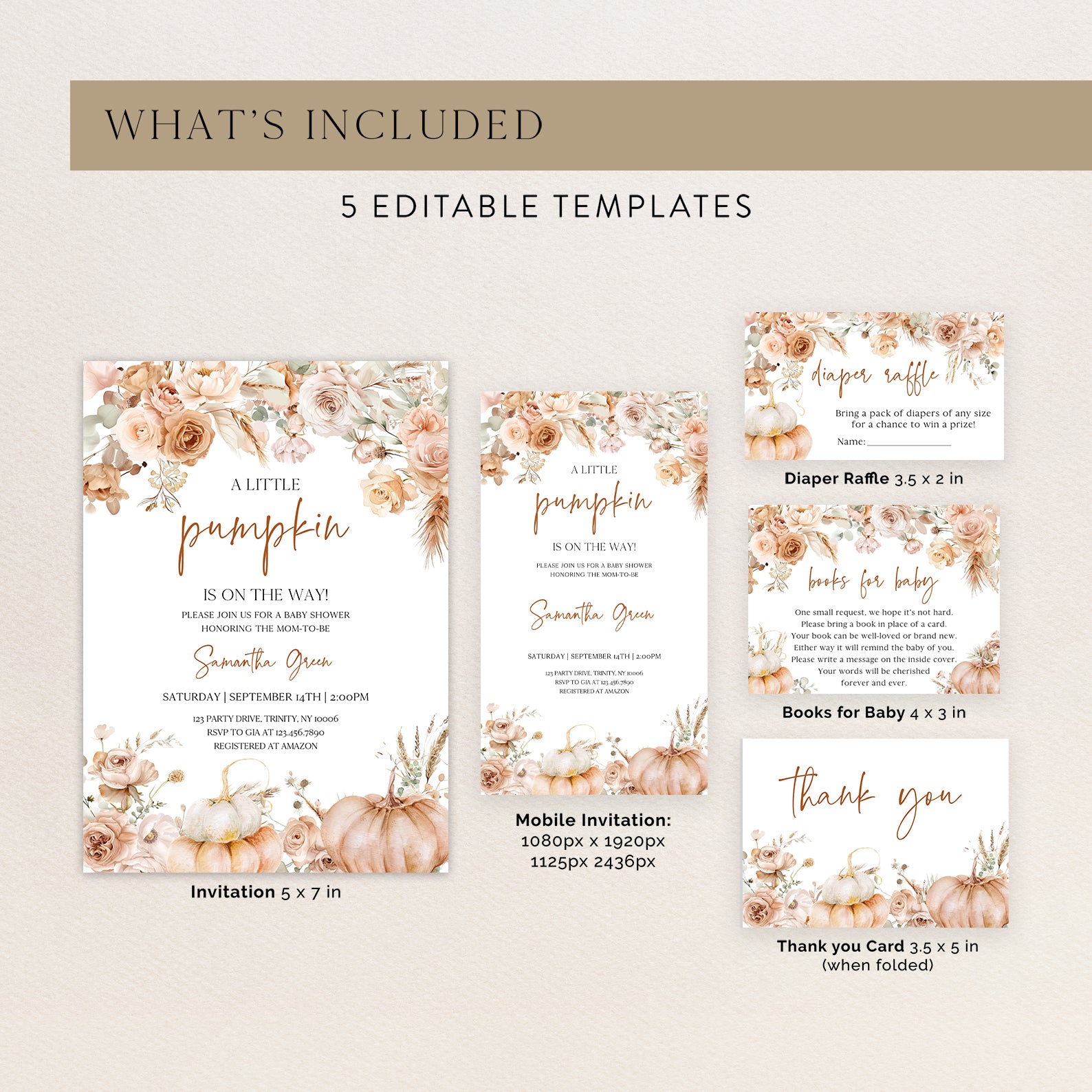 - Purchase this Pumpkin Fall Baby Shower Invite Bundle with Rust & Peach Floral Design template