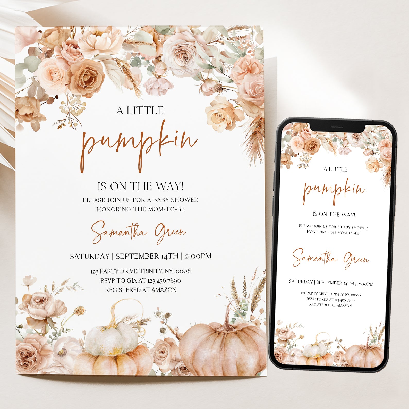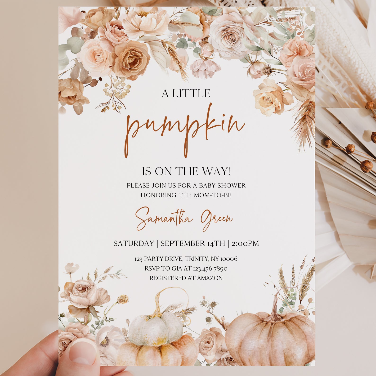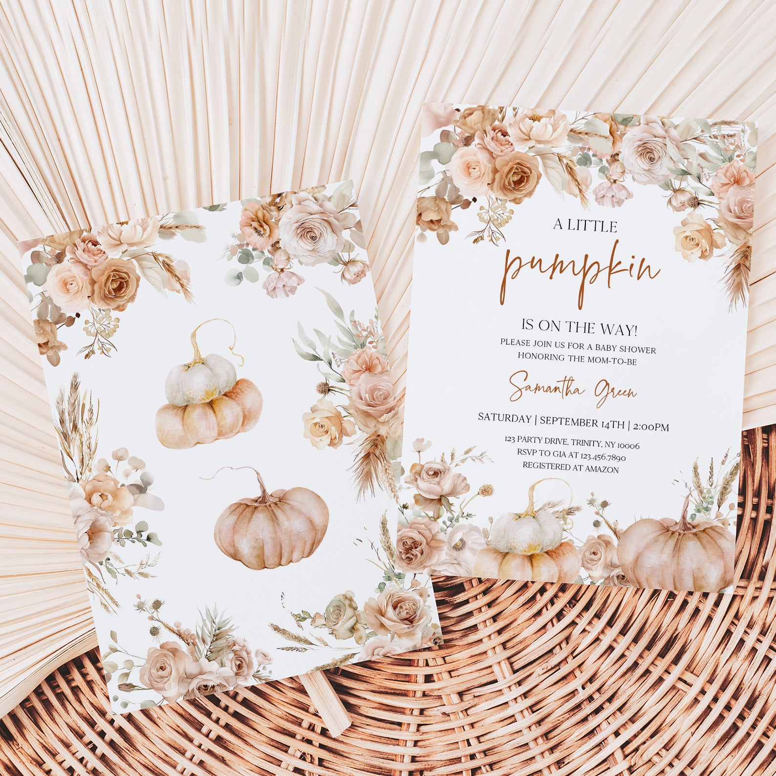 - Purchase this Pumpkin Fall Baby Shower Invite with Rust & Peach Floral Design template