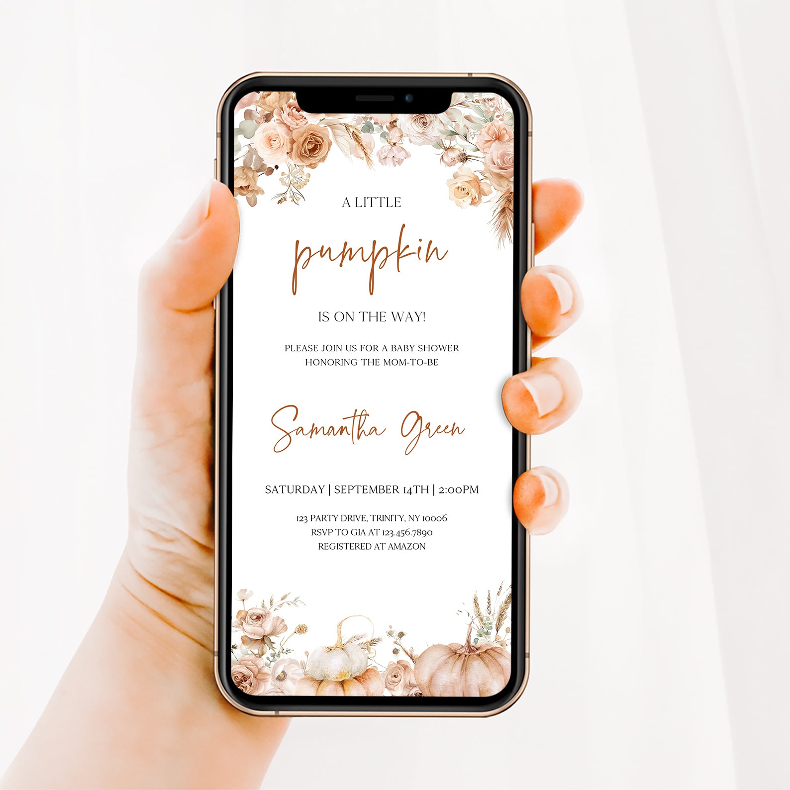 Announce the arrival of your little one with our charming fall baby shower digital invitation, featuring the delightful 'A Little Pumpkin is on the Way' theme. This delightful design showcases a beautiful border of watercolor autumn flowers in soft peach, rusty brown, and light pink, perfectly framing the joyful announcement. At the bottom, a whimsical arrangement of pumpkins and florals adds a festive touch, making it the ideal choice for your cozy autumn gathering. Invite your loved ones to share in the joy of this special occasion with a touch of seasonal elegance!