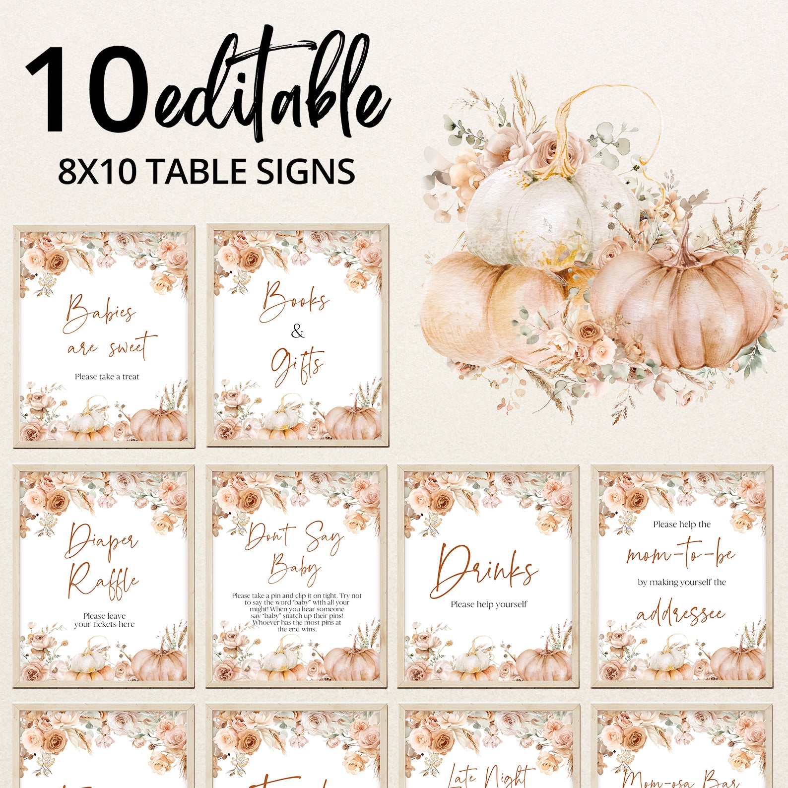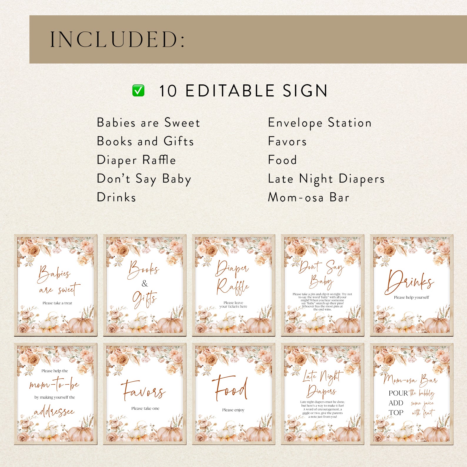 Welcome your guests with a set of ten editable fall-themed table signs, perfectly complementing the "A Little Pumpkin is on the Way" baby shower. Each sign features warm watercolor autumn florals in soft peach, rusty brown, and gentle pink hues, accented by playful pumpkins and seasonal greenery. Designed to add charm and clarity from "Babies Are Sweet" to "Mom-osa Bar" these signs bring cozy elegance and festive spirit to your celebration.