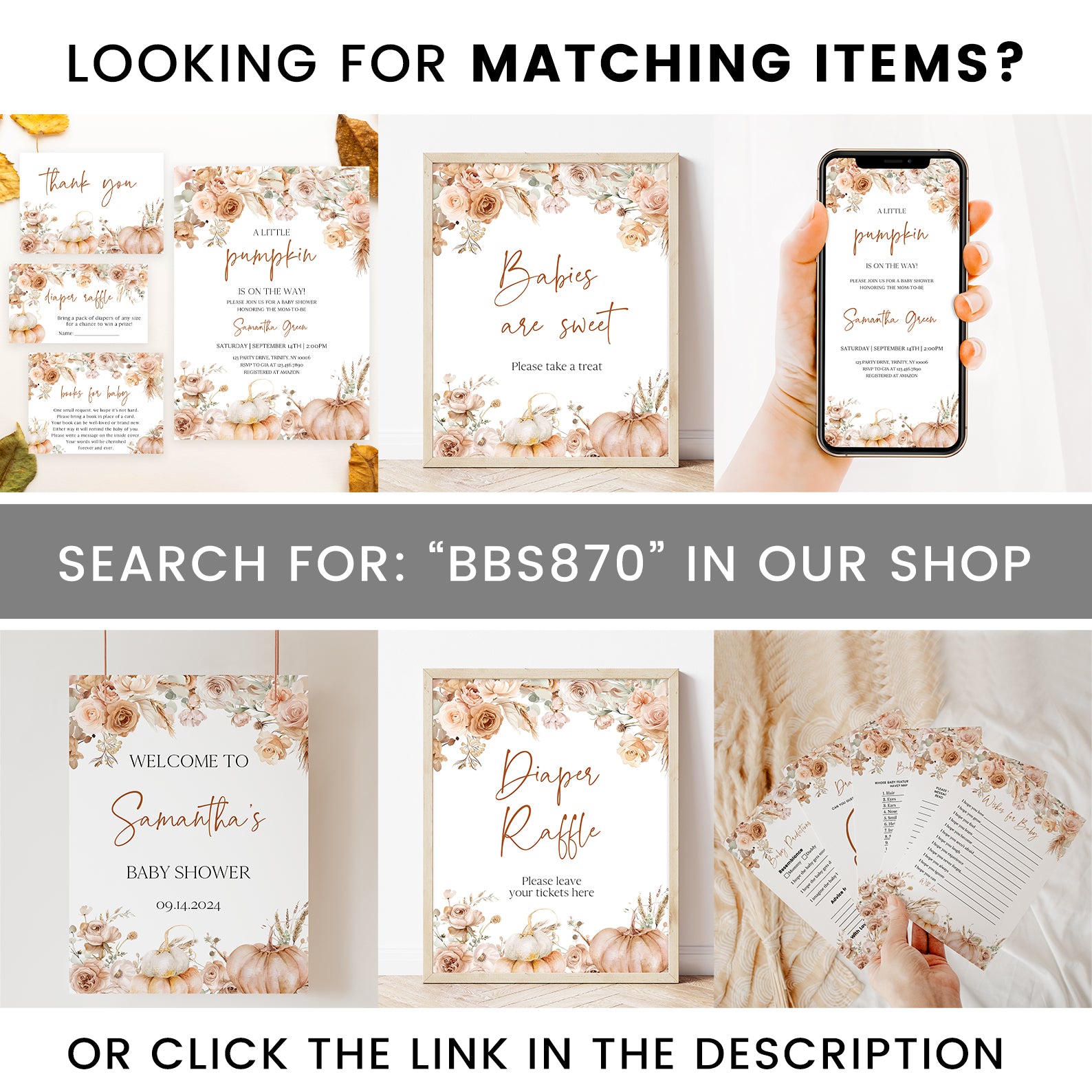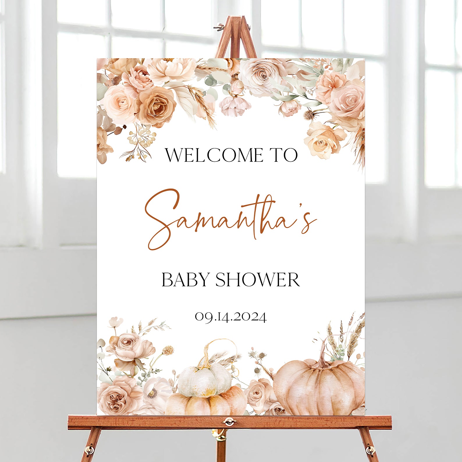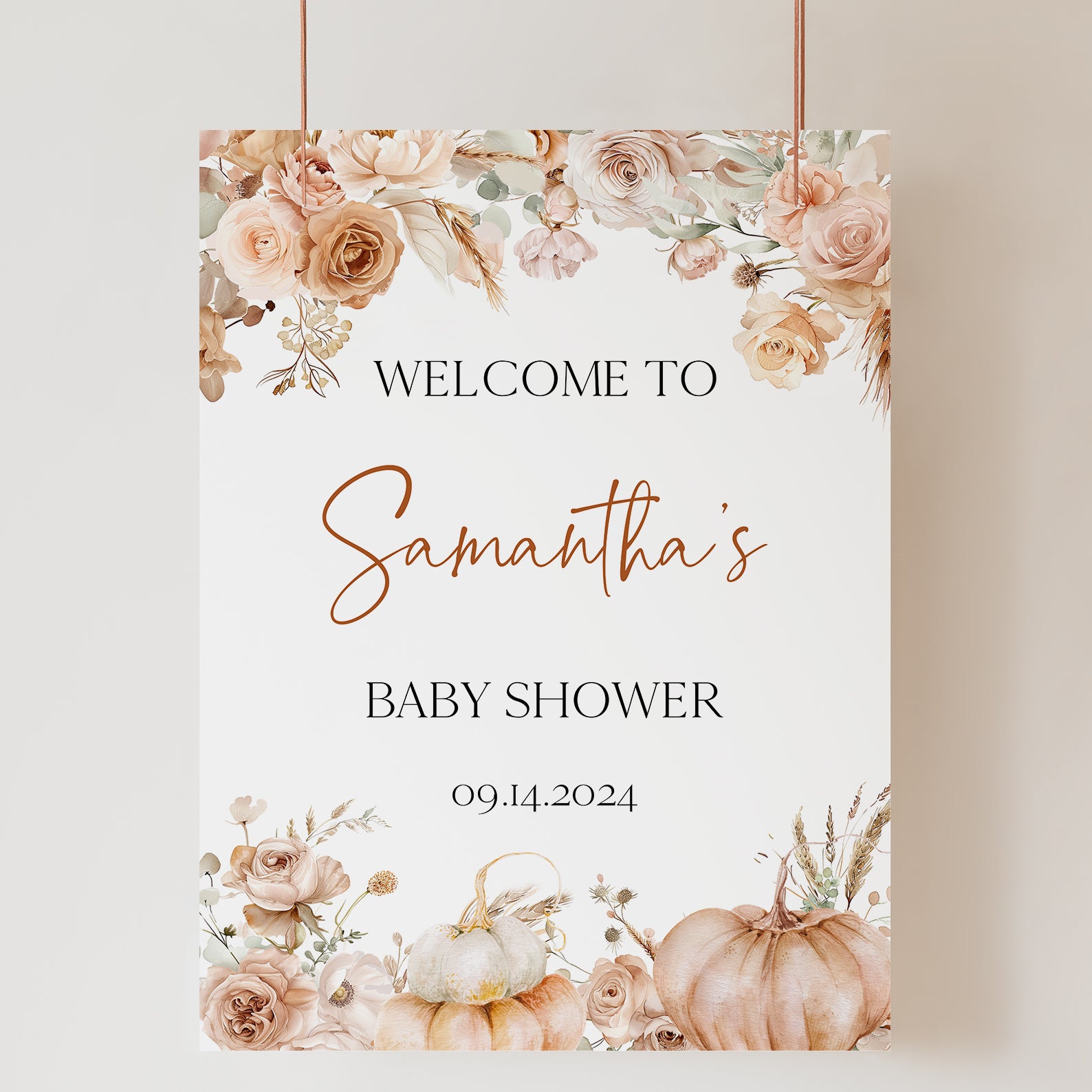 - Purchase this Pumpkin Fall Baby Shower Welcome Sign with Rust & Peach Floral Design template