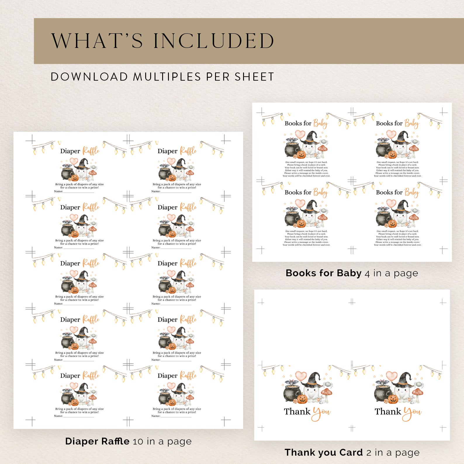Prepare to welcome your little boo with a spook-tacular Halloween baby shower bundle! This all-in-one set includes everything you need to throw a memorable celebration: a charming invitation, a mobile invitation for on-the-go guests, a fun diaper raffle, a “Books for Baby” card to encourage thoughtful gifts, and a sweet thank you card to show your gratitude. Each item features adorable ghost illustrations and a festive color palette of orange and black, perfect for capturing the spirit of the spooky season. The high-quality, ready-to-print designs are customizable to include all the important details of your event. Whether you're hosting a Halloween-themed gathering, a costume party, or simply celebrating the new arrival, this bundle ensures a cohesive and festive look that will delight your guests and create lasting memories. Get ready for a boo-tiful baby shower with this enchanting and complete invitation package!