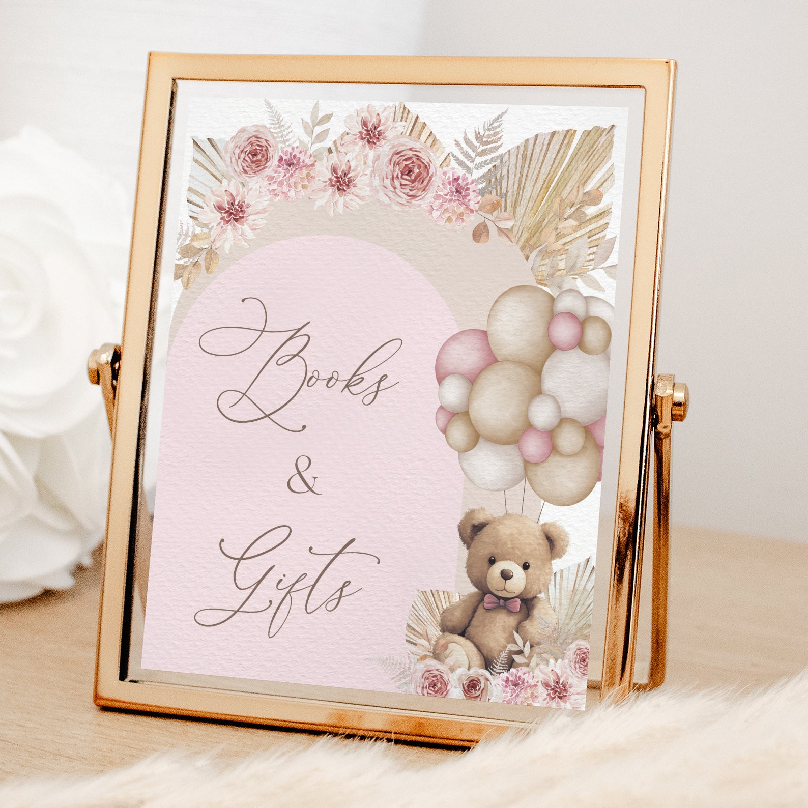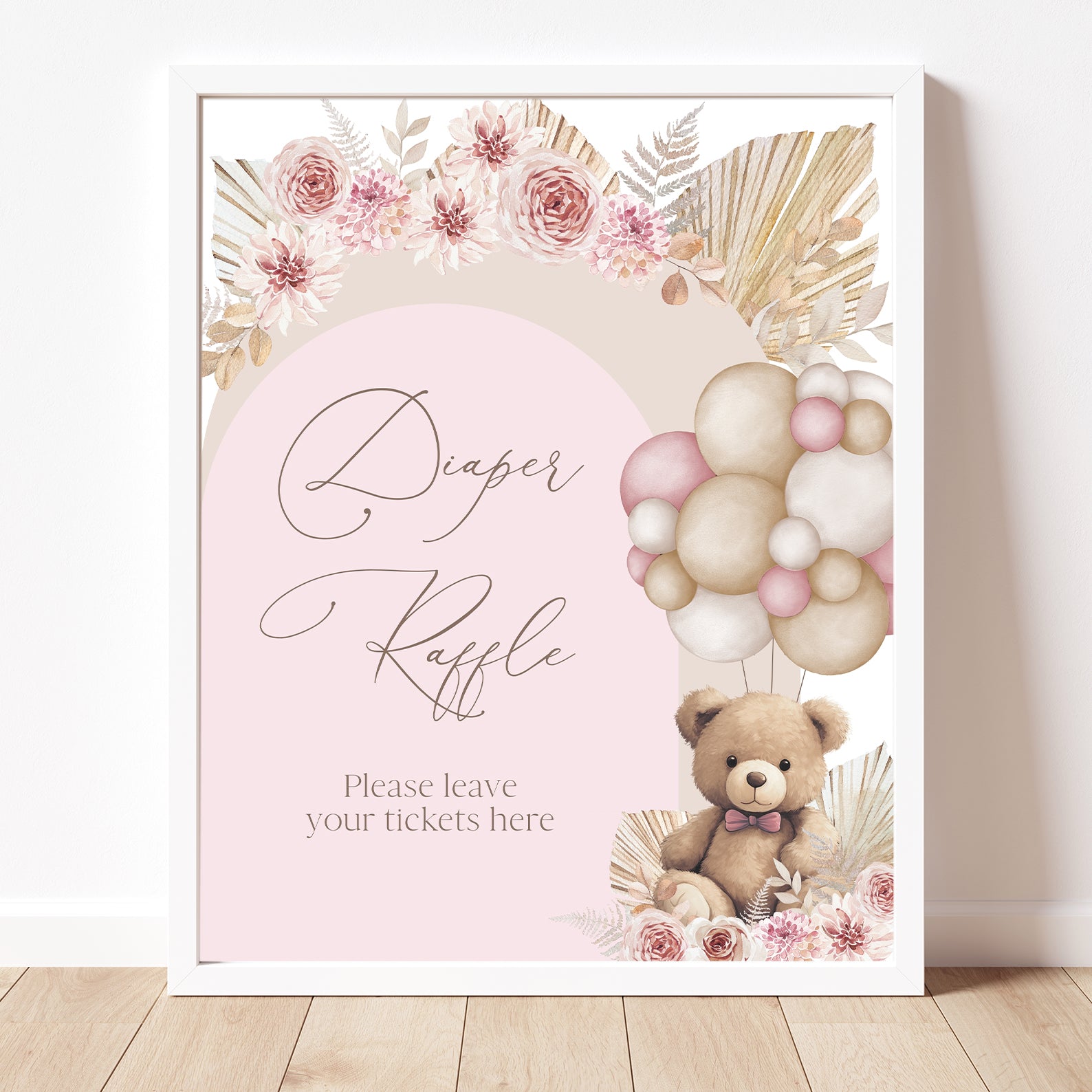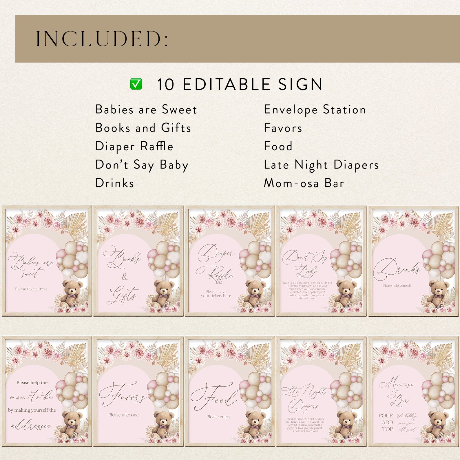 Add a playful touch to your baby shower with this charming "We Can Bearly Wait" table sign set! Featuring a pink-themed design with a whimsical brown arch, boho palm leaves, pink florals, and an adorable teddy bear, this set of ten editable signs is perfect for your celebration. Includes Babies Are Sweet, Books and Gifts, Diaper Raffle, Don’t Say Baby, Drinks, Envelope Station, Favors, Food, Late Night Diapers, and Mom-osa Bar.