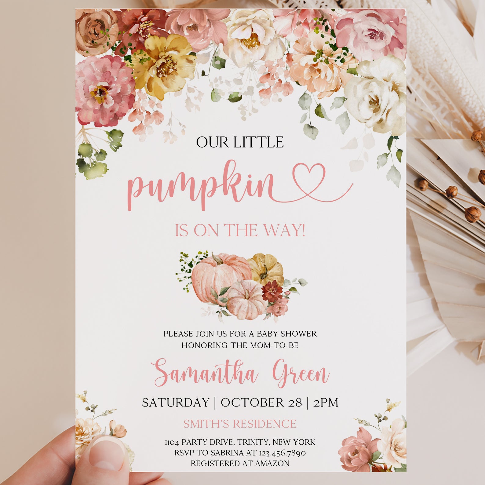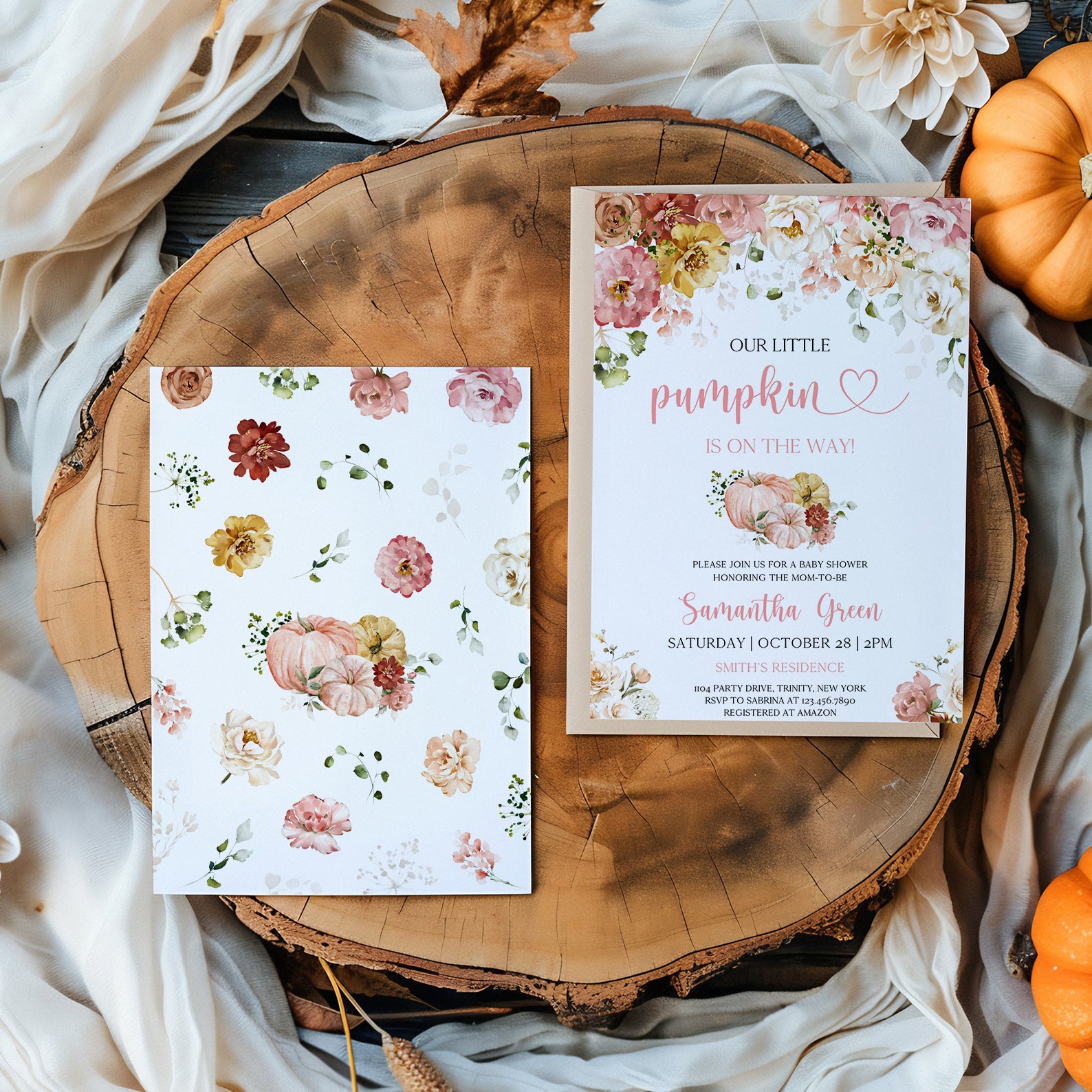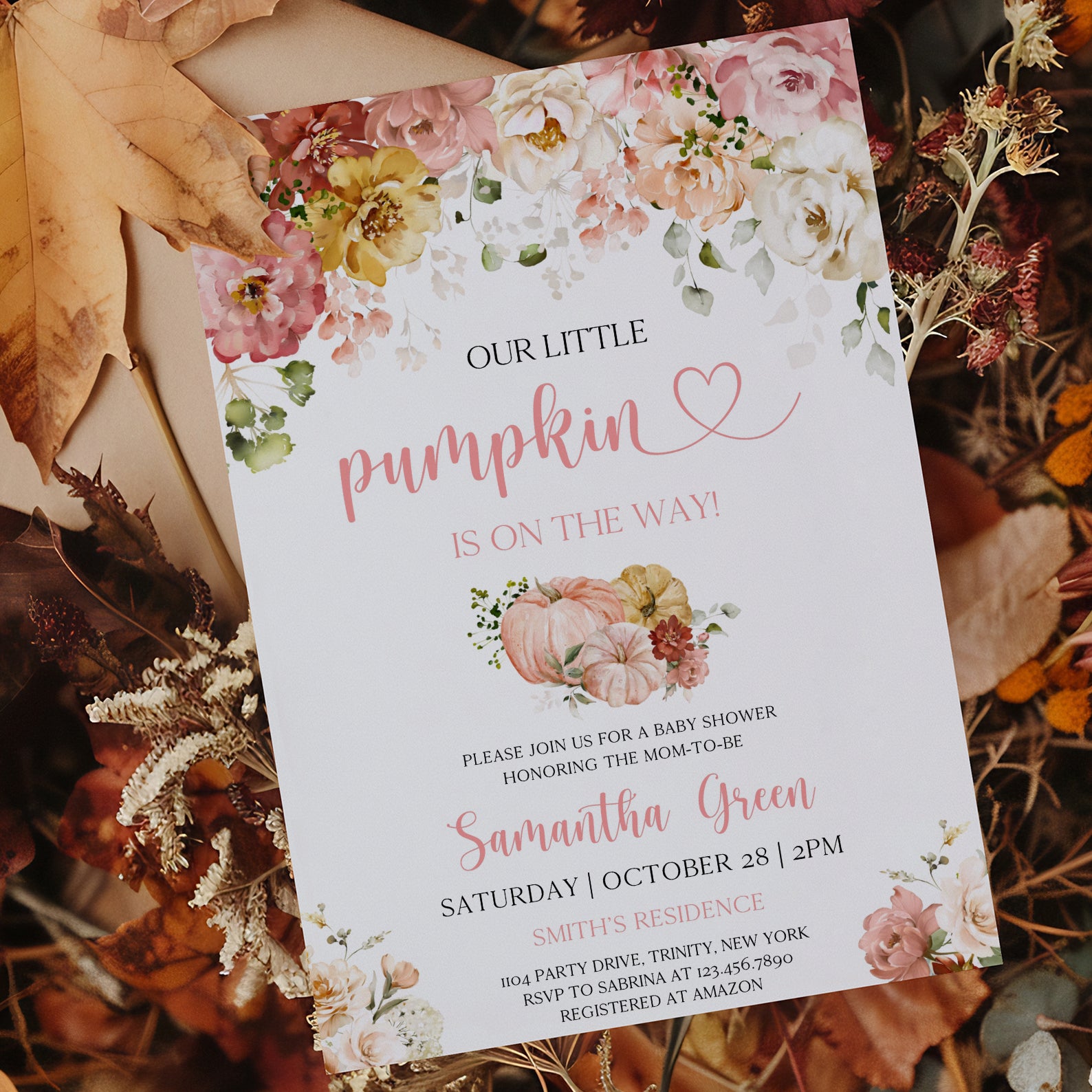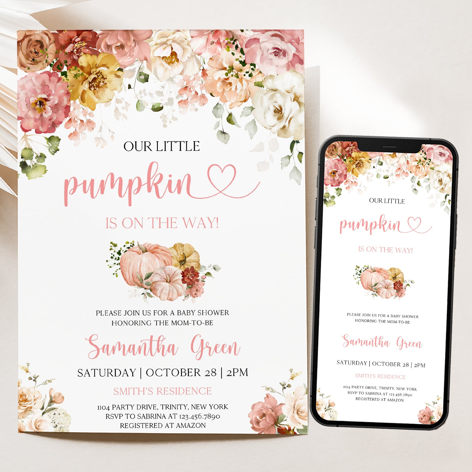 - Purchase this Fall Baby Shower Digital Invite: Blush Floral & Pumpkin template