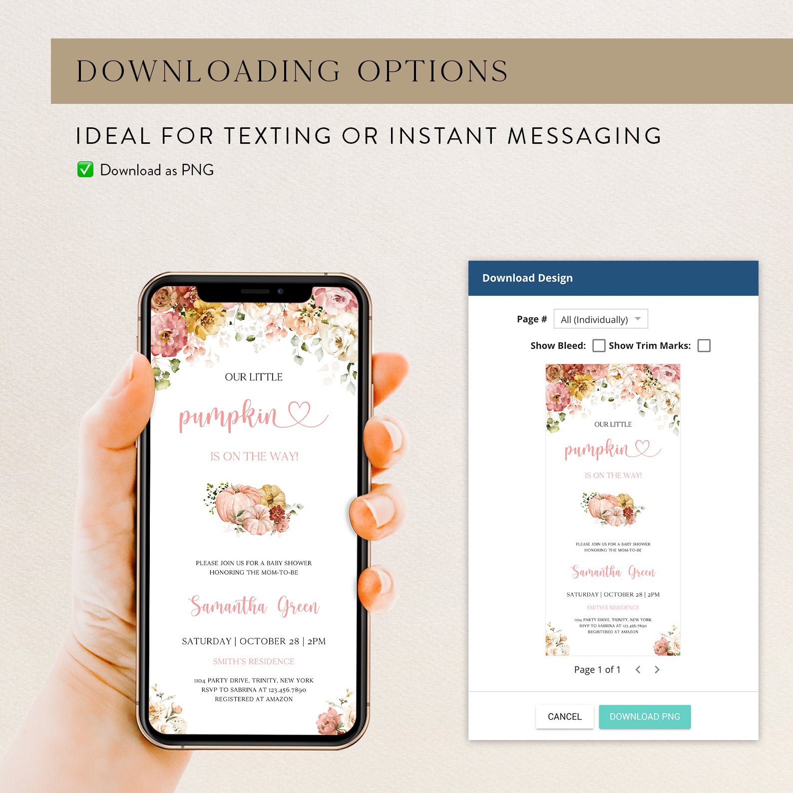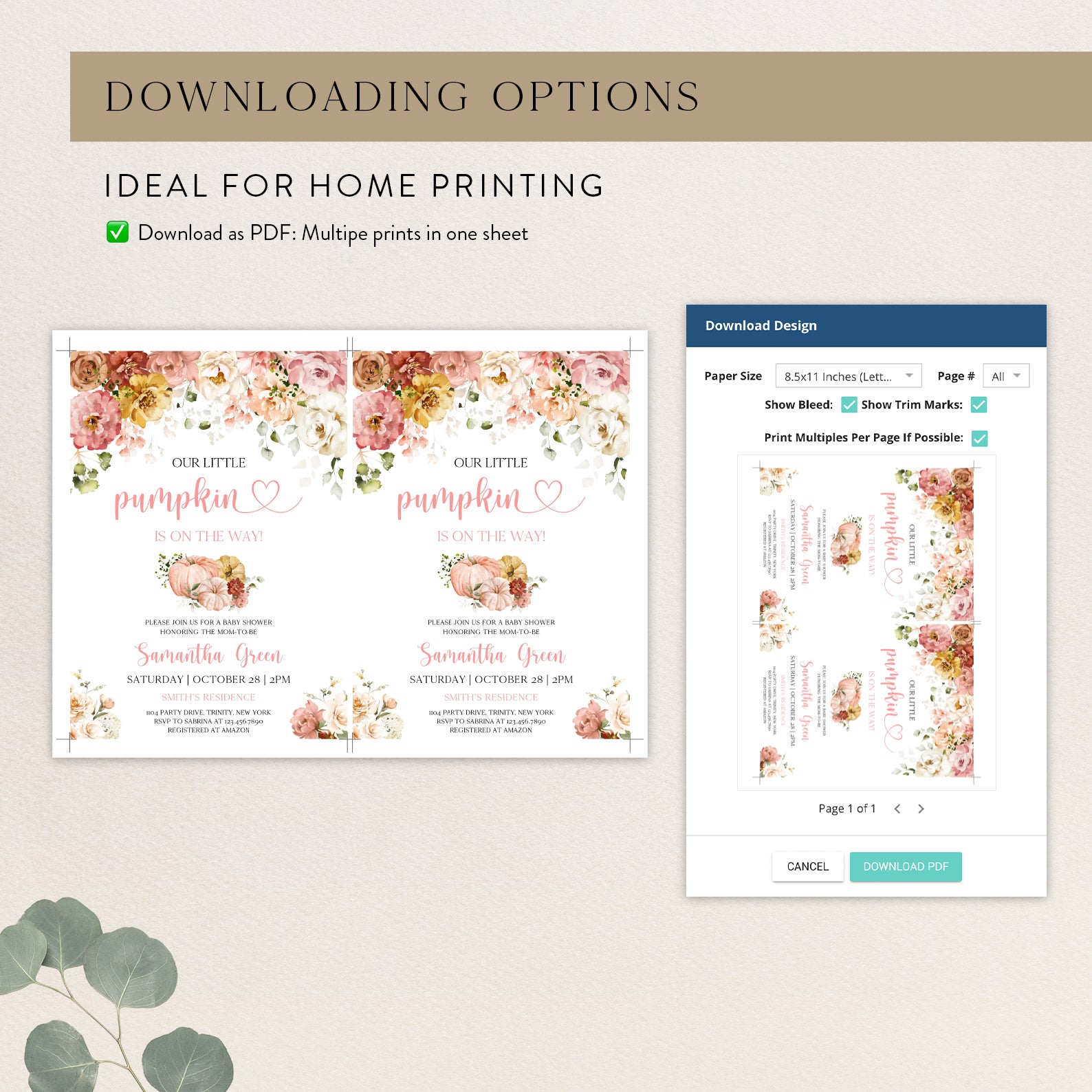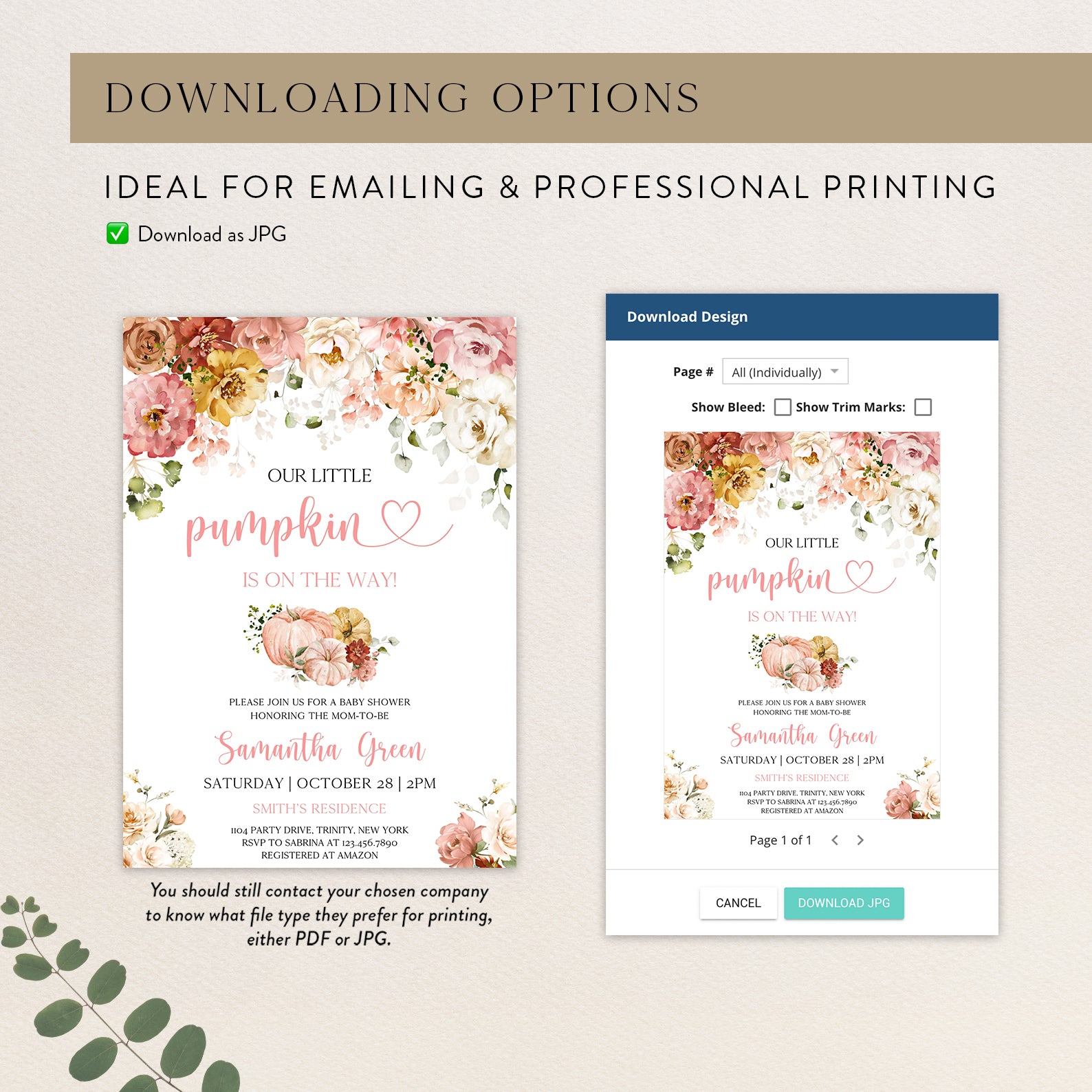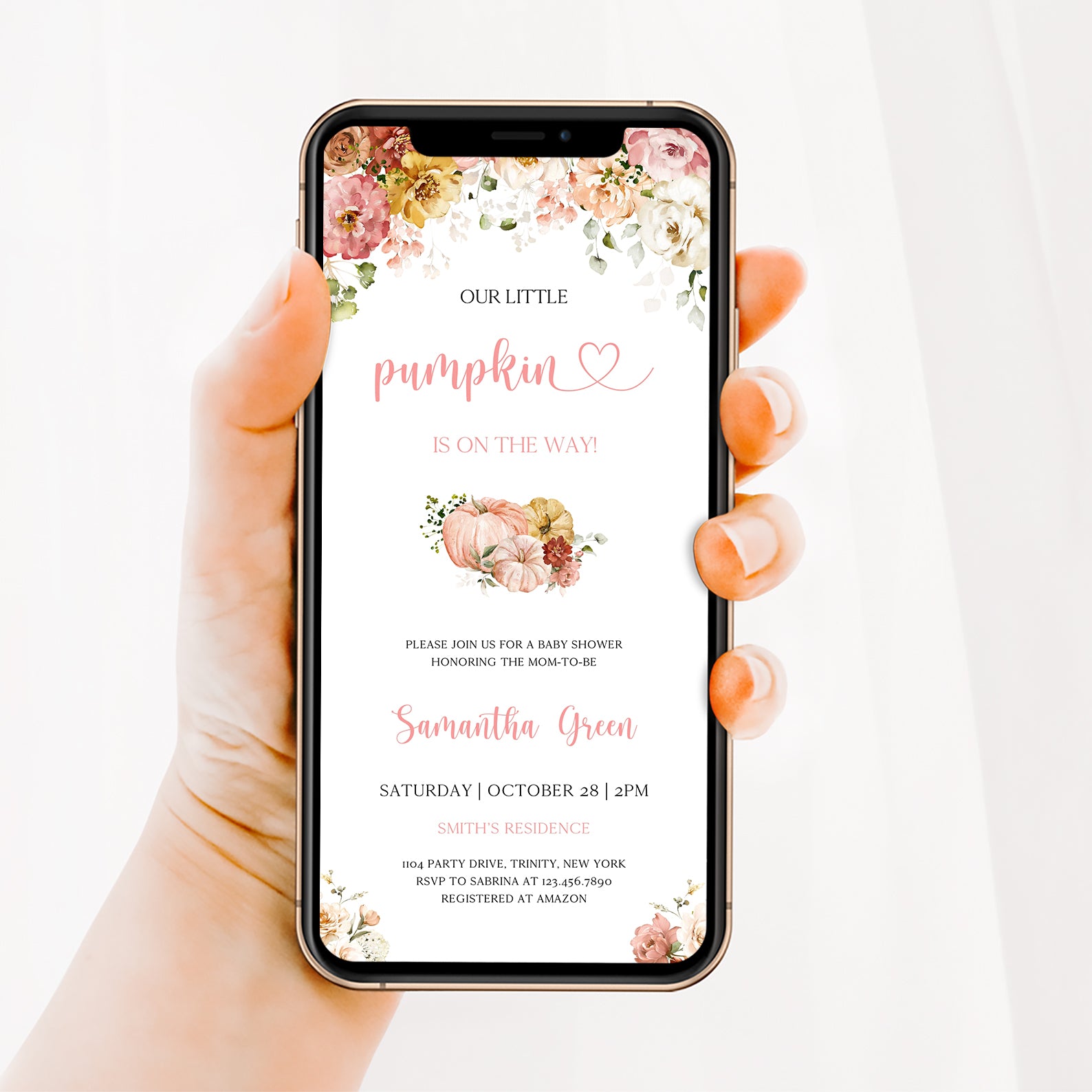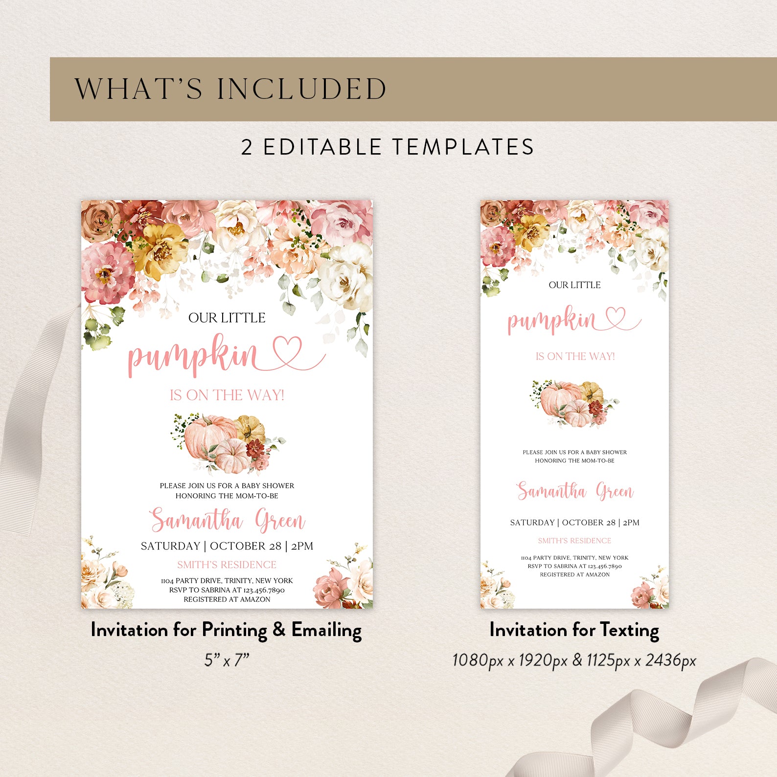 - Purchase this Fall Baby Shower Digital Invite: Blush Floral & Pumpkin template