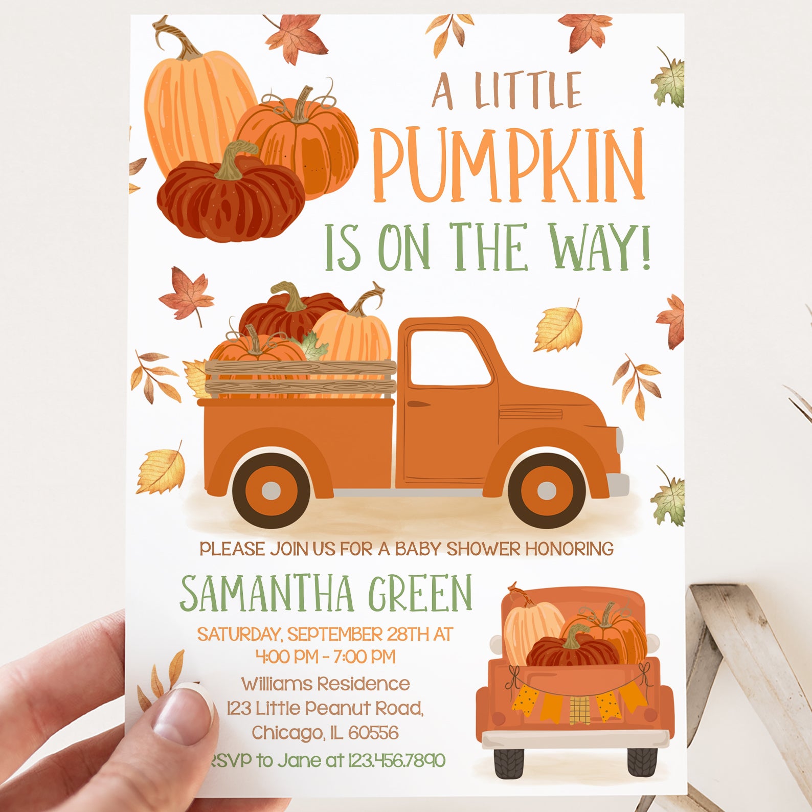 - Purchase this Fall Baby Shower Invite with Orange Truck & Pumpkins template