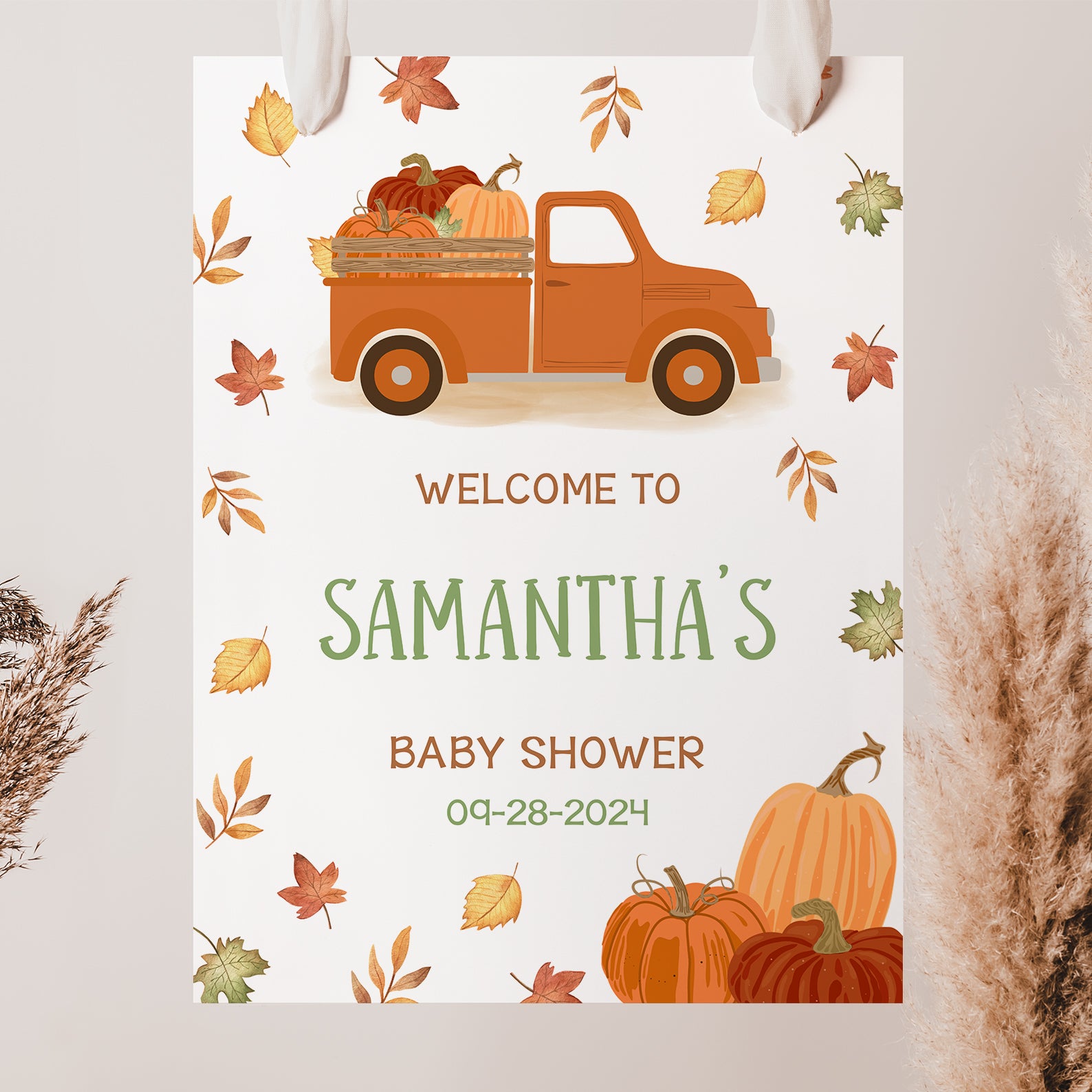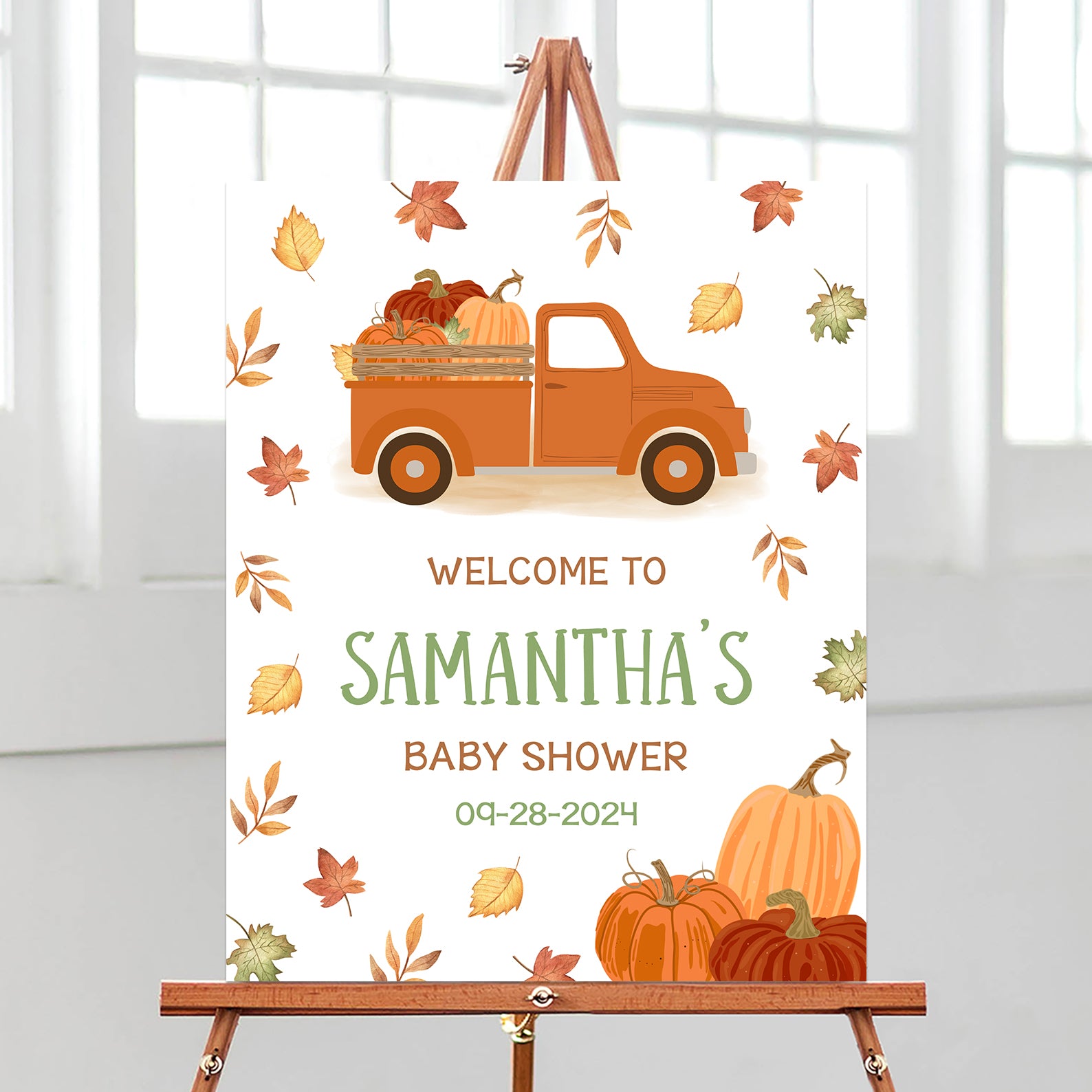 - Purchase this Fall Baby Shower Welcome Sign with Orange Truck & Pumpkins template