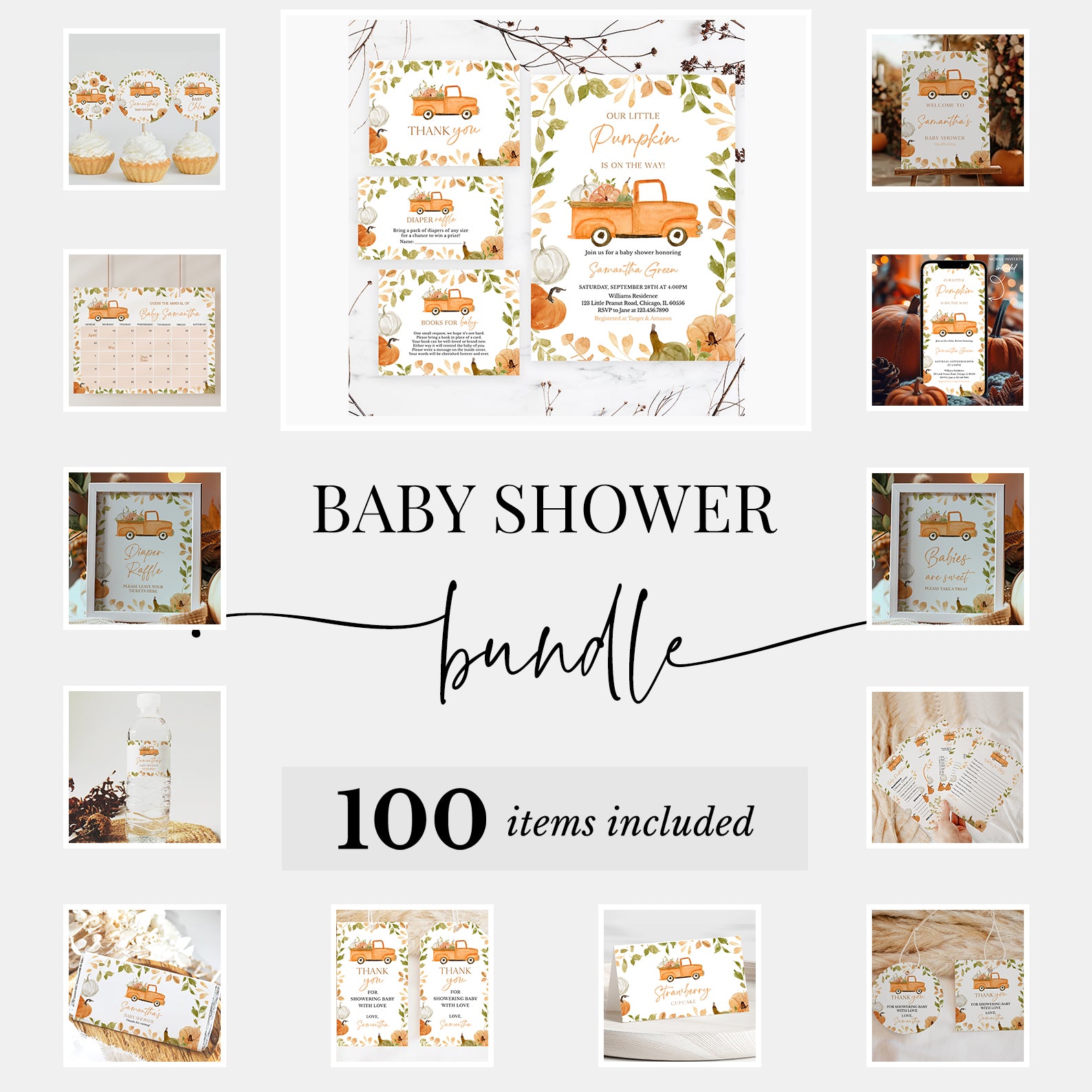 Celebrate your baby’s arrival in style with this all-in-one fall-themed baby shower mega bundle! Featuring 100 beautifully coordinated digital items from invitations and thank you cards to editable games, signs, labels, and décor. Each piece is adorned with cozy watercolor pumpkins, earthy leaves, and a playful orange pickup truck. With everything you need to plan a cohesive and charming autumn event, this bundle makes hosting both effortless and memorable.