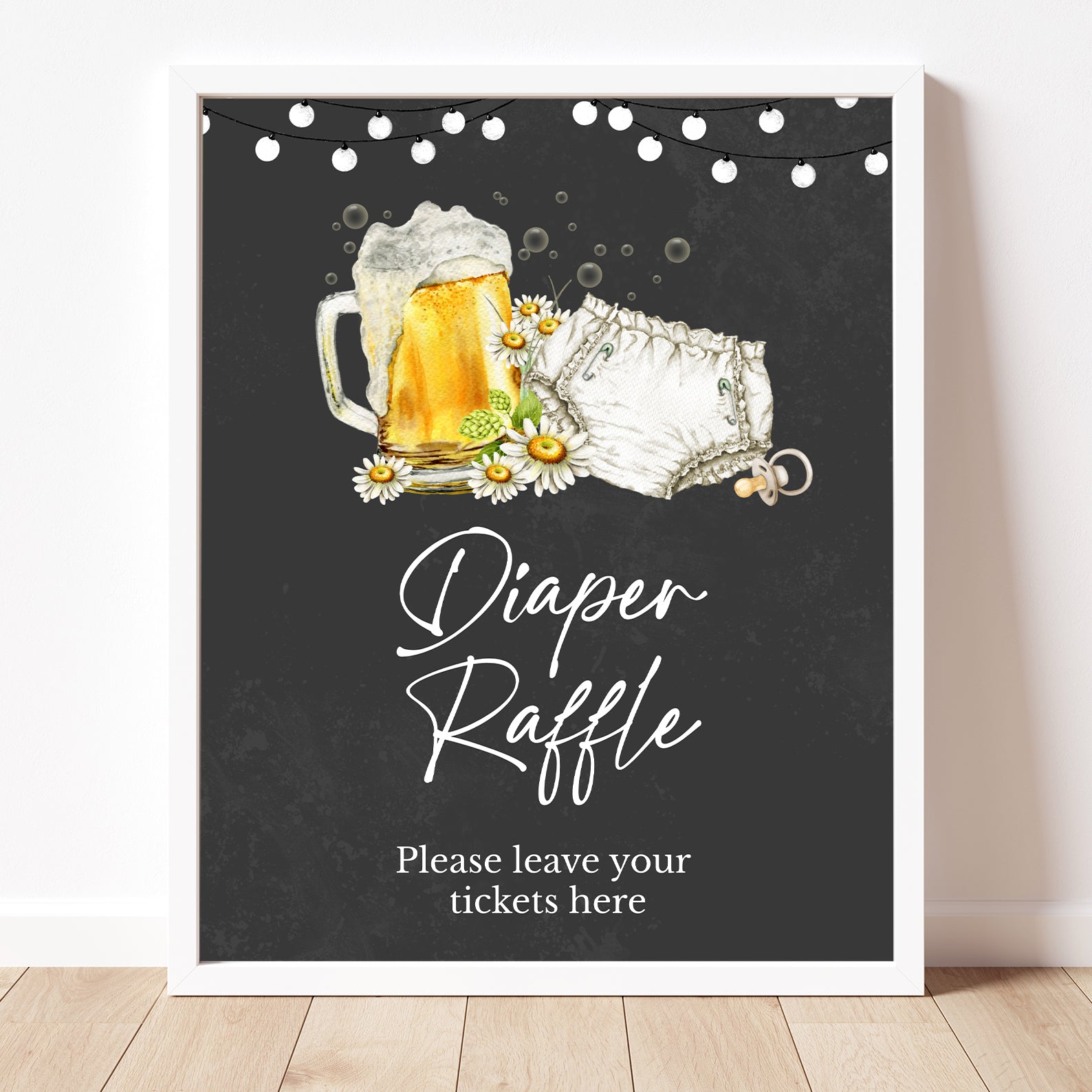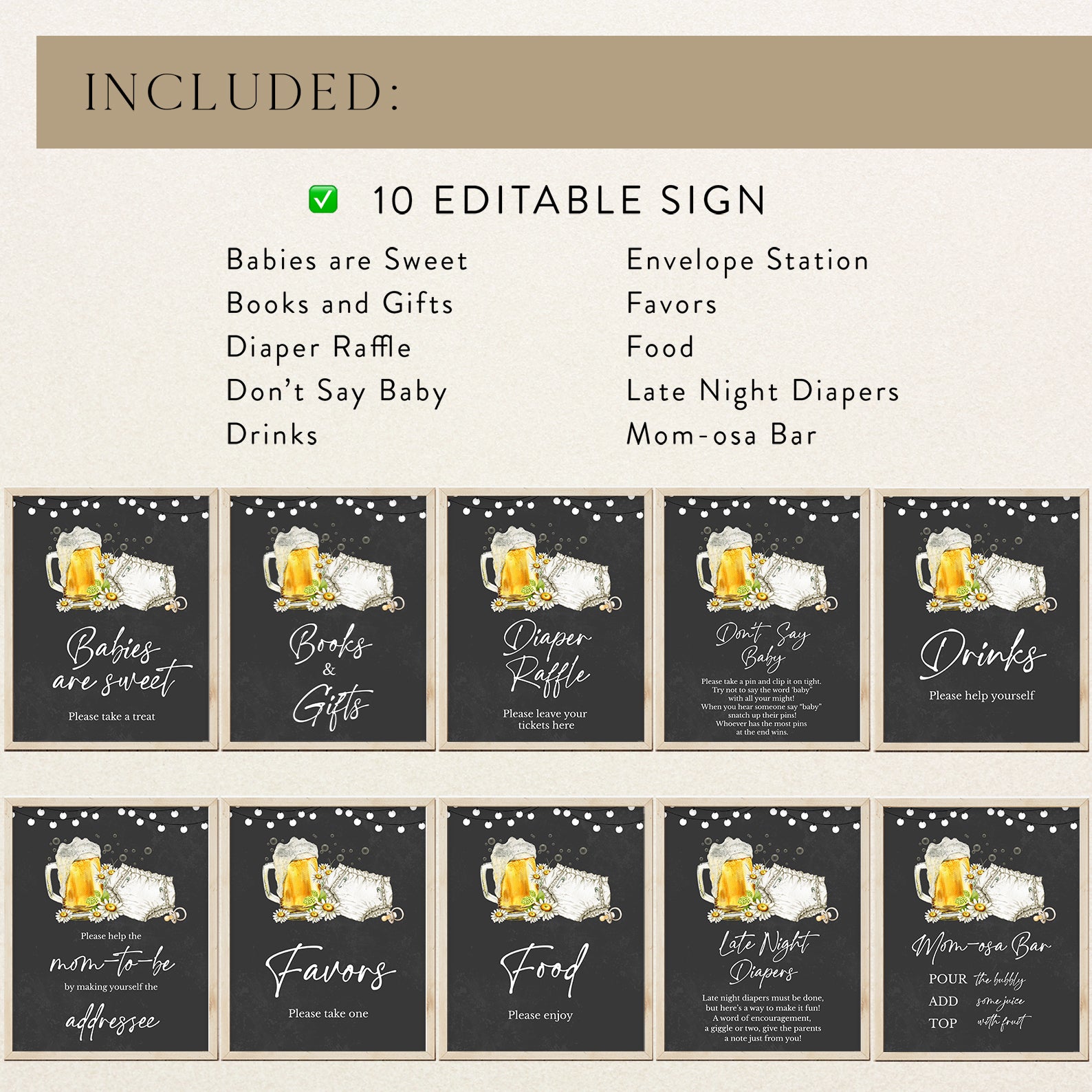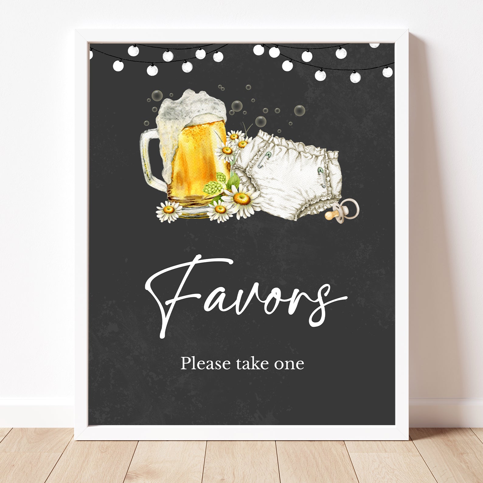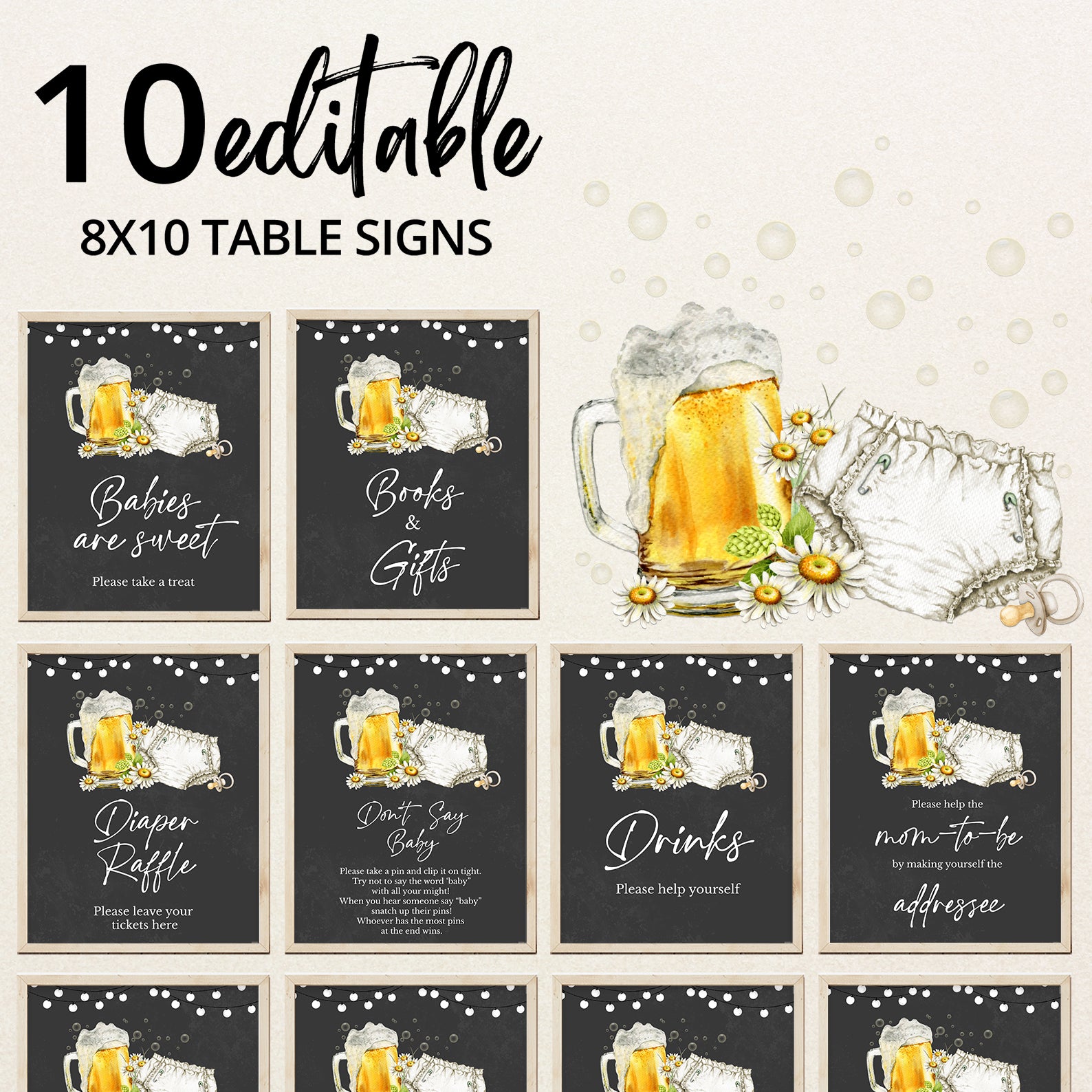 Set the tone for a fun and memorable diaper party with our charming "Huggies and Chuggies" baby shower table sign set! Featuring playful beer bubbles, cheerful daisies, and a whimsical diaper design against a bold black background, this editable set of ten signs includes Babies Are Sweet, Books and Gifts, Diaper Raffle Sign, Don't Say Baby, Drinks Sign, Envelope Station, Favors, Food Sign, Late Night Diapers, and Mom-osa Bar—perfect for adding a fun twist to your celebration!
