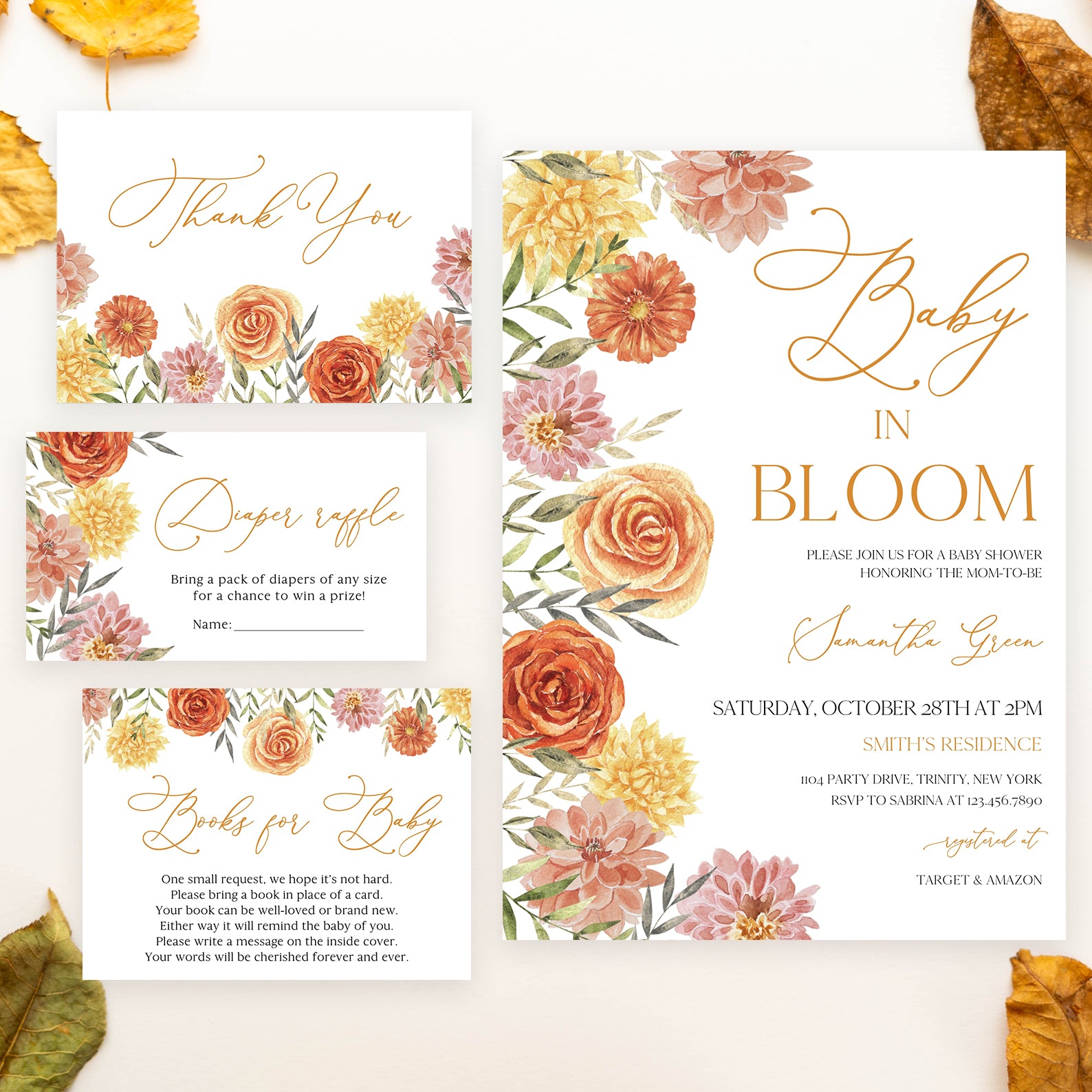 Celebrate your little one with our "Baby in Bloom" fall baby shower invitation bundle. Featuring vibrant flowers and green autumn leaves, this set includes an invitation, mobile invite, diaper raffle, books for baby card, and thank you card. It’s a warm and elegant choice for welcoming friends and family to your joyous occasion.