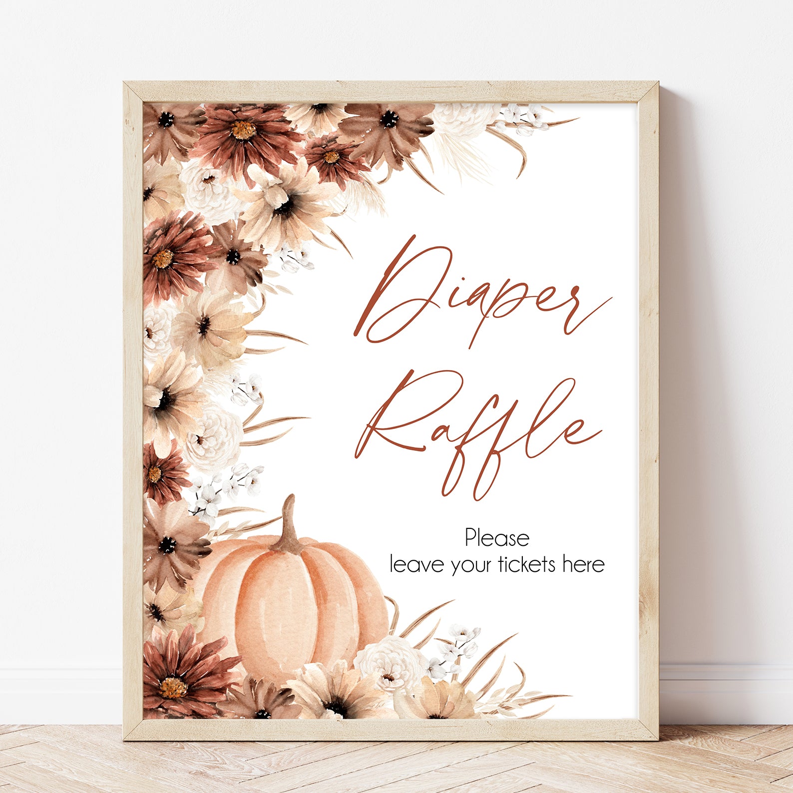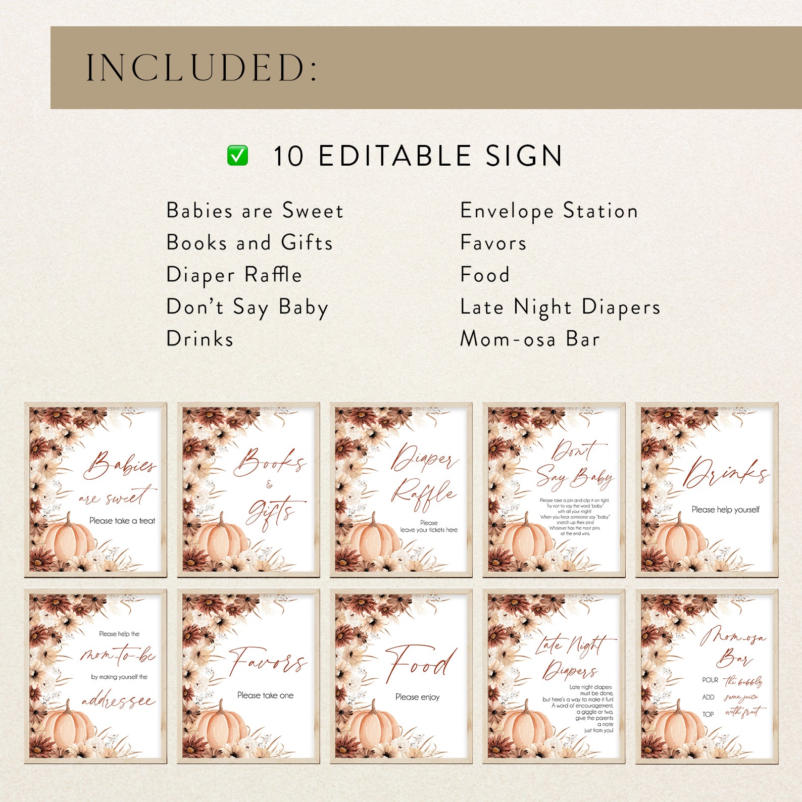 Add a touch of autumn charm to your baby shower with this set of 10 editable table signs, beautifully designed with soft watercolor aster flowers and a cheerful orange pumpkin motif. Each sign features warm, earthy tones and a clean layout framed by gentle fall foliage. Perfectly coordinated for a cozy seasonal celebration, the set includes: Babies Are Sweet, Books and Gifts, Diaper Raffle, Don’t Say Baby, Drinks, Envelope Station, Favors, Food, Late Night Diapers, and Mom-osa Bar.