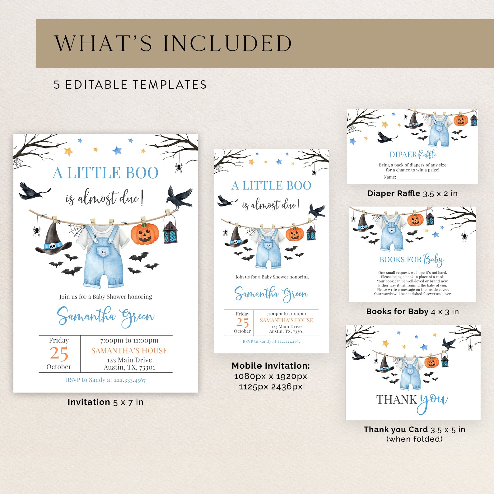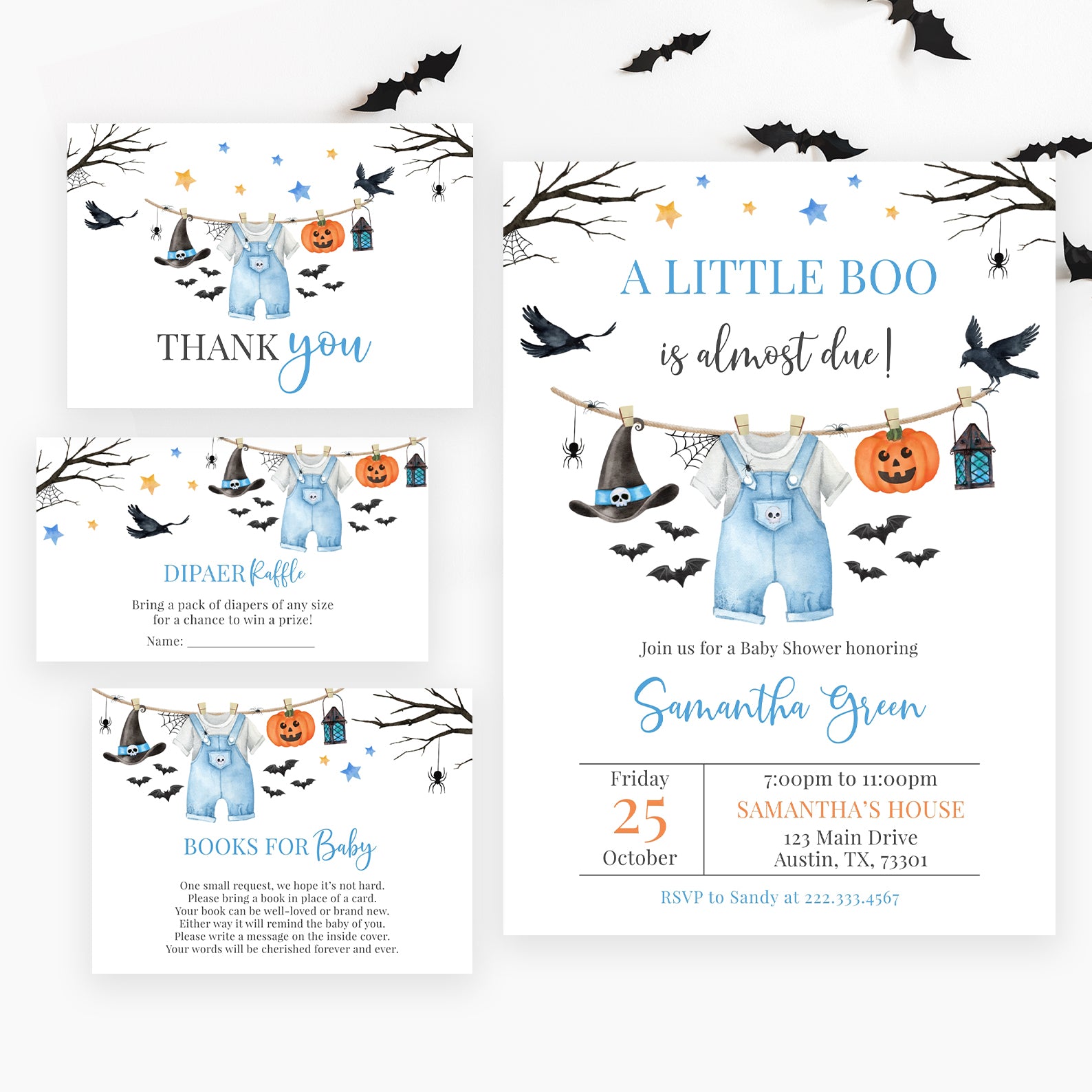- Purchase this Blue Halloween Baby Shower Invite Bundle: Stars, Crows & Jumpsuit template