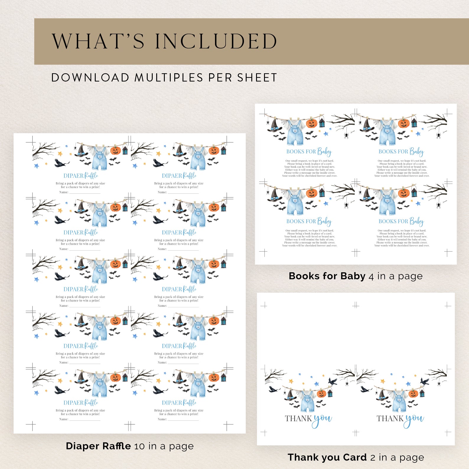 Welcome your little one with our charming Halloween baby shower invitation bundle! Available in a choice of pink or blue, this set includes an invitation, mobile invite, diaper raffle, books for baby card, and thank you card. Adorned with whimsical stars, spooky tree branches, and playful Halloween accents, it’s perfect for creating a festive and memorable celebration.