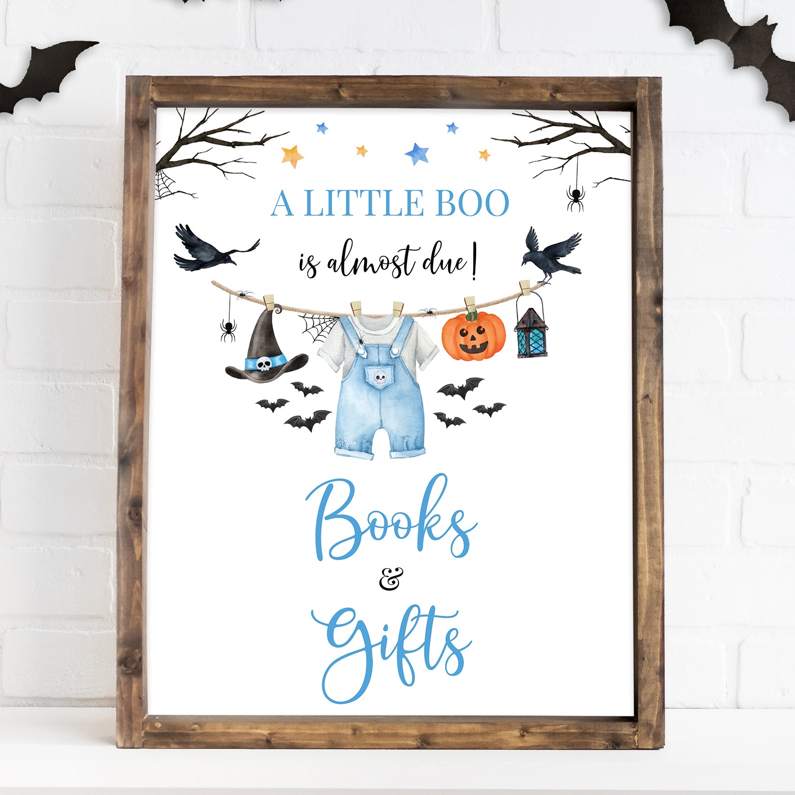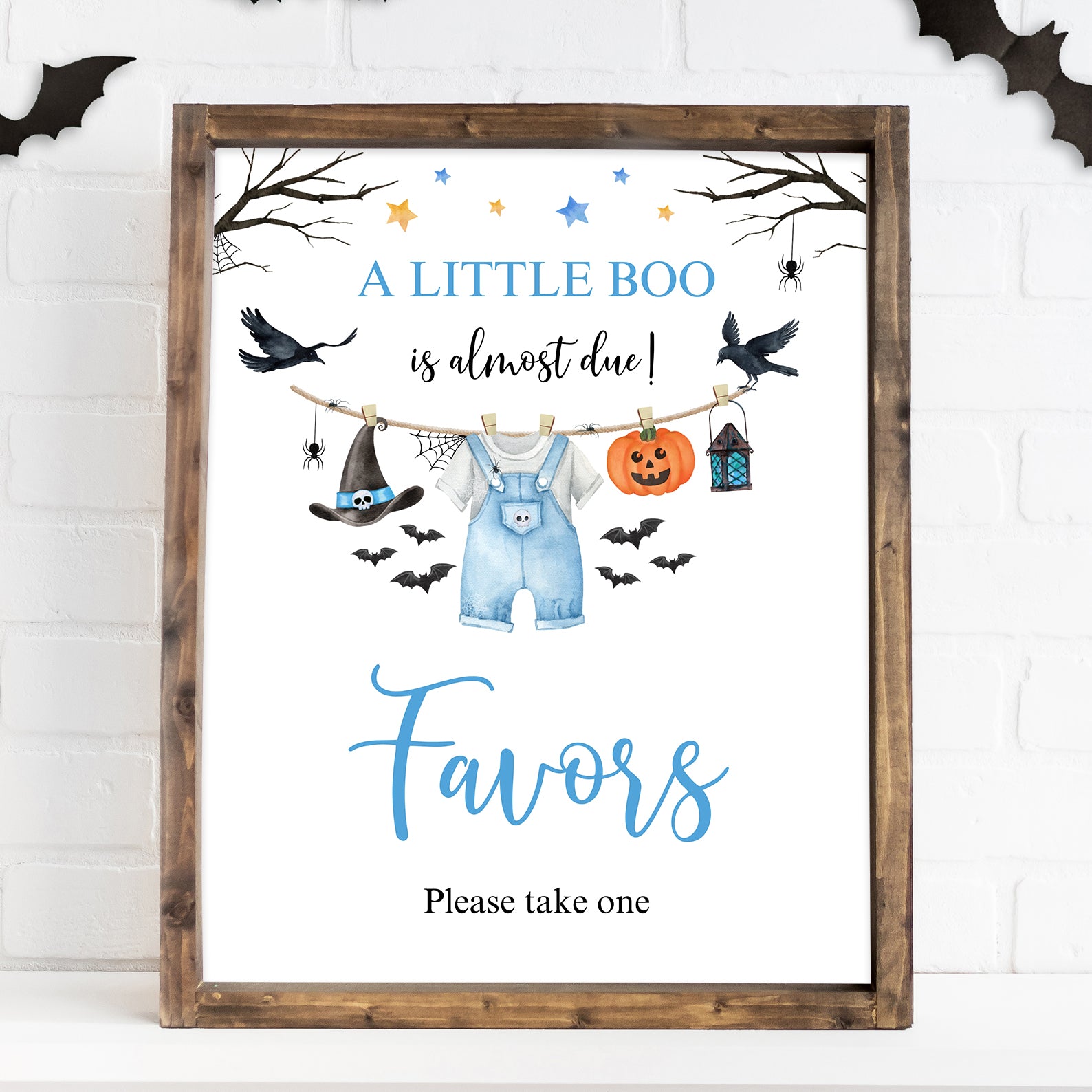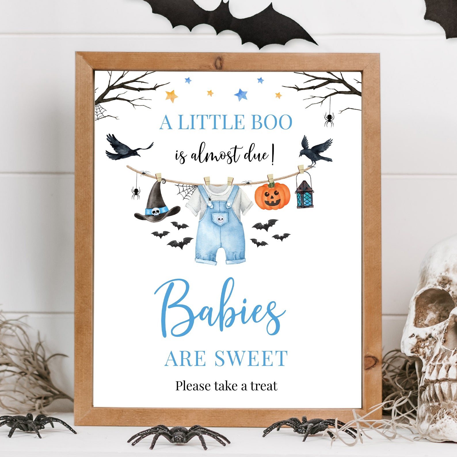 Blue Halloween Baby Shower Table Sign: Stars, Crows & Jumpsuit