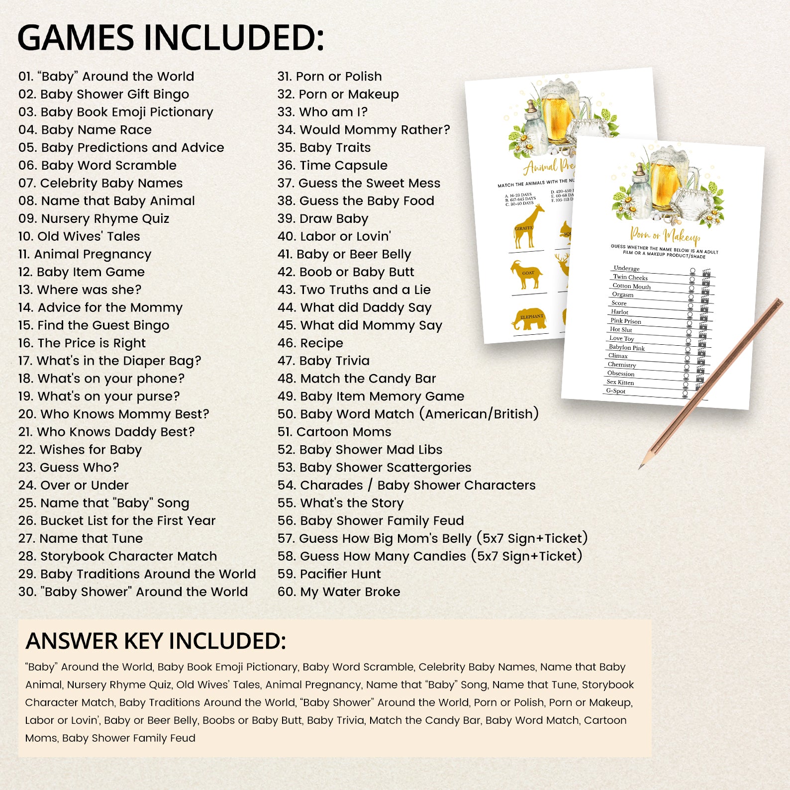 Celebrate the upcoming arrival of your little one with our Evergreen Diaper Party Game Bundle! Featuring fun, interactive games that capture the playful spirit of your diaper party, this bundle includes 60 exciting games that your guests will love. From trivia and challenges to unique diaper-themed activities, this collection is designed to keep everyone laughing and engaged. Perfect for a brew before the baby arrives, this game bundle adds the perfect touch to your memorable gathering!
