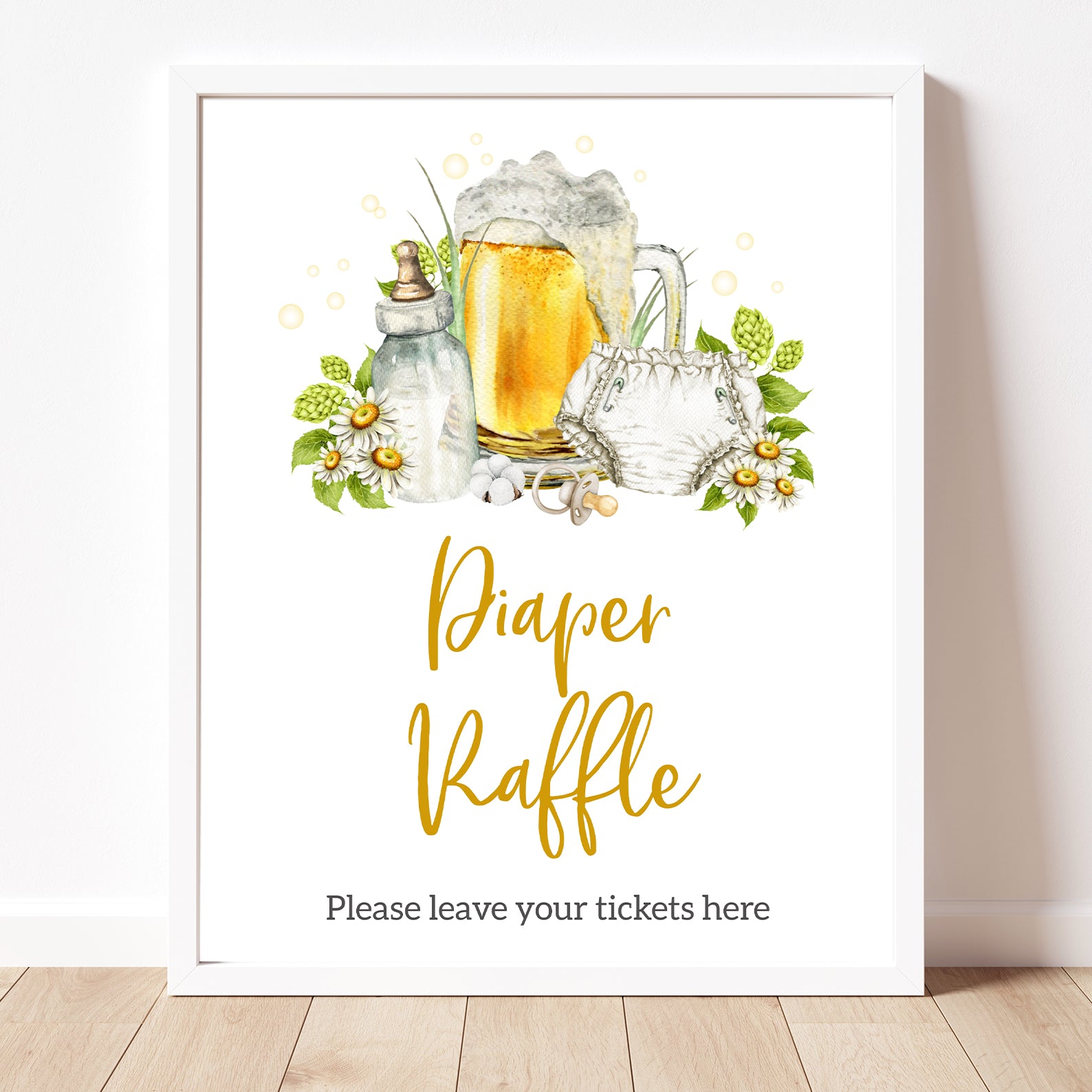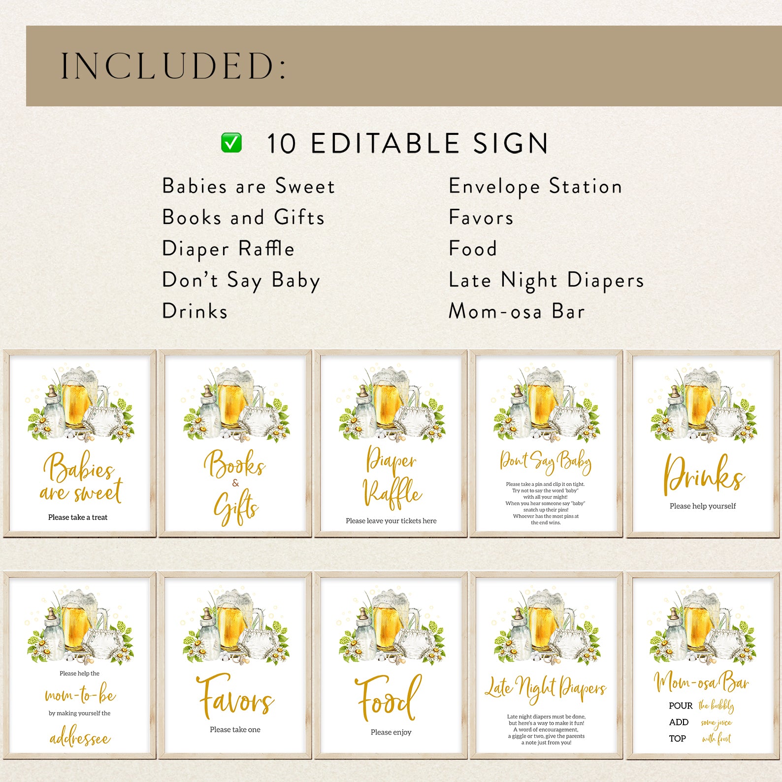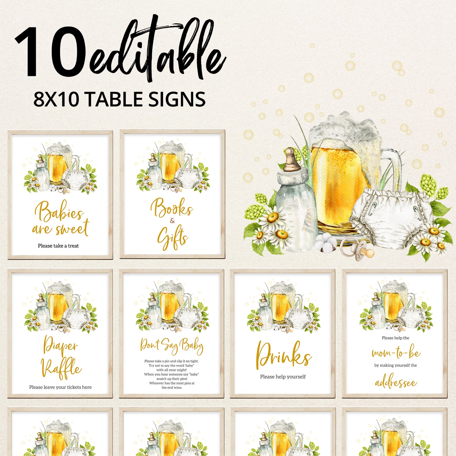 Complete your diaper party décor with this set of ten editable table signs, designed to match your fun and festive celebration! Featuring a cheerful yellow bubble background, lush green leaves, and playful illustrations of a beer mug, baby bottle, diaper, and pacifier, these signs add a lighthearted touch to your event. The set includes Balloons, Drinks, Envelope Station, Favors, Food, Late Night Diapers, Beer & Bottles, Gifts, Dad’s Advice, and Welcome, making it easy to create a lively and inviting atmosphere for your special gathering!