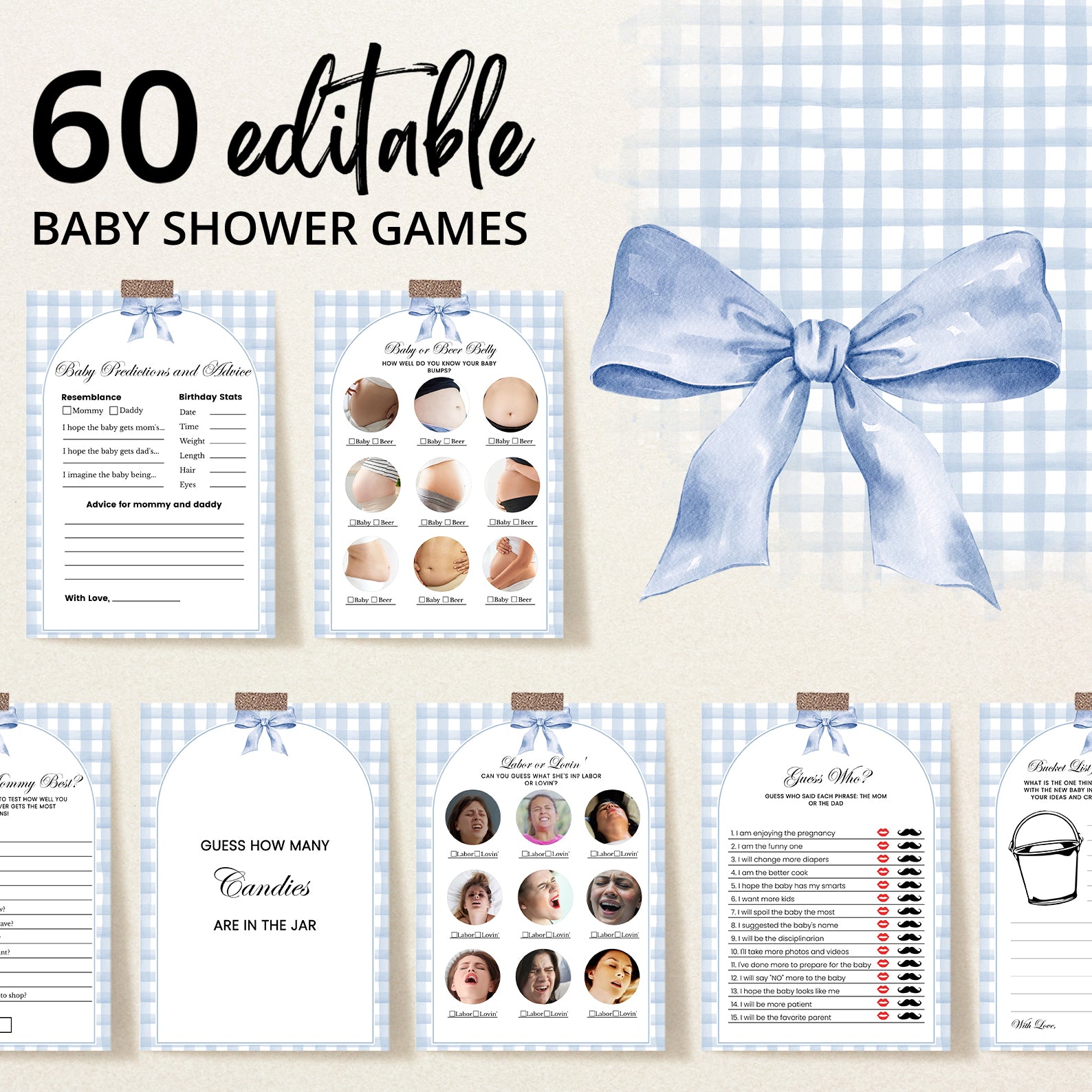 - Purchase this Blue Plaid Baby Shower Game Bundle with Arch & Ribbon Design template