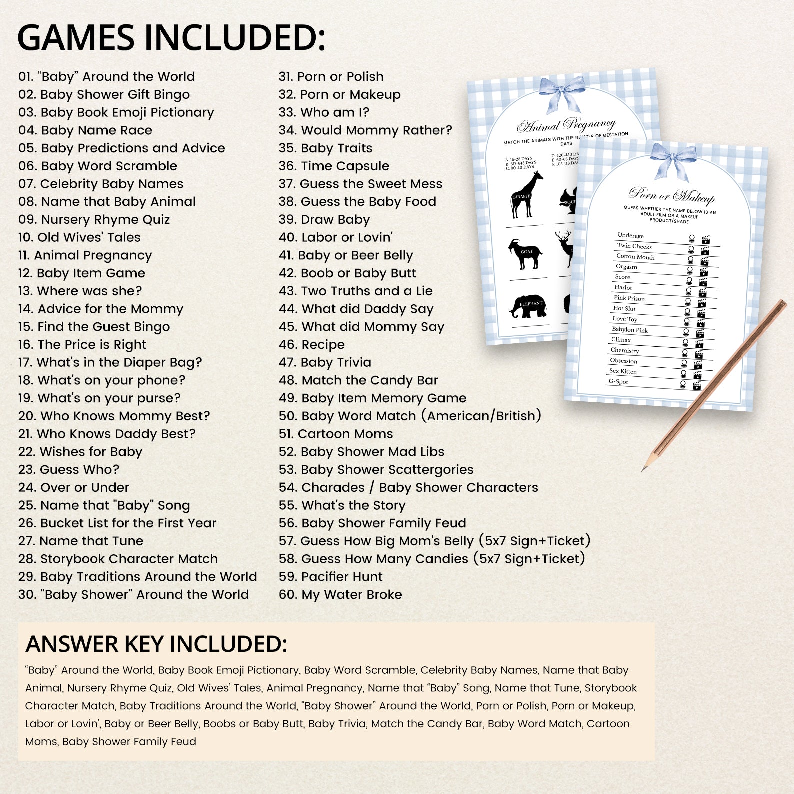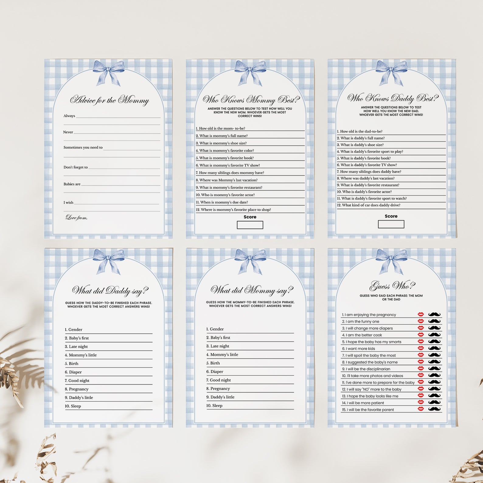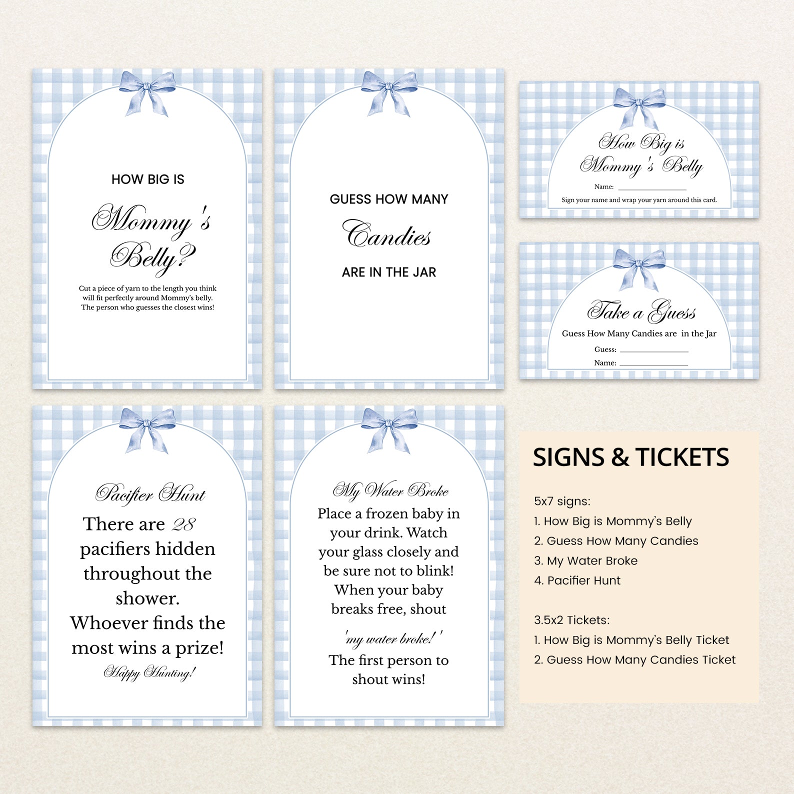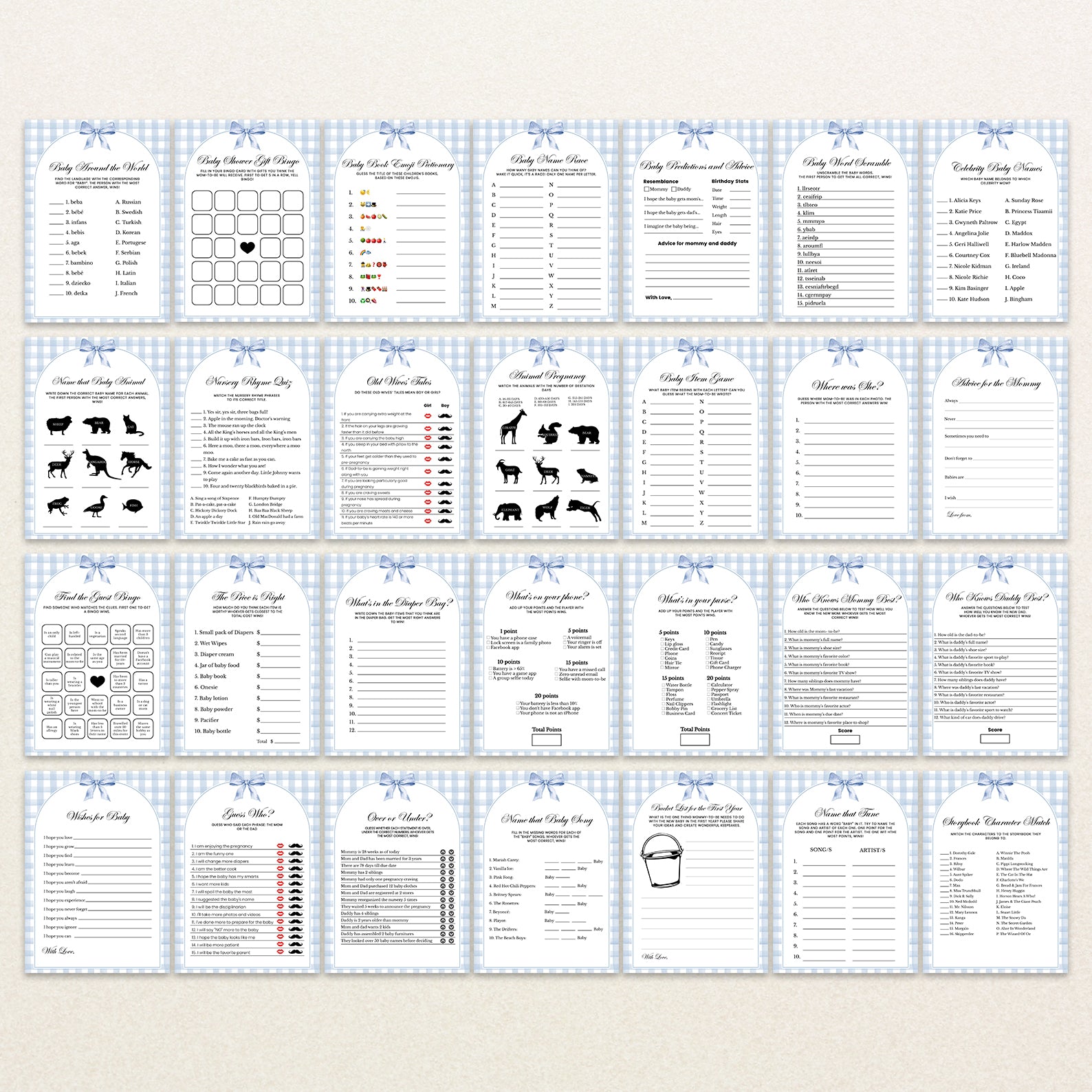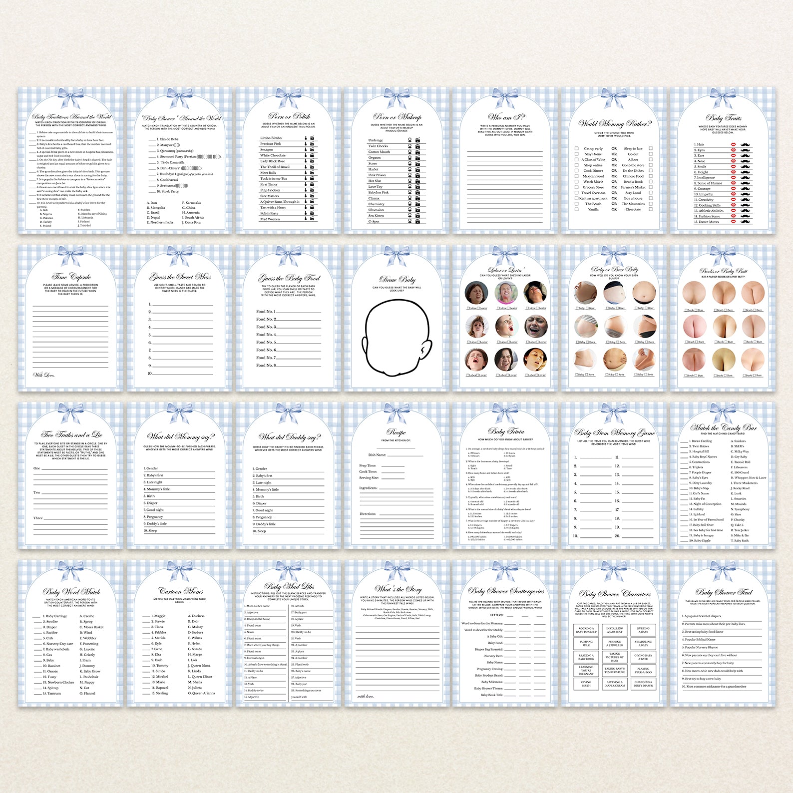 Blue Plaid Baby Shower Game Bundle with Arch & Ribbon Design