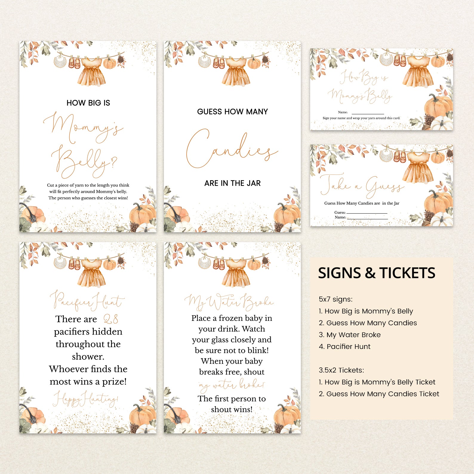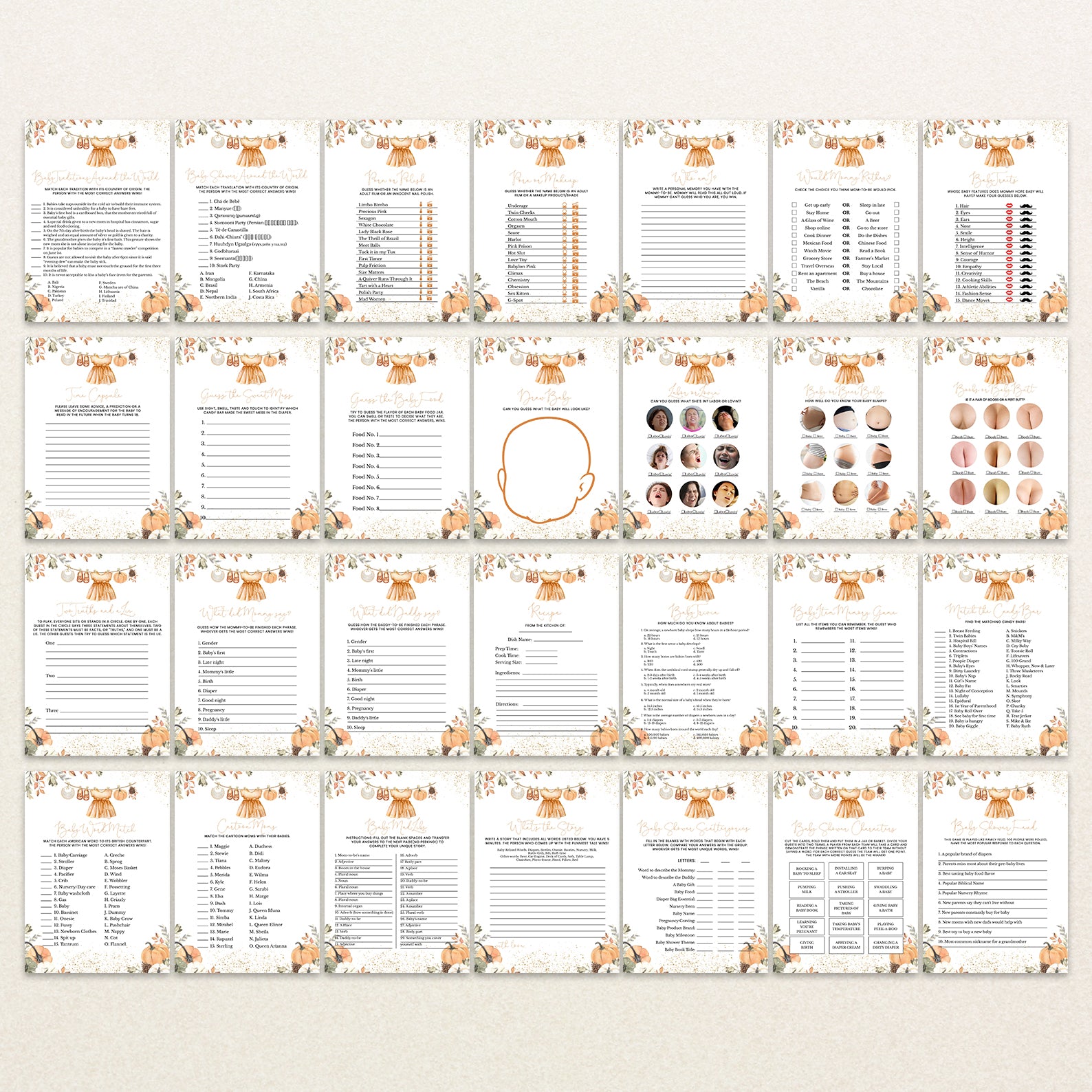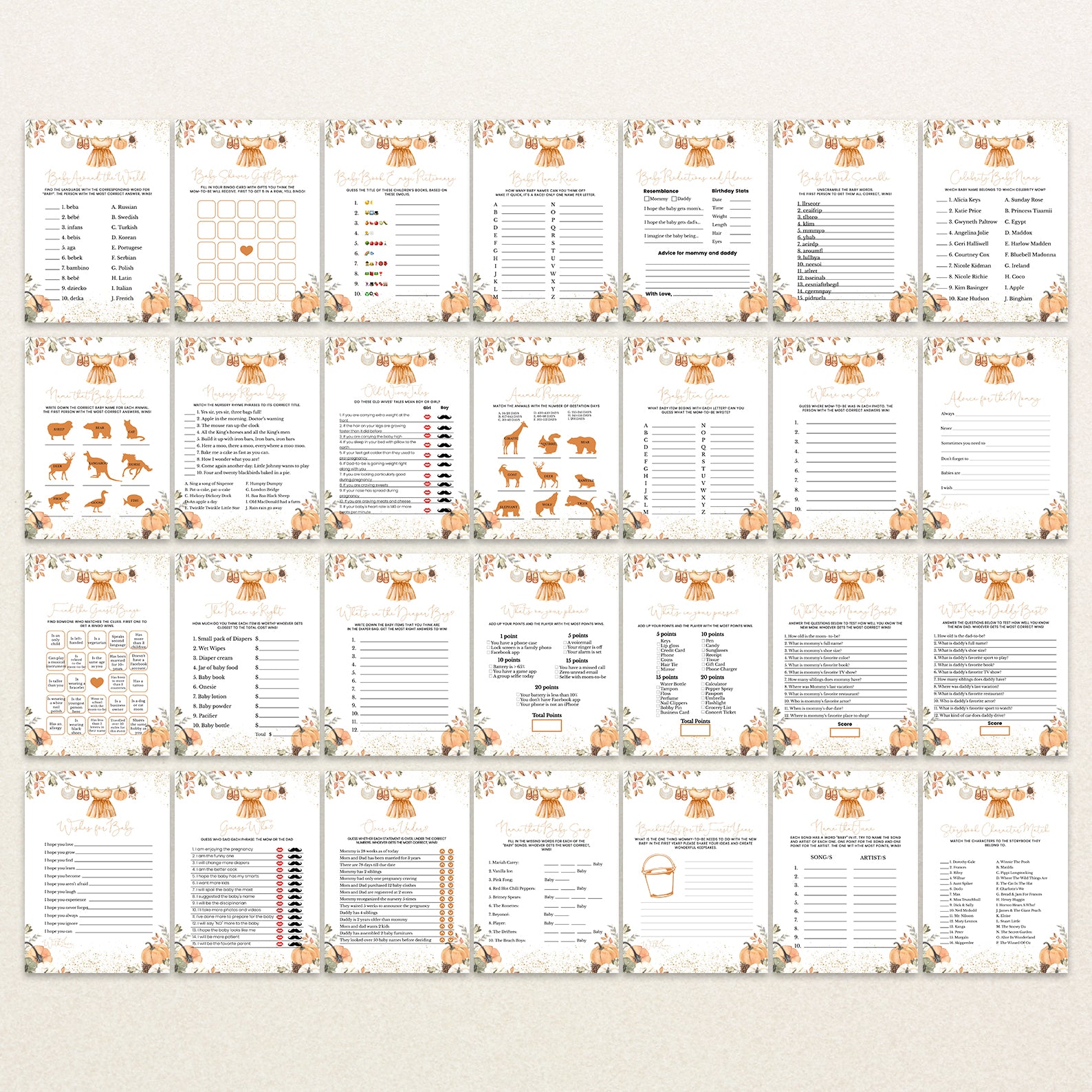 - Purchase this Orange Fall Baby Shower Game Bundle with Leaves, Pumpkins & Gold template