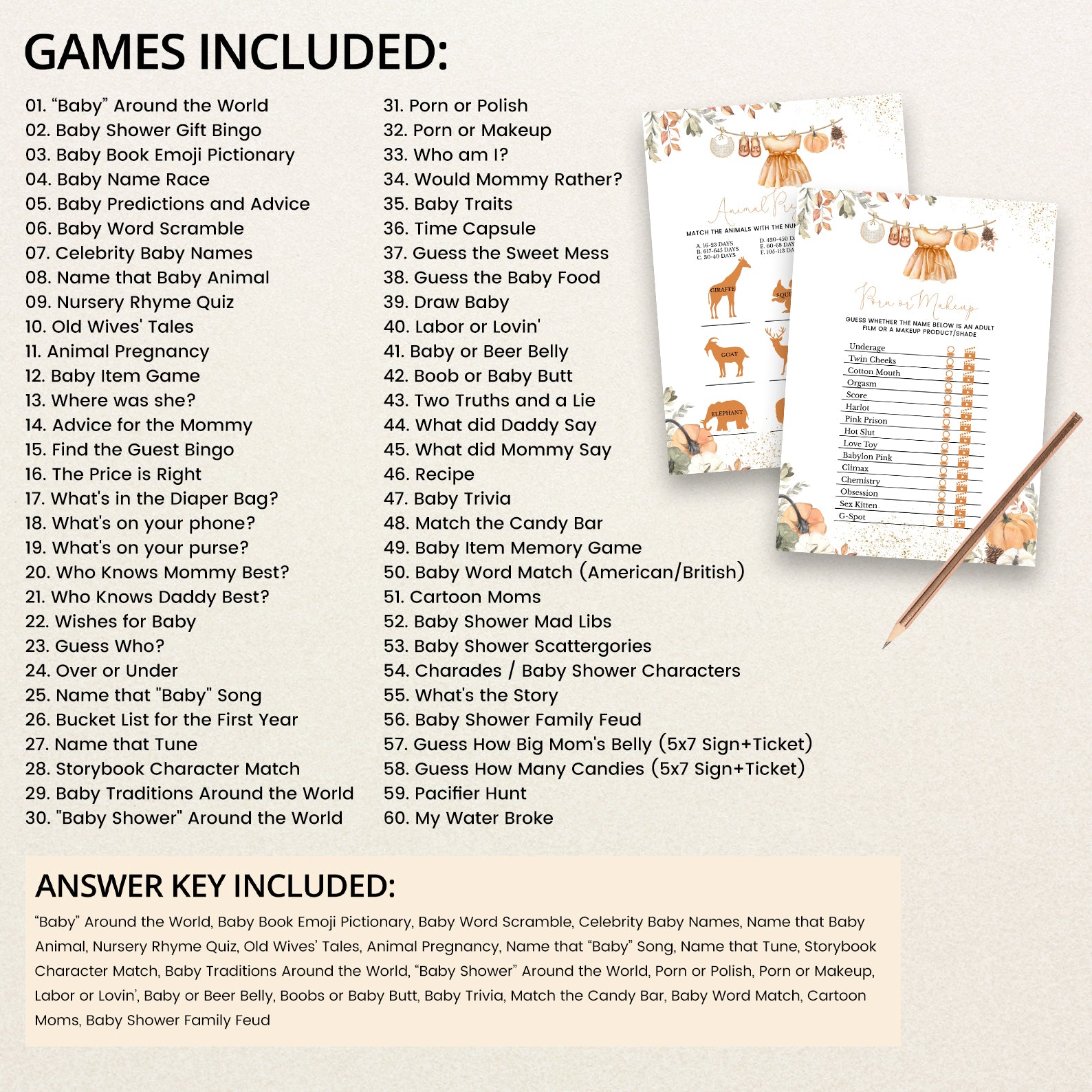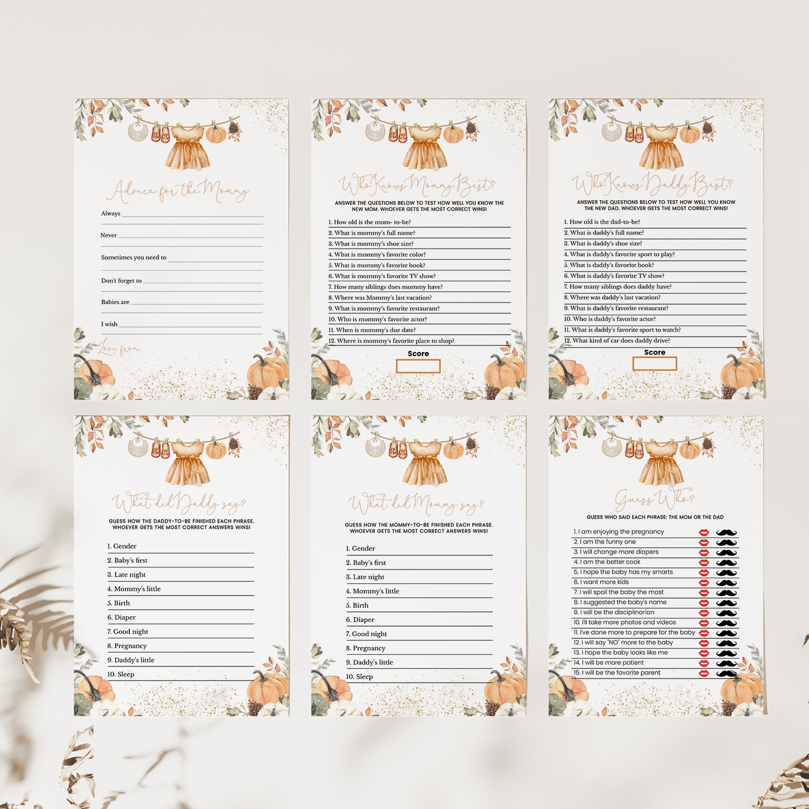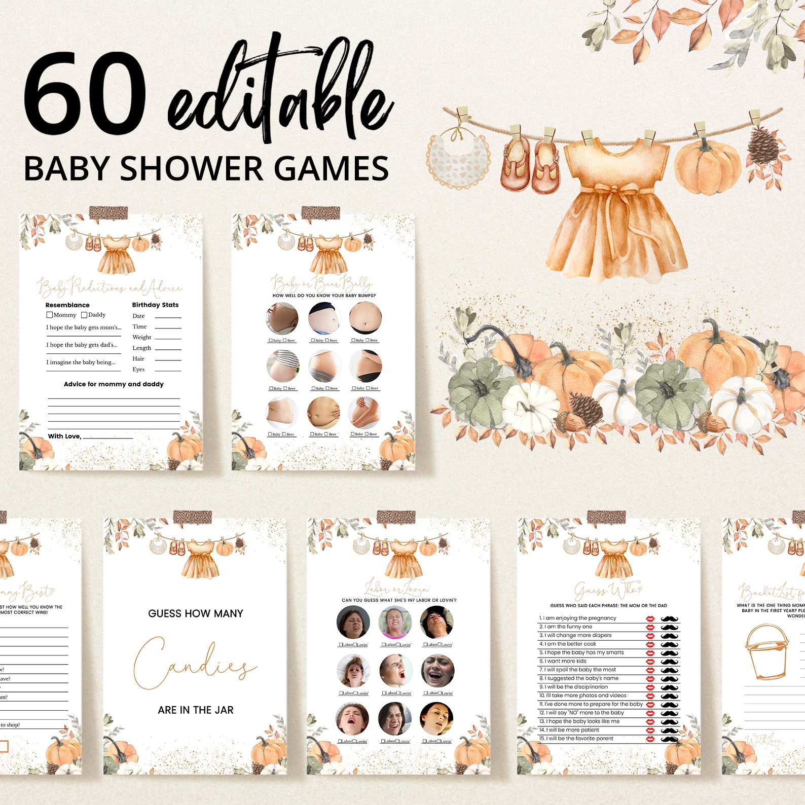 - Purchase this Orange Fall Baby Shower Game Bundle with Leaves, Pumpkins & Gold template