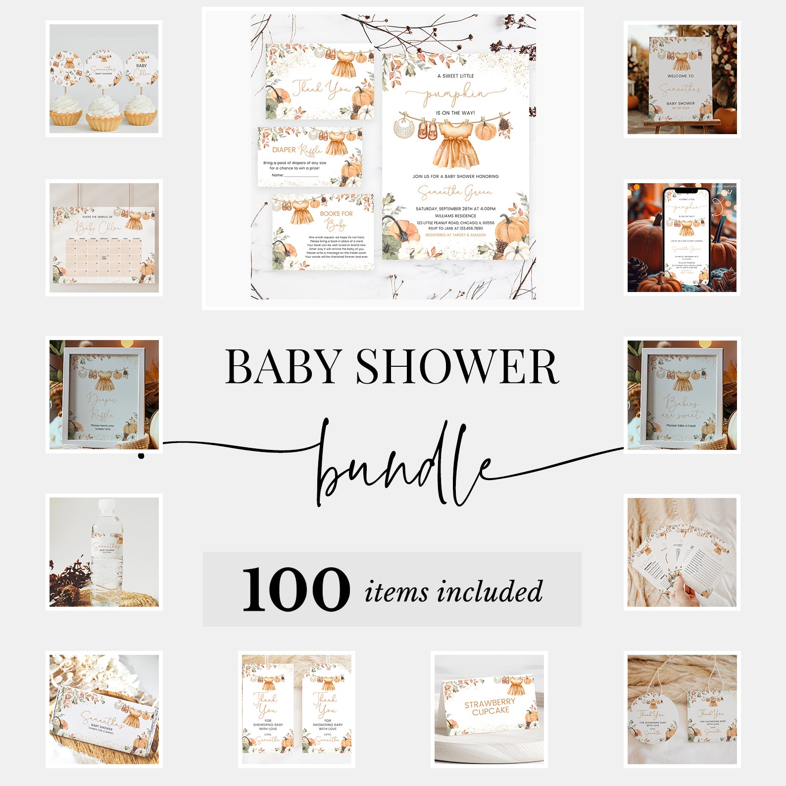 - Purchase this Orange Fall Baby Shower Mega Bundle with Leaves, Pumpkins & Gold template