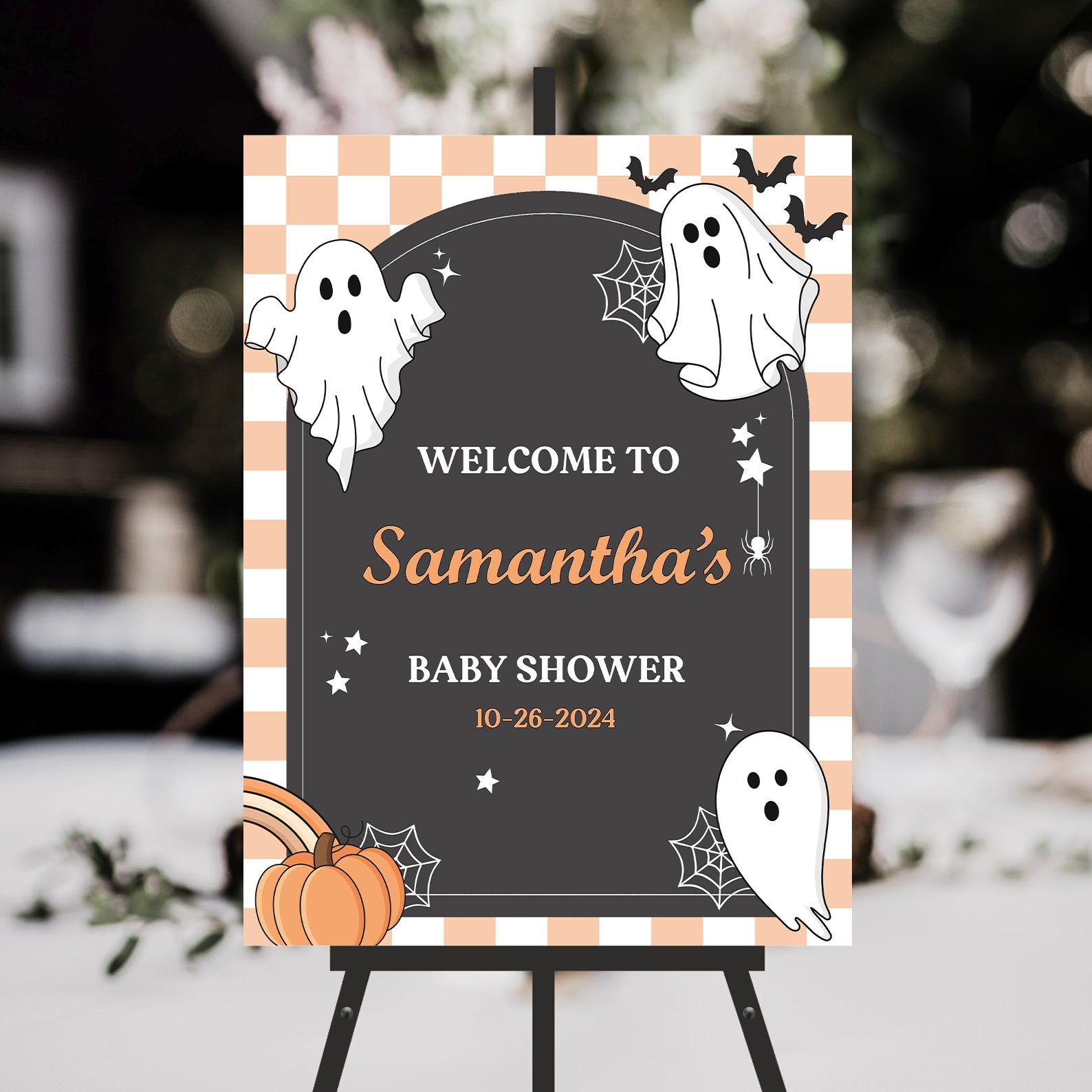 Add a festive touch to your Halloween baby shower with our digital welcome sign! Featuring whimsical ghosts, playful bats, a sparkling disco ball, and charming spider webs, all set against a checkered orange background with stars, a rainbow, and a classic pumpkin. This sign perfectly captures the spooky spirit of the season and warmly greets guests as you prepare for your little boo!