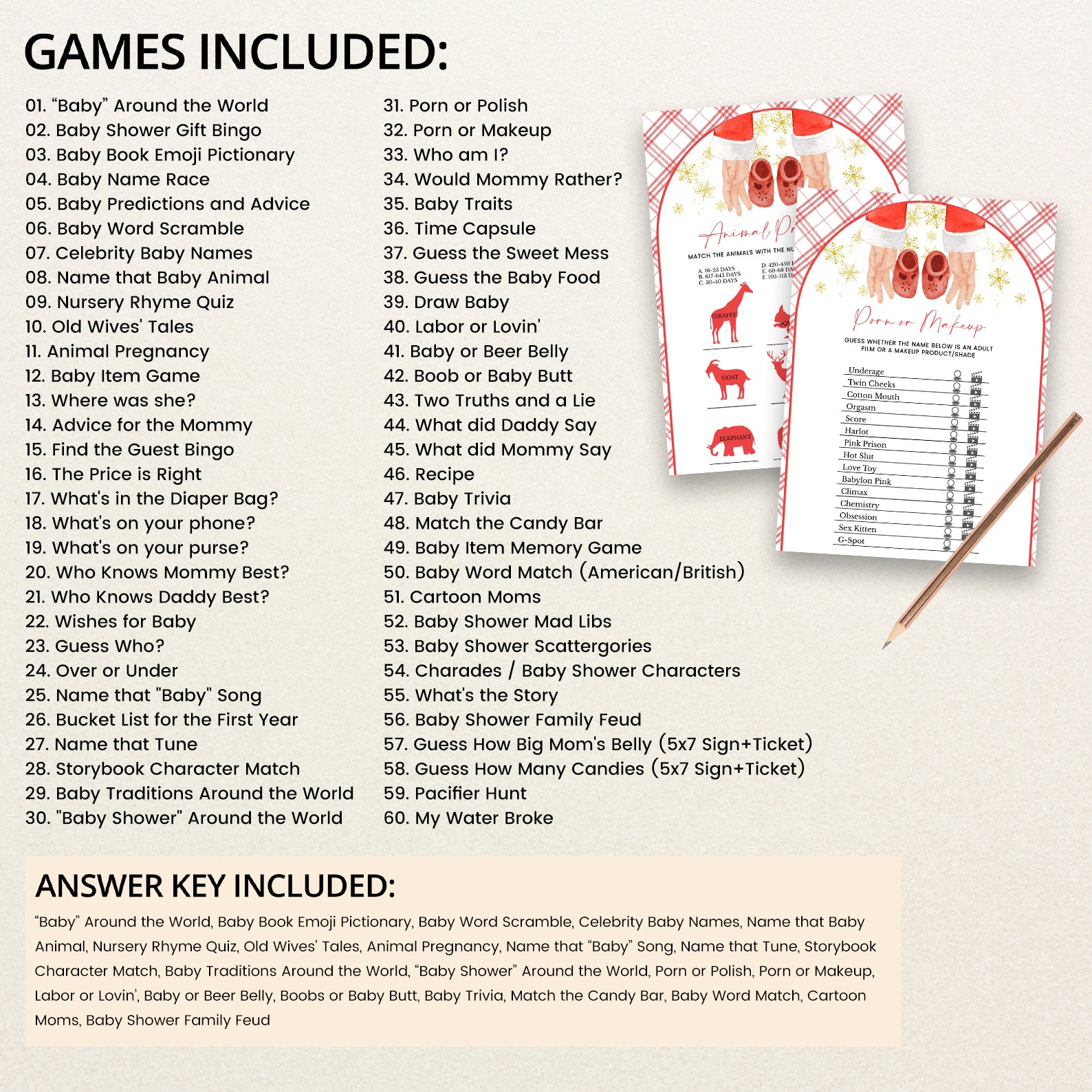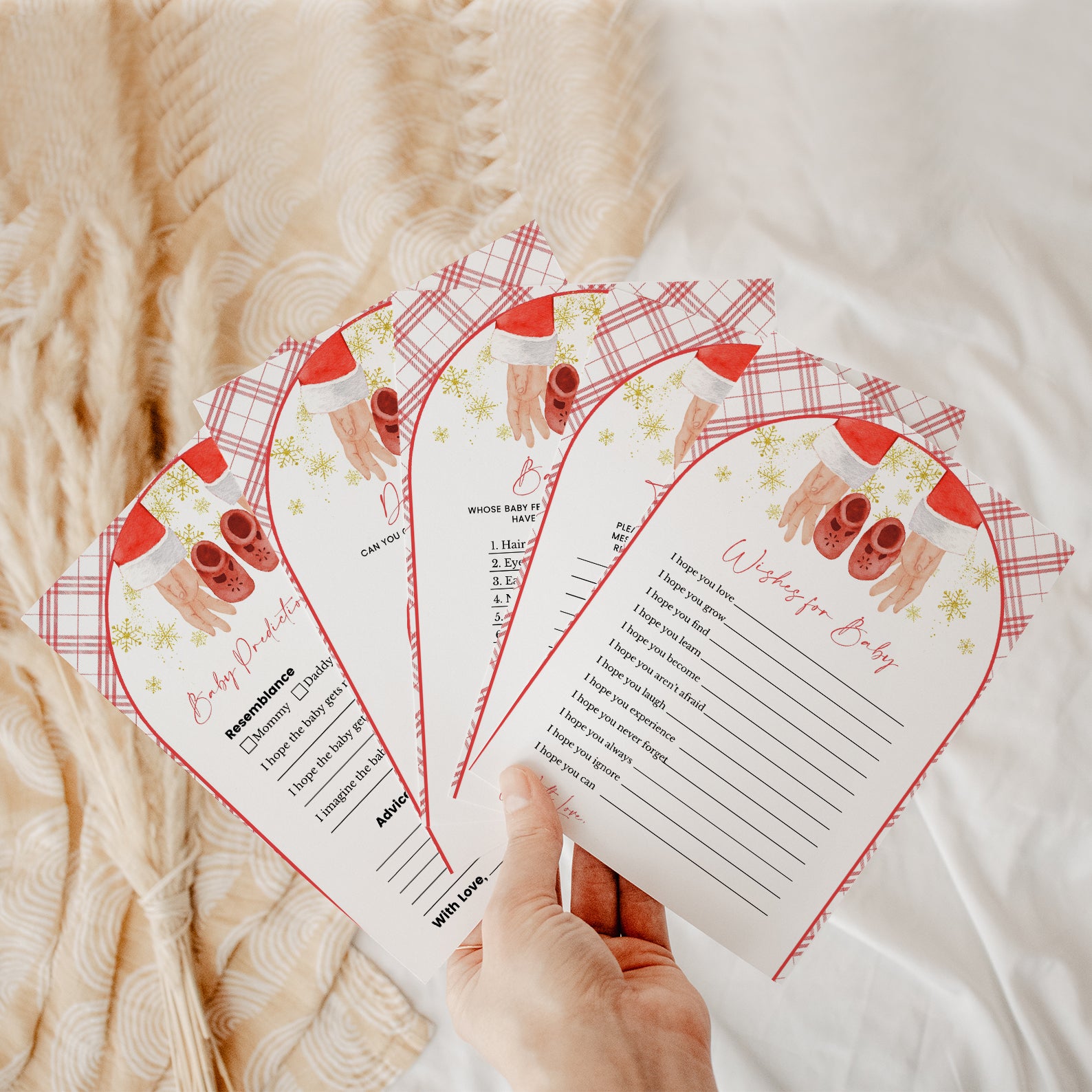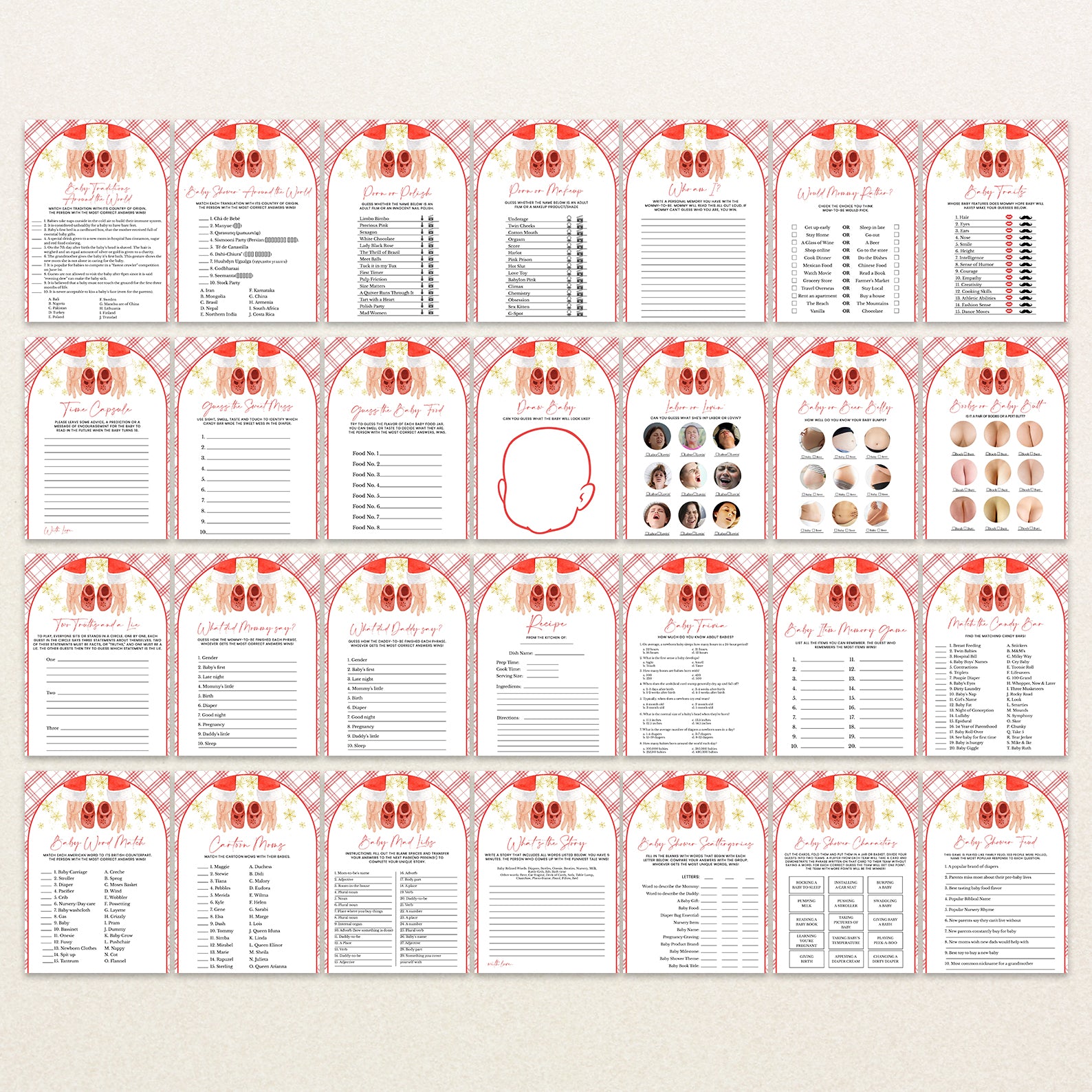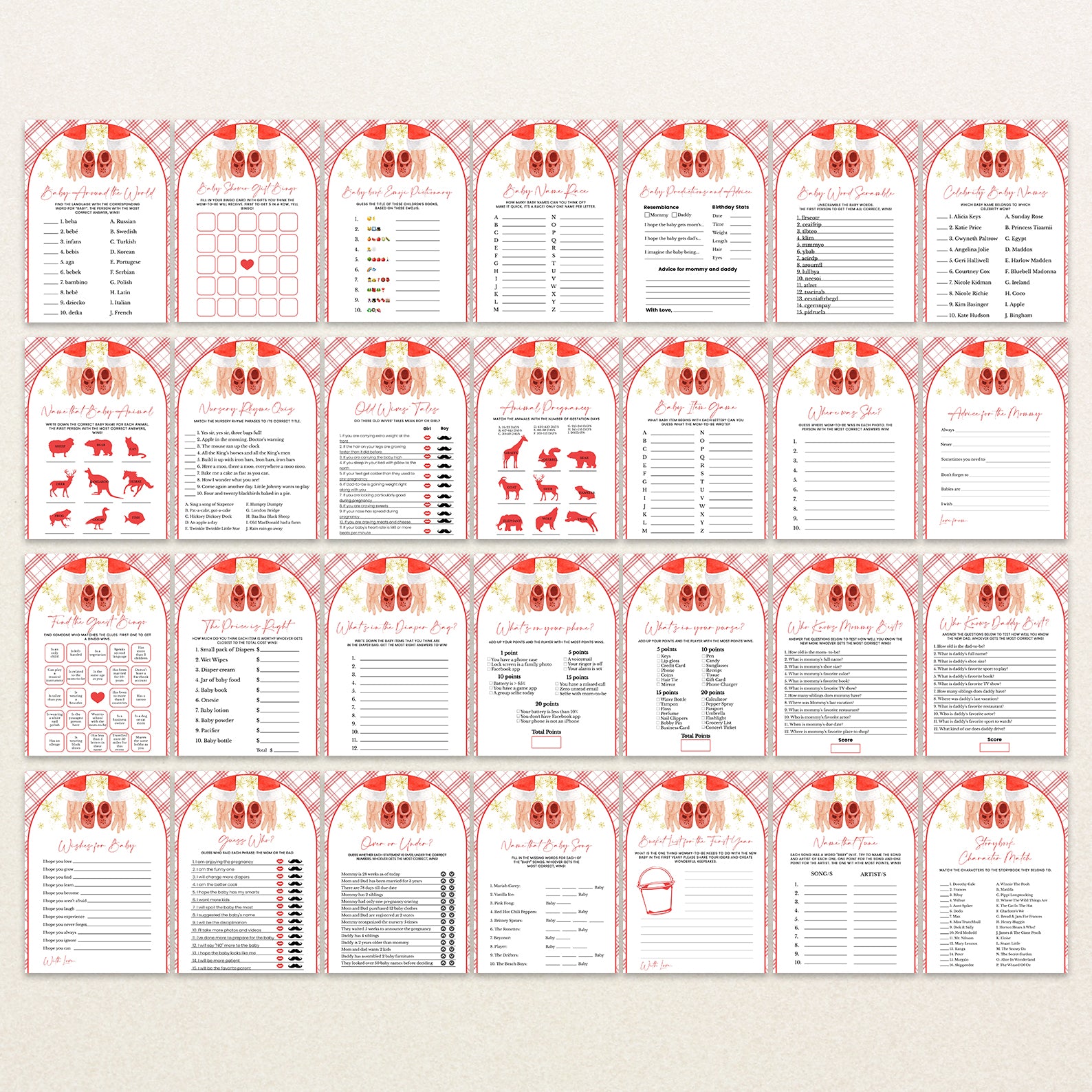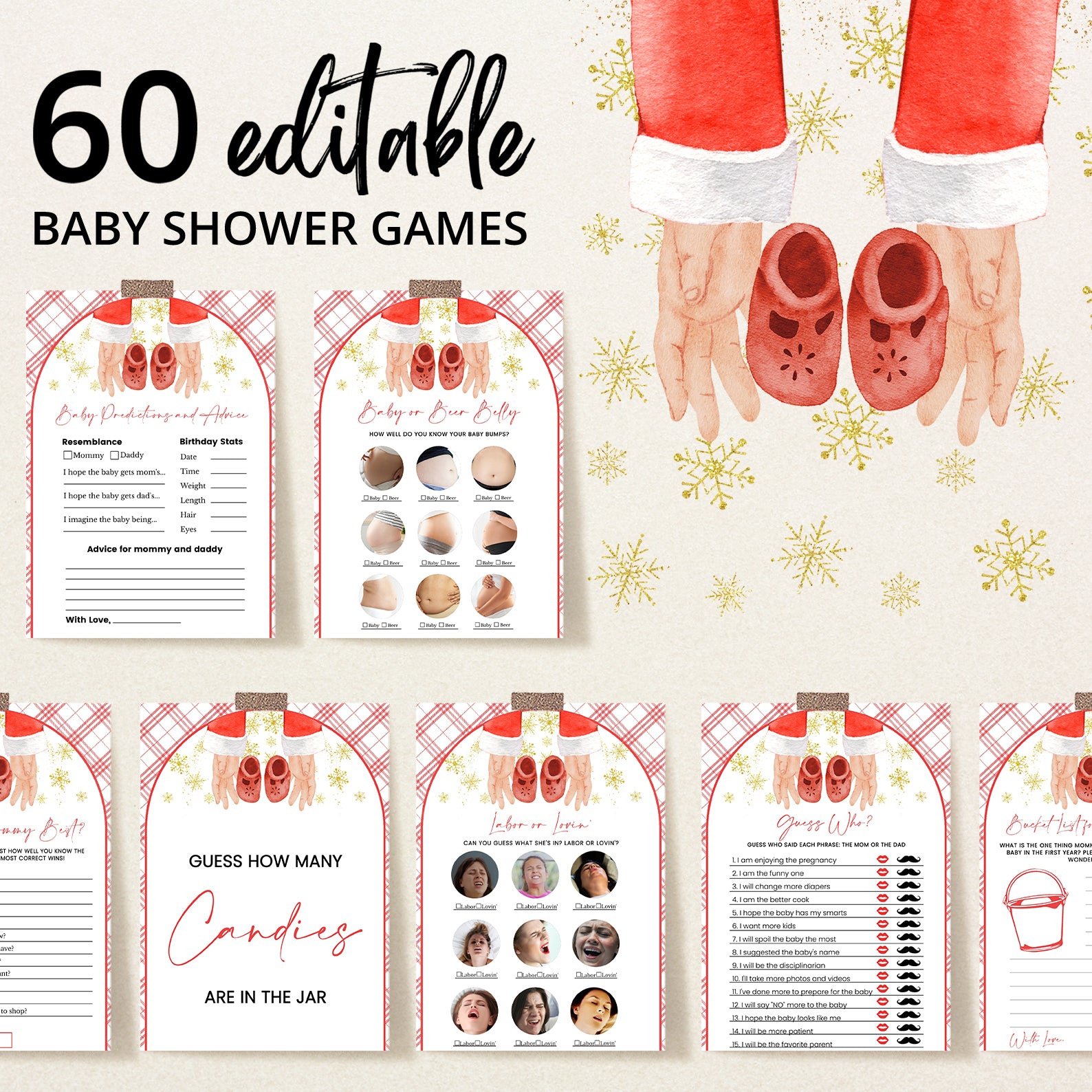 Bring joy and laughter to your winter celebration with our 60 editable baby shower games, beautifully designed with a Santa hand cradling baby shoes, golden snowflakes, and a festive red backdrop. From icebreakers to classic party favorites, this matching set makes your event both fun and visually cohesive while embracing the magic of the season.