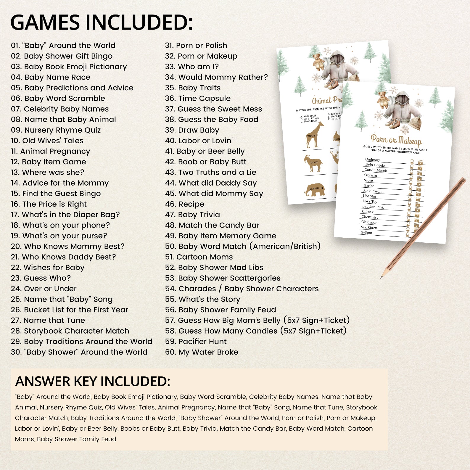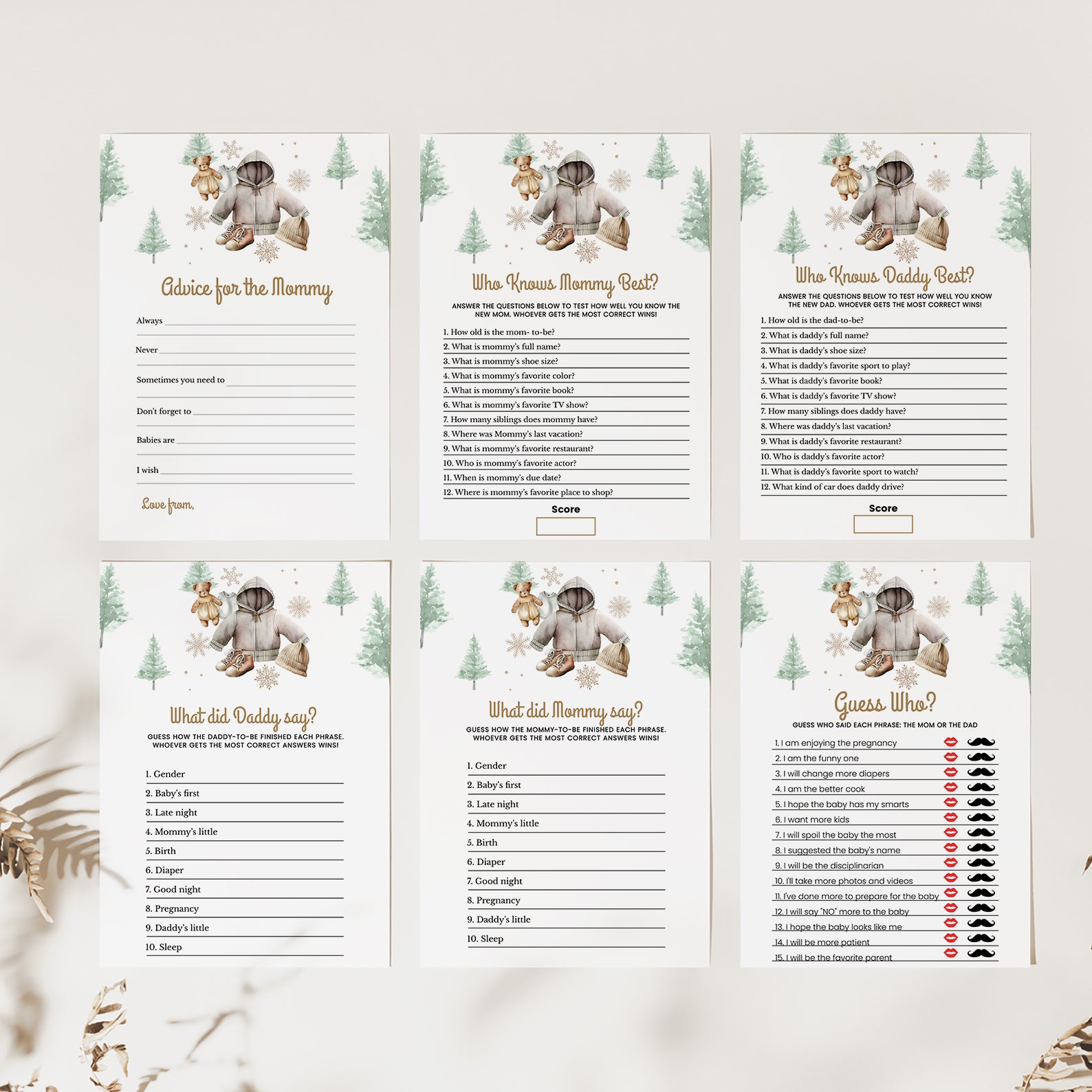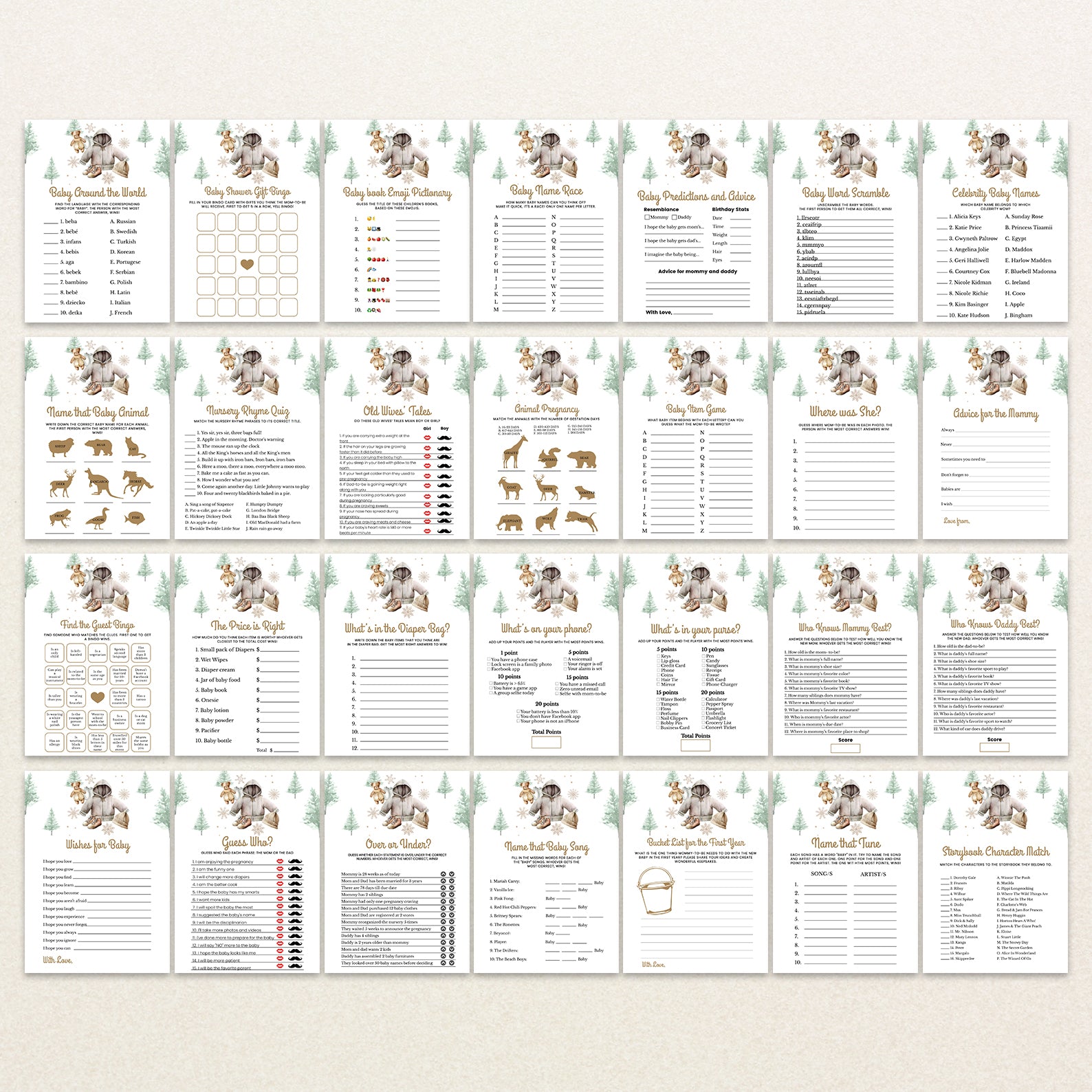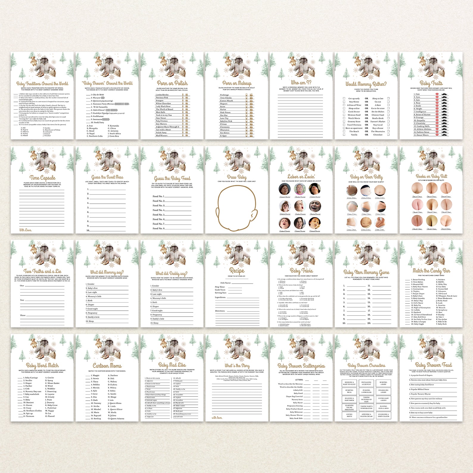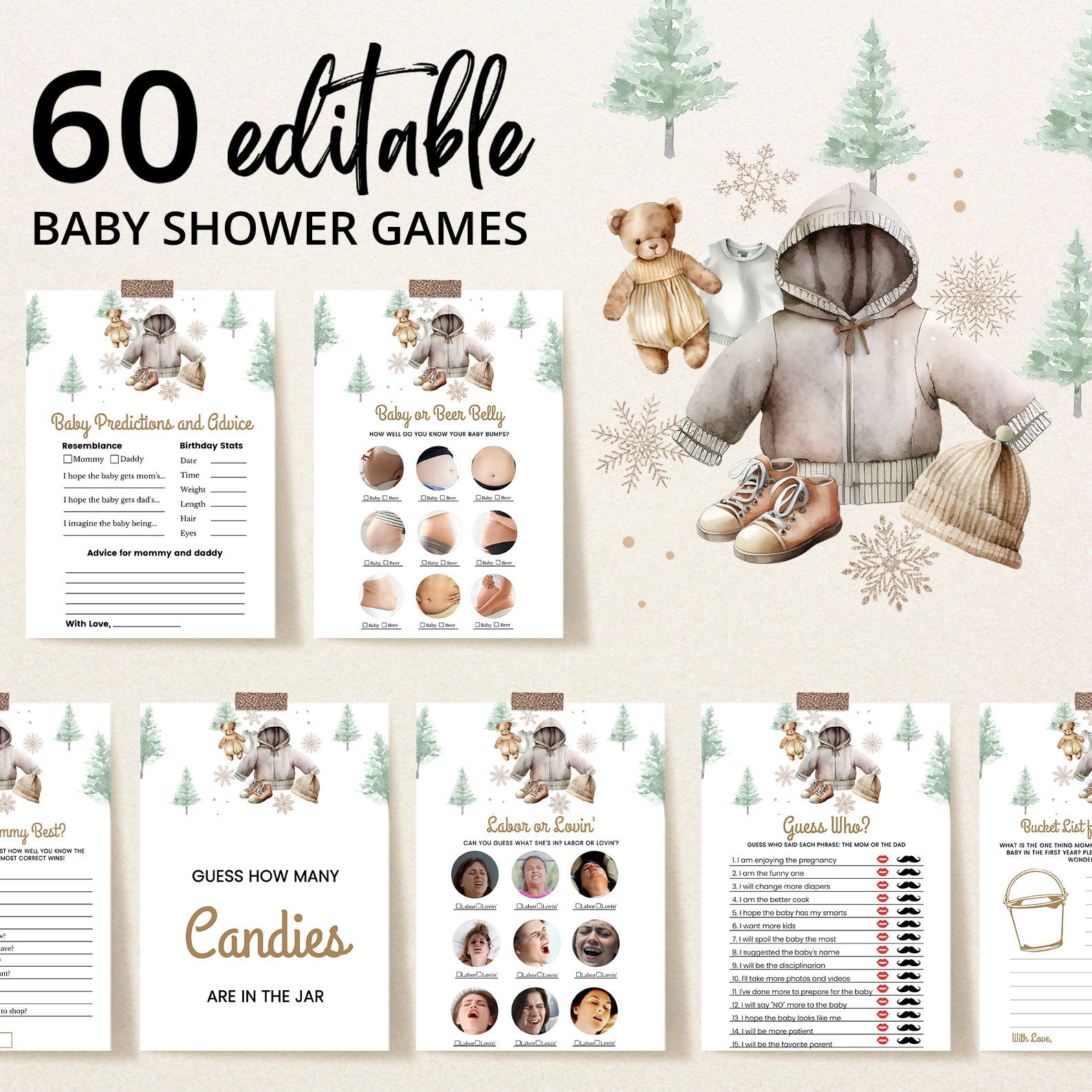 Keep the celebration lively with this 60-game editable baby shower bundle, designed with whimsical watercolor Christmas trees, an adorable teddy bear, and winter baby clothes surrounded by brown snowflakes. Each game is easy to customize and print, offering a mix of entertaining challenges and icebreakers. Perfect for adding seasonal charm and playful fun to your winter baby shower gathering.
