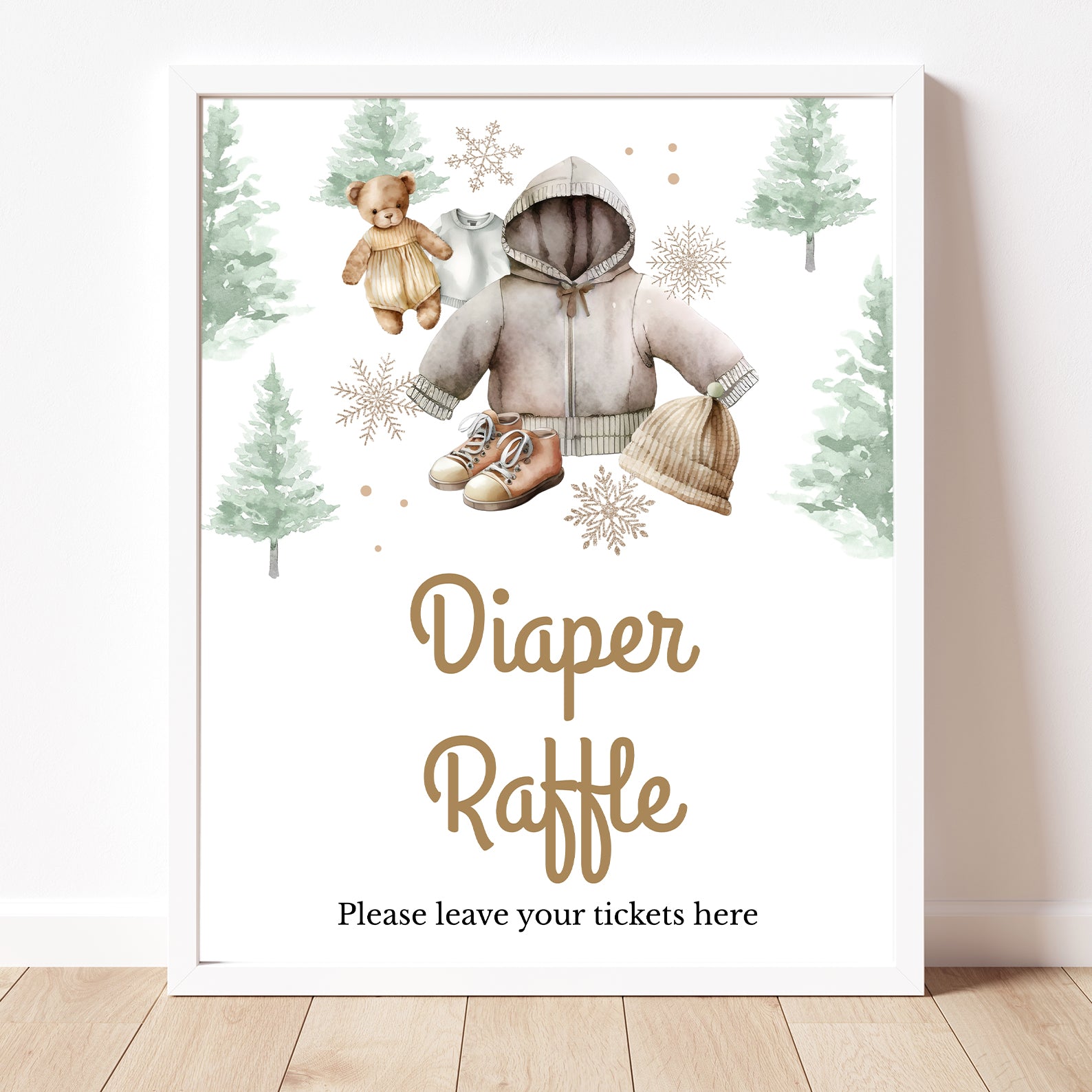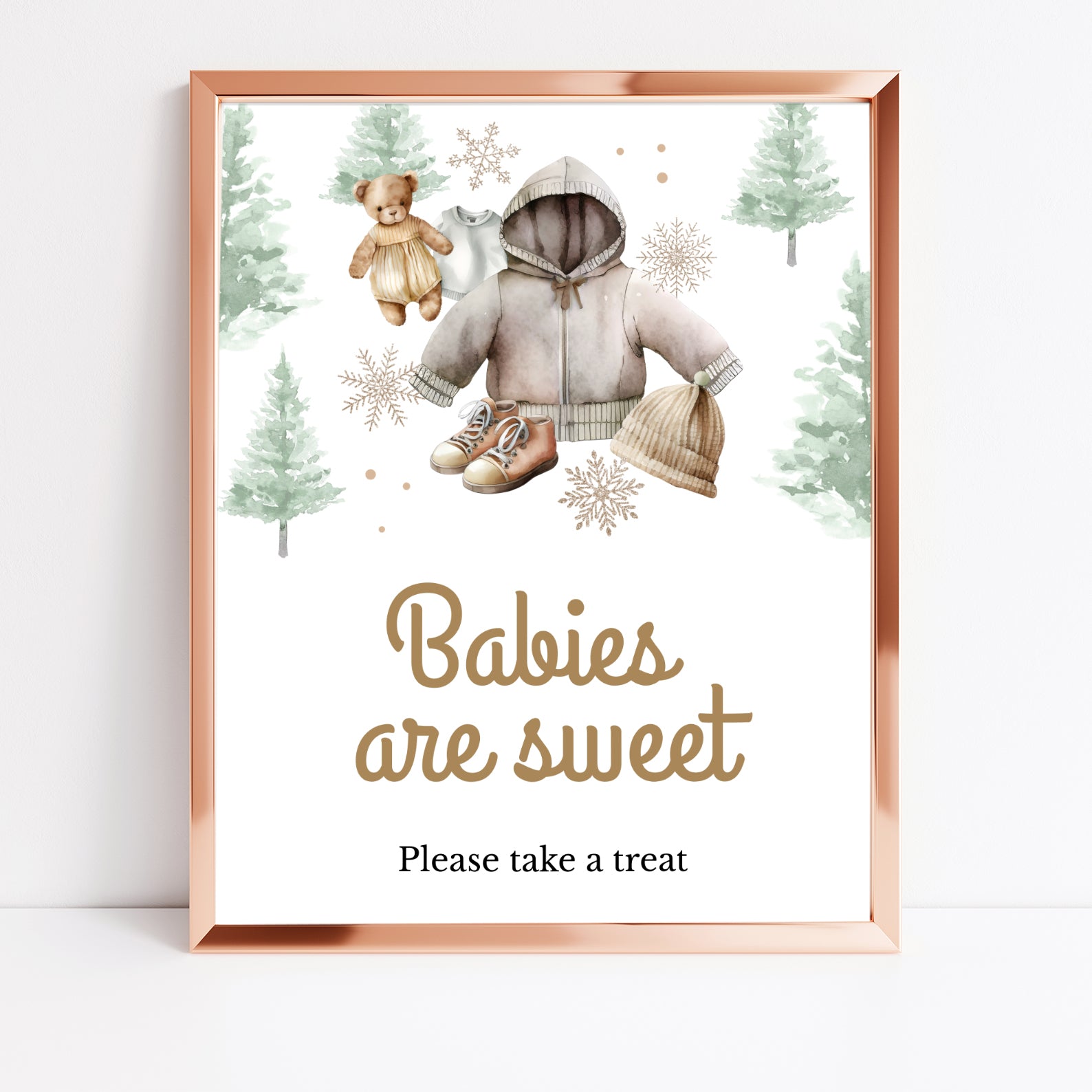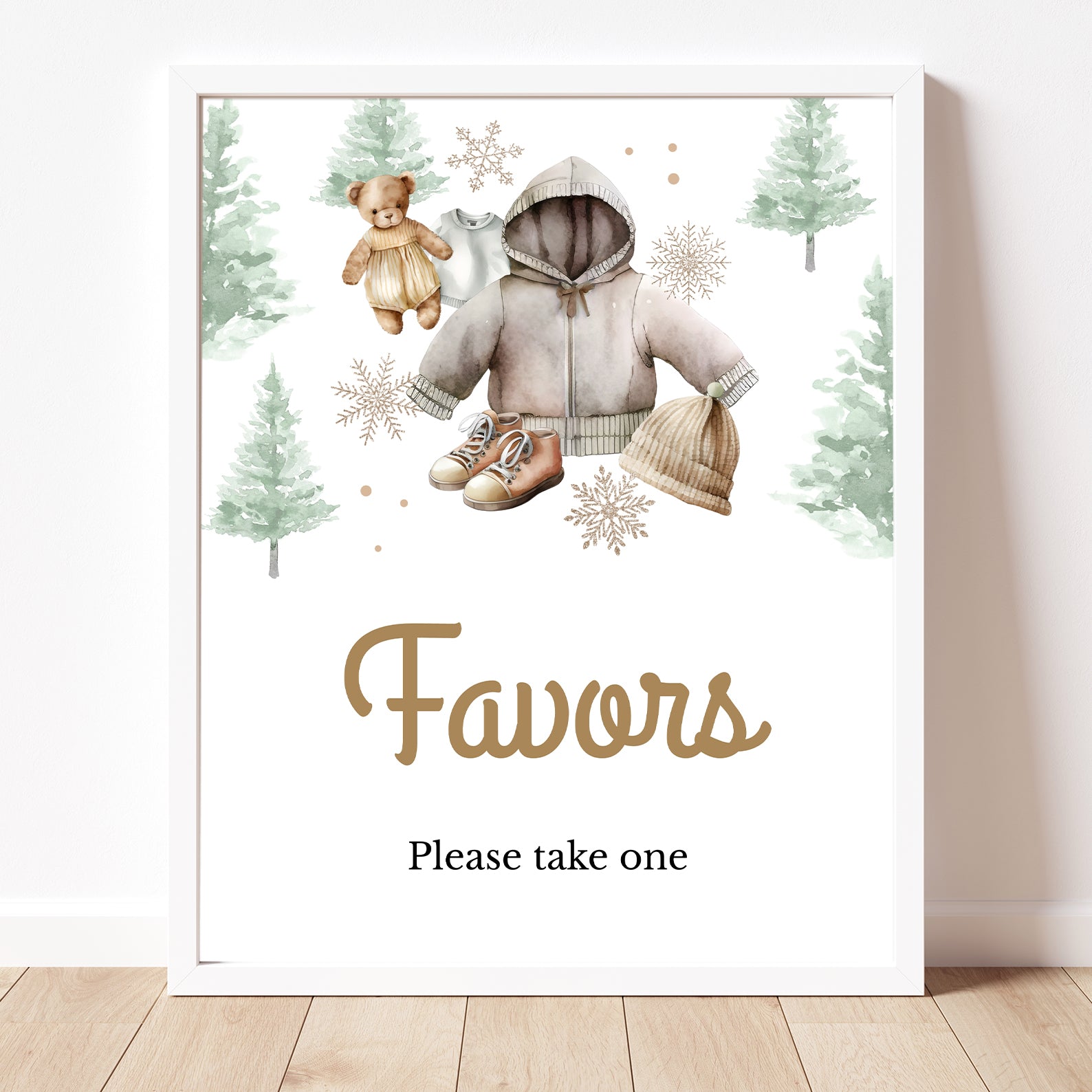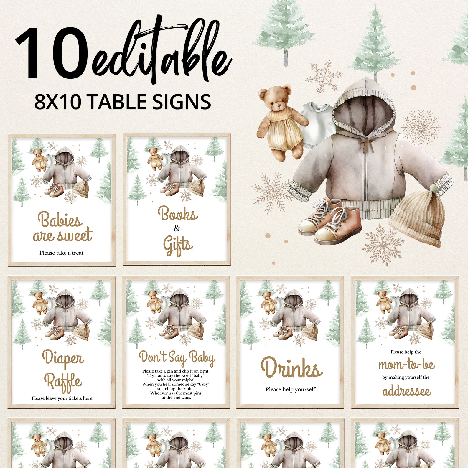 Complete your baby shower décor with this set of 10 editable table signs featuring charming watercolor Christmas trees, a cuddly teddy bear, a cozy winter baby hoodie, shoes, hat, and shirt, accented by delicate brown snowflakes. Includes: Babies Are Sweet, Books and Gifts, Diaper Raffle, Don’t Say Baby, Drinks, Envelope Station, Favors, Food, Late Night Diapers, and Mom-osa Bar. Perfect for a warm, festive, and coordinated winter celebration.