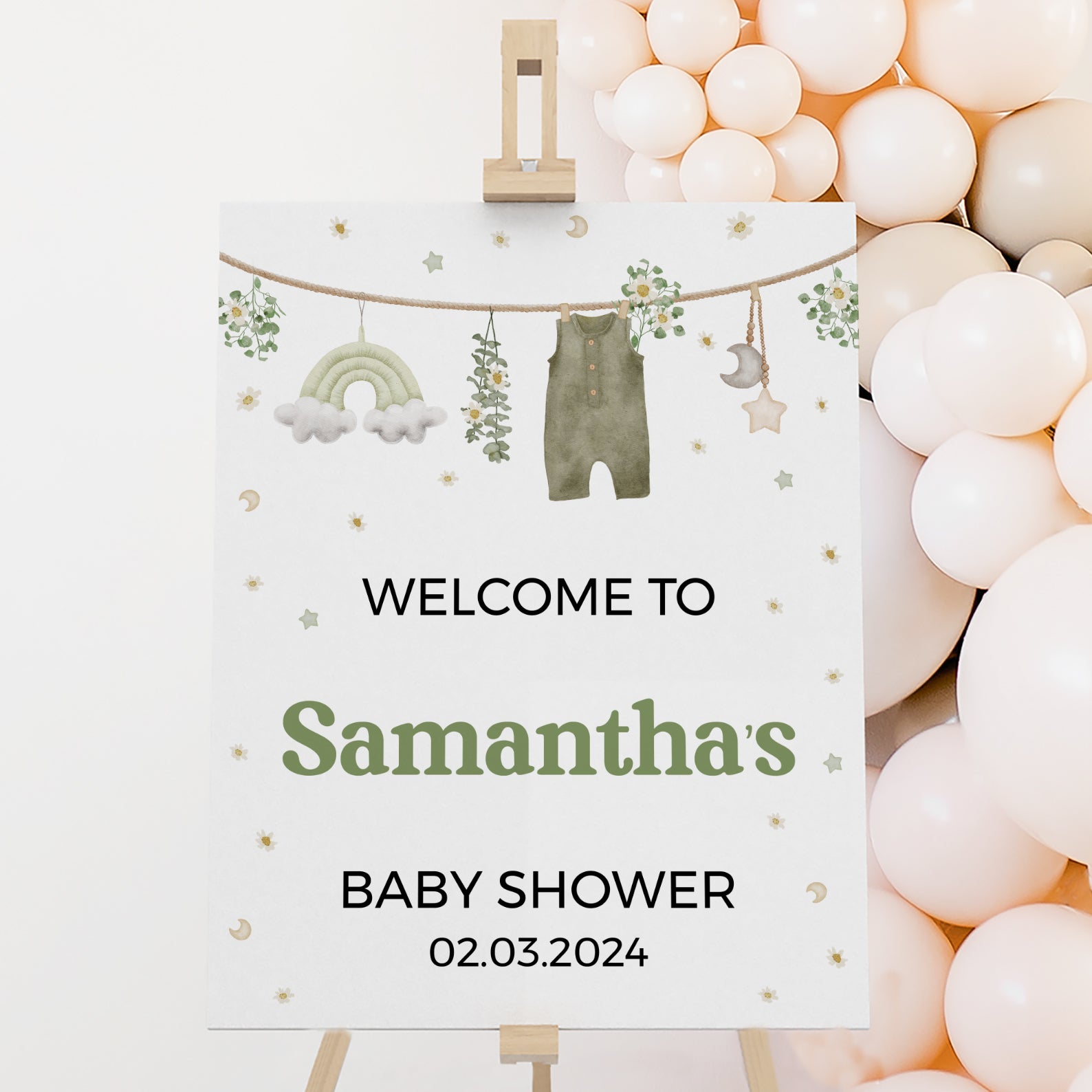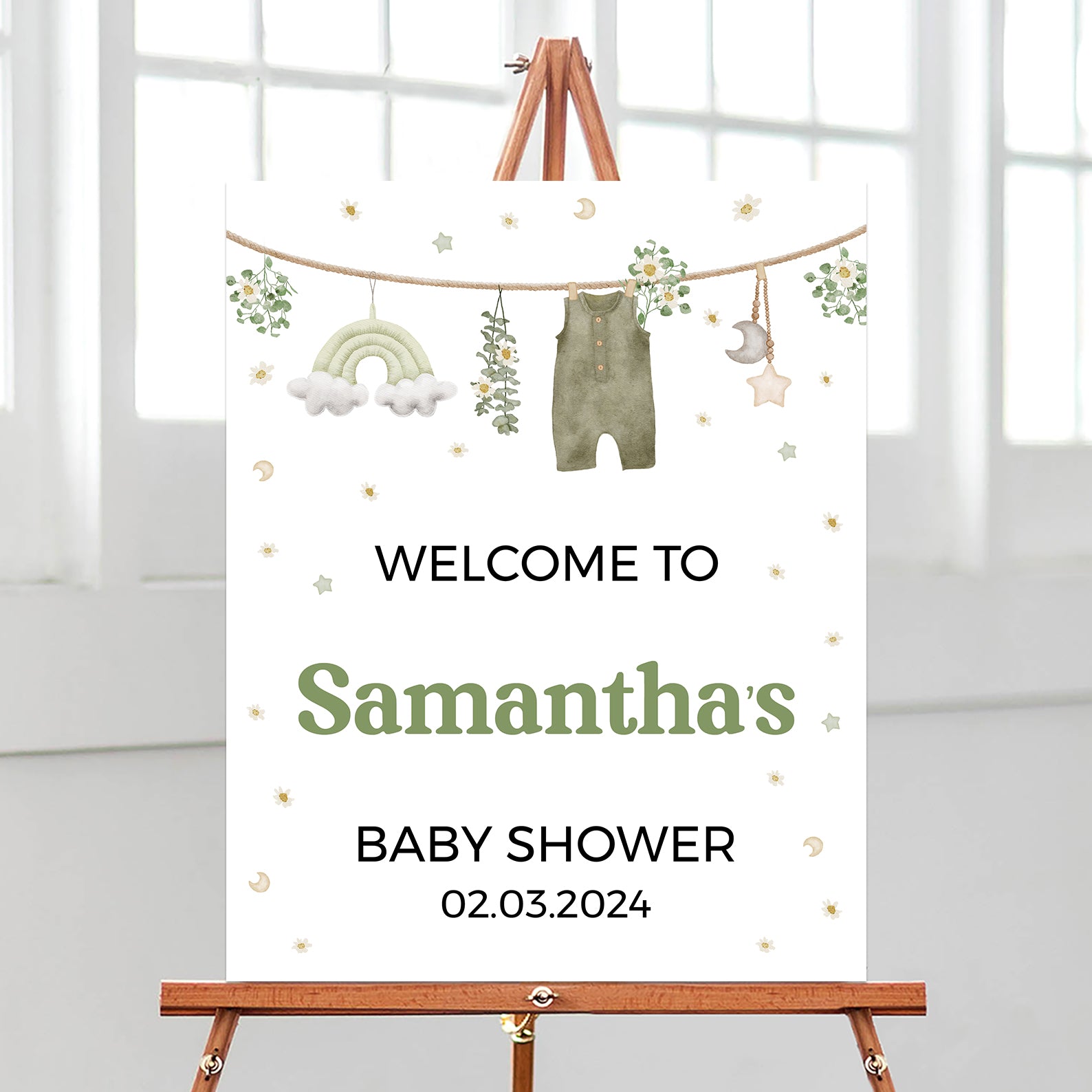 Welcome your guests with this charming winter baby shower sign! Featuring a boho rainbow, cozy green baby jumpsuit, lush floral accents, and whimsical stars and moons, it's the perfect touch to set a joyful tone for your special celebration.