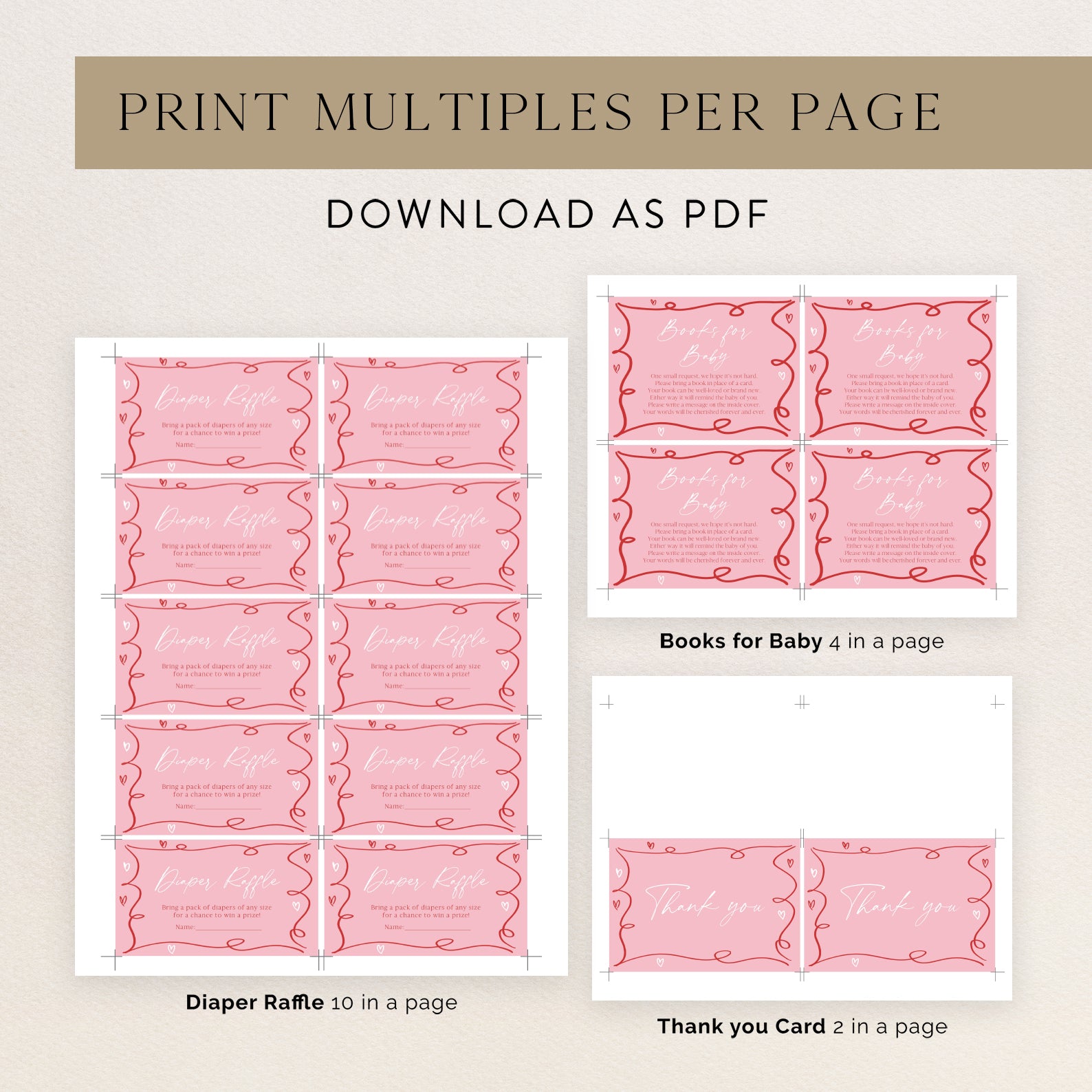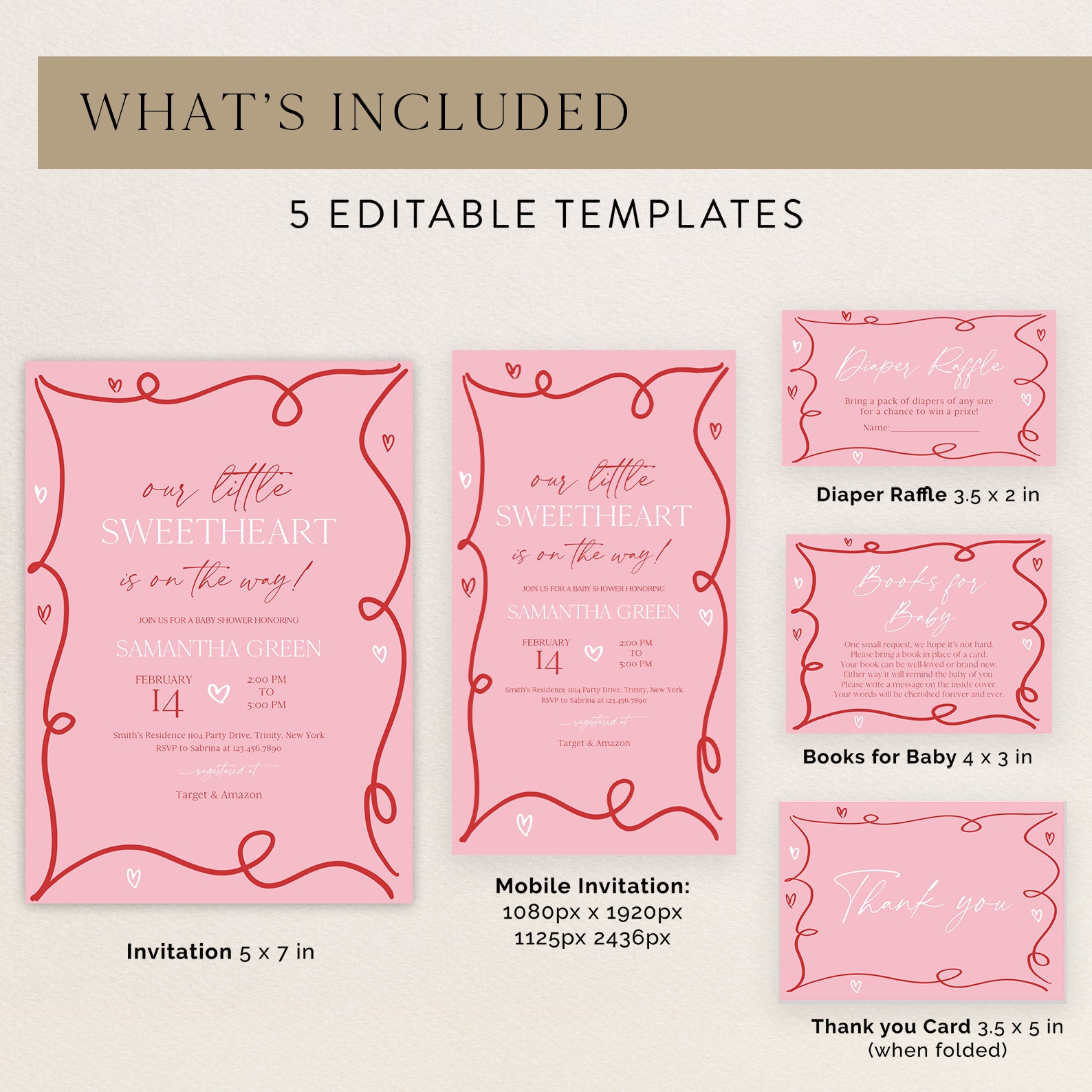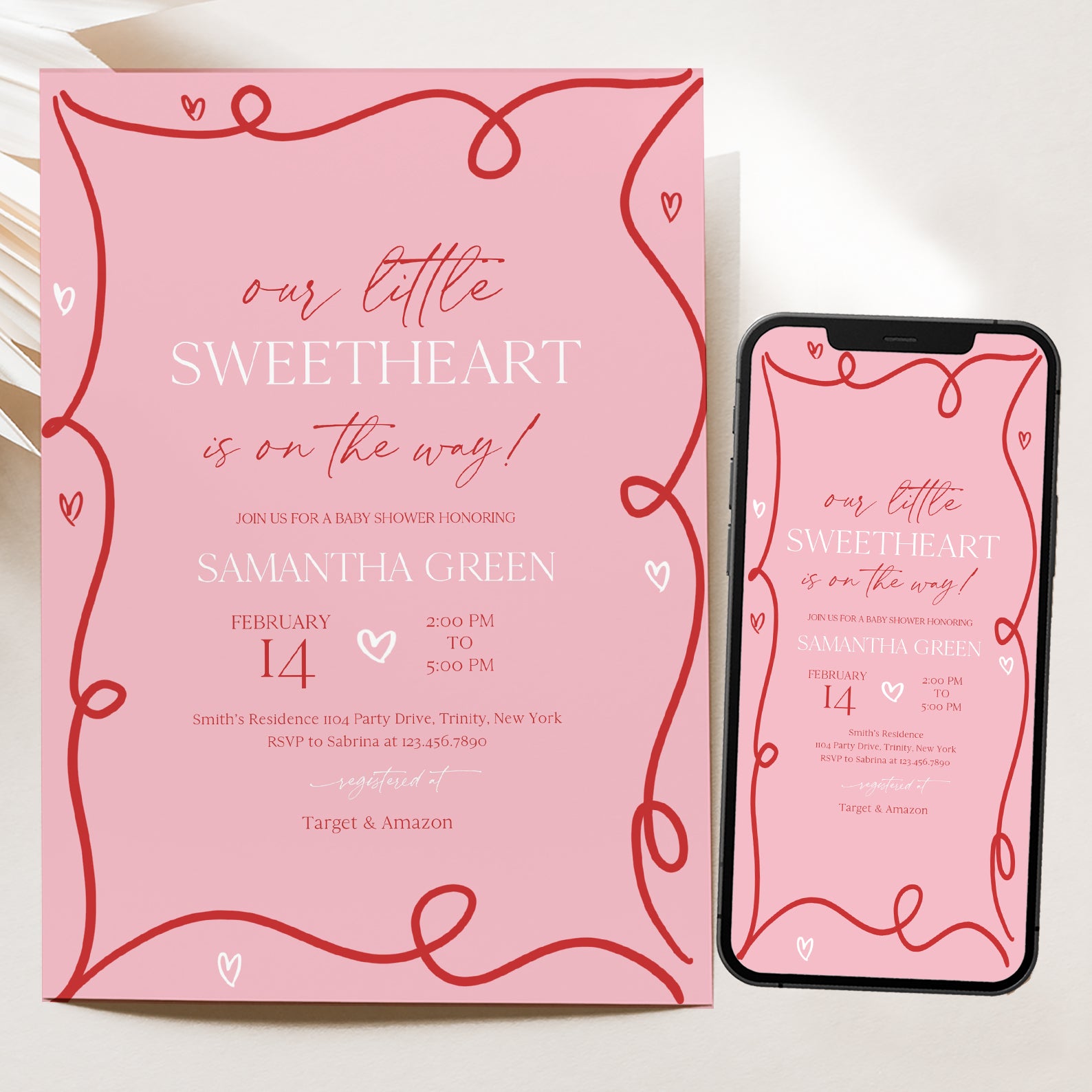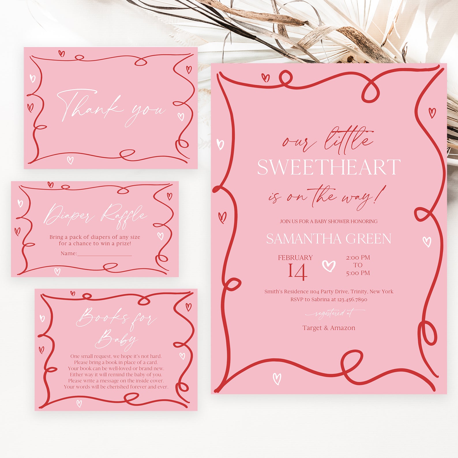 Share the excitement of welcoming your little sweetheart with this adorable spring baby shower invitation bundle. Featuring a charming red coquette ribbon border and a soft pink background with playful white and red hearts, it includes everything you need—invitation, mobile invite, diaper raffle, books for baby, and thank you card. Ideal for a joyful and love-filled celebration!