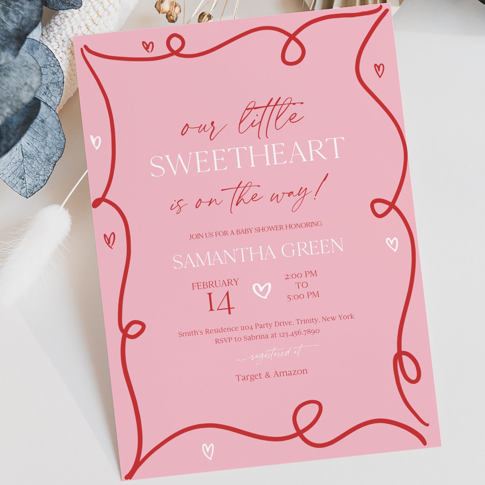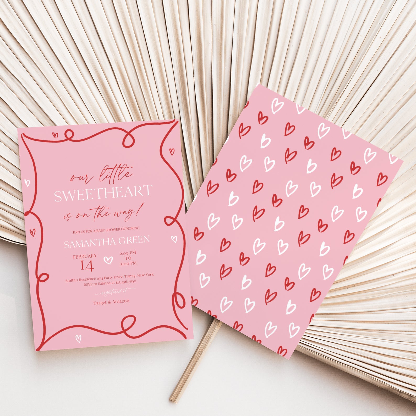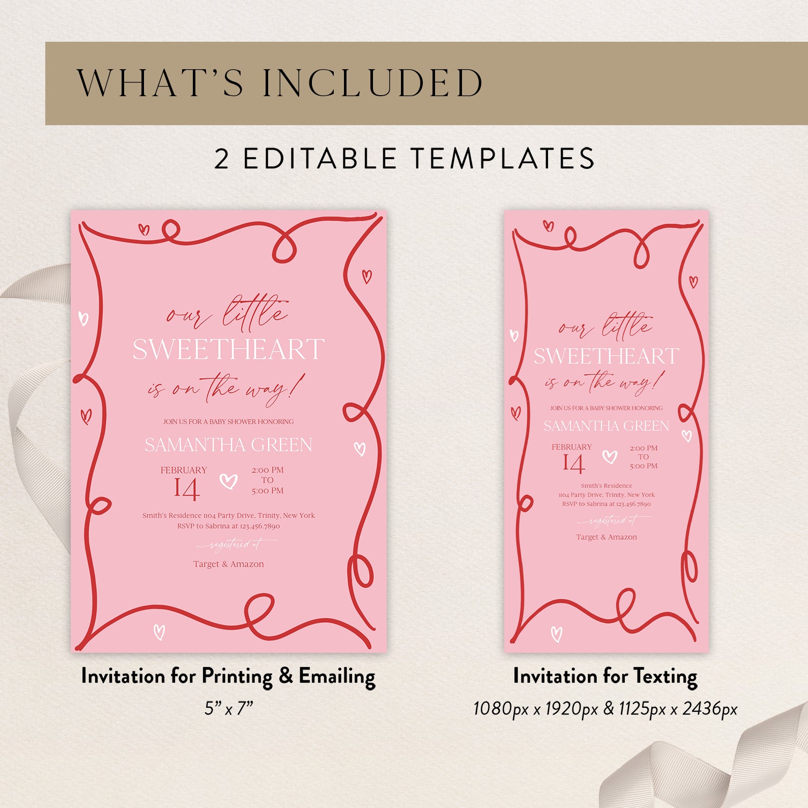 - Purchase this Valentine's Baby Shower Invite Bundle with Red Ribbon & Pink Hearts template
