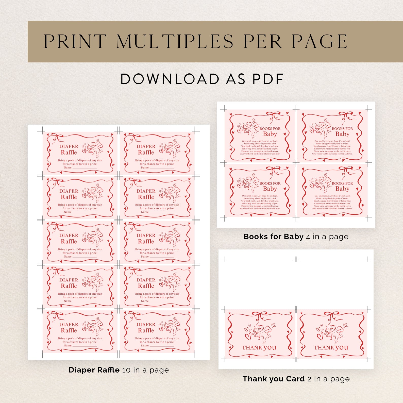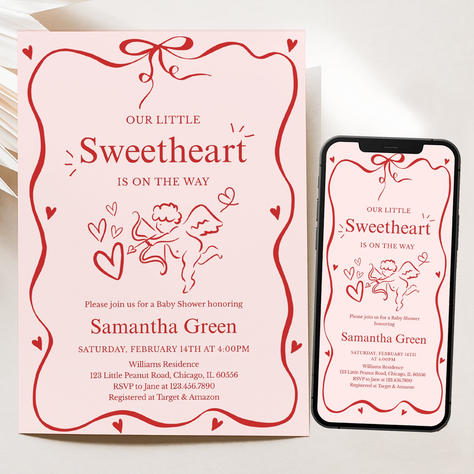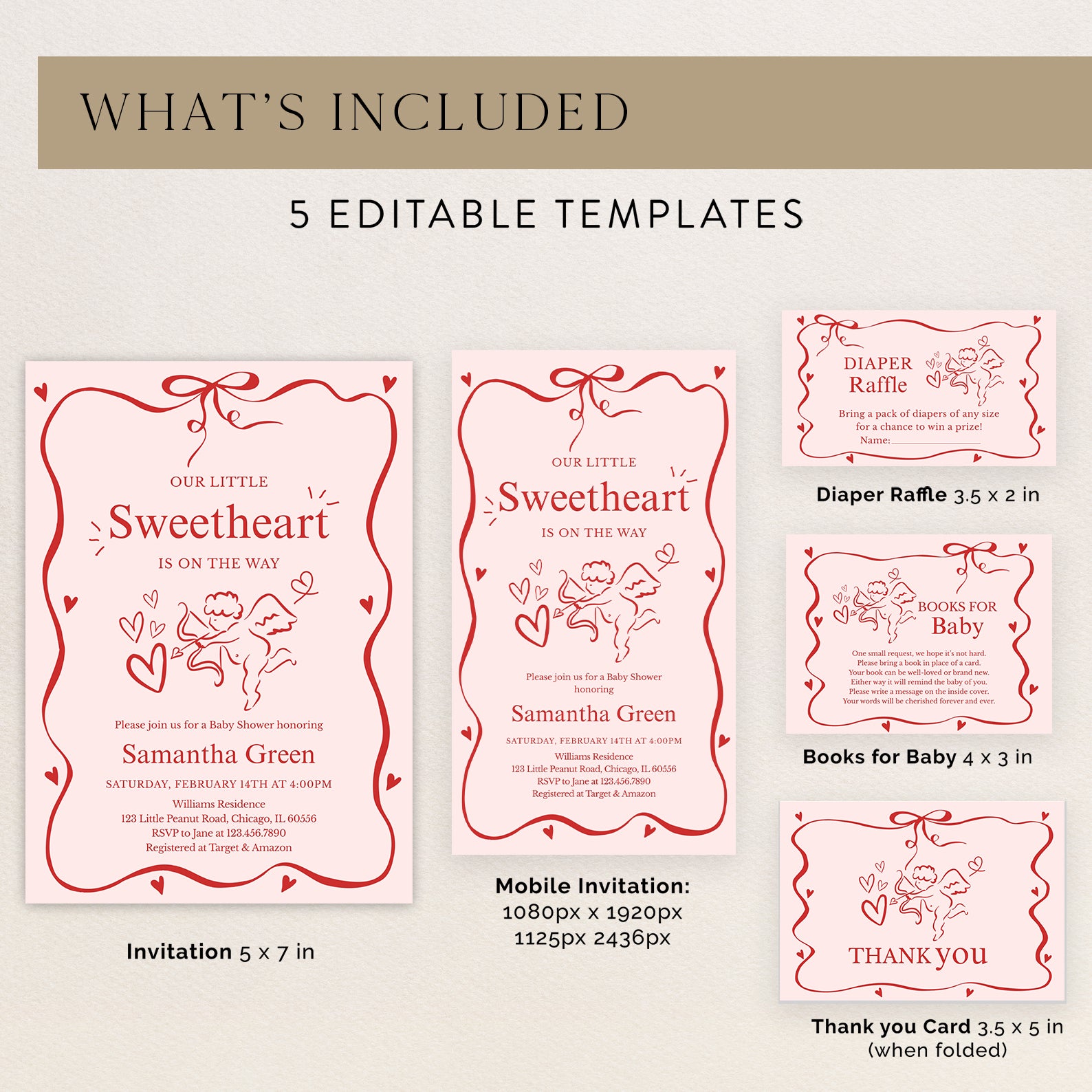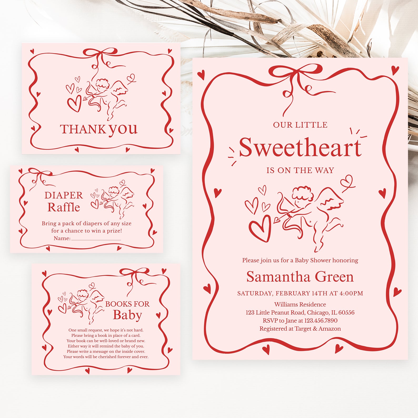 Celebrate your little sweetheart with this Valentine’s-inspired baby shower bundle. Featuring a red coquette ribbon border, playful hearts, and a charming cupid, this set includes an invitation, mobile invite, diaper raffle, books for baby, and a thank you card—perfect for a love-filled celebration!