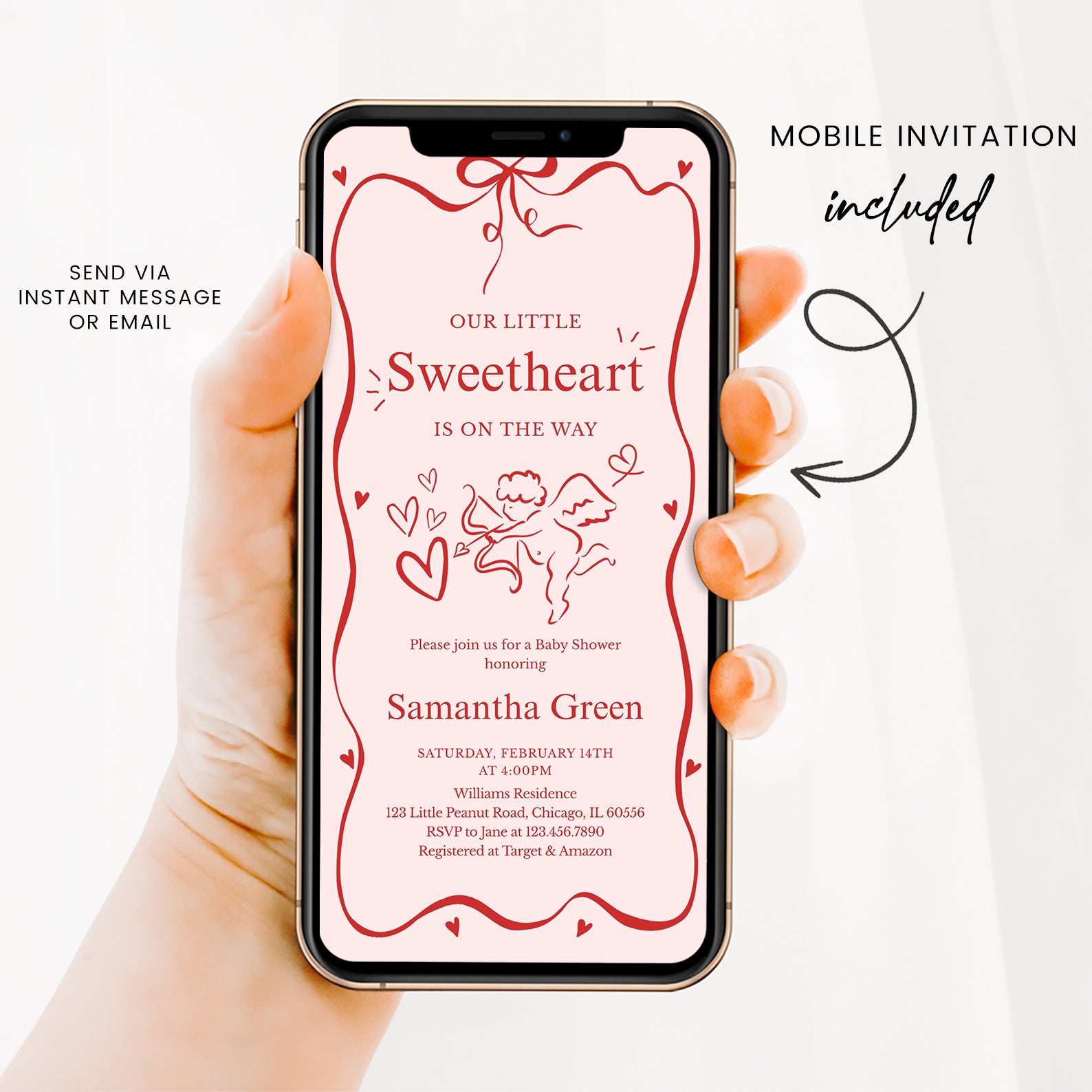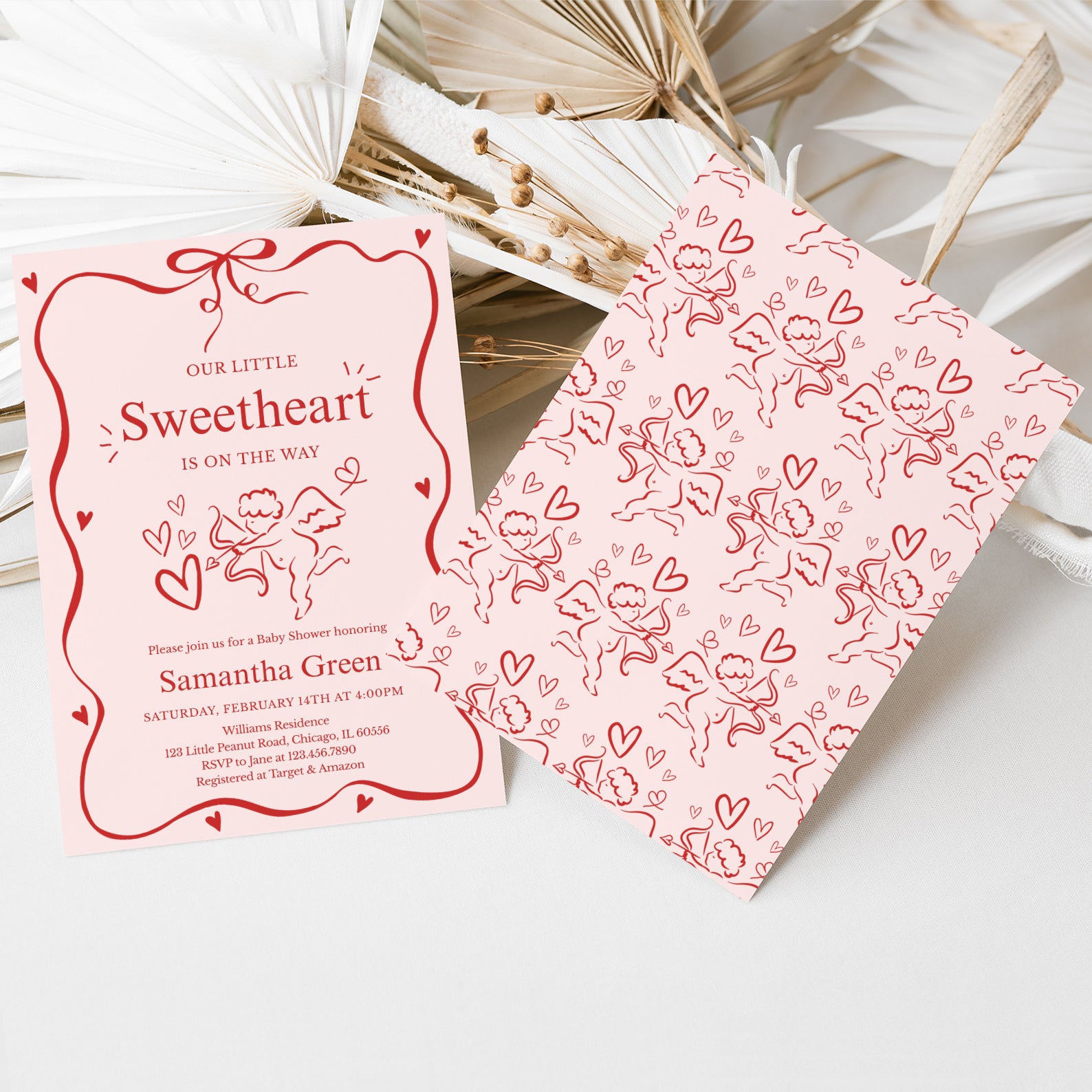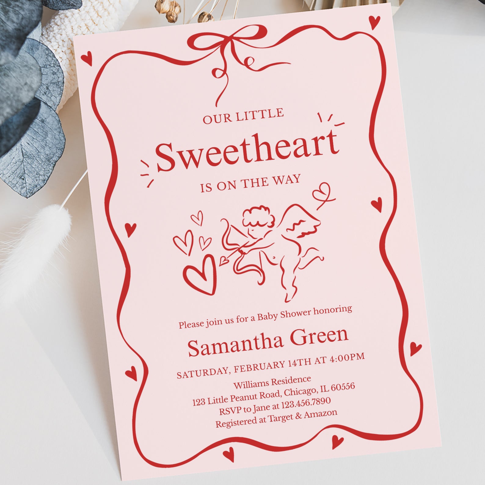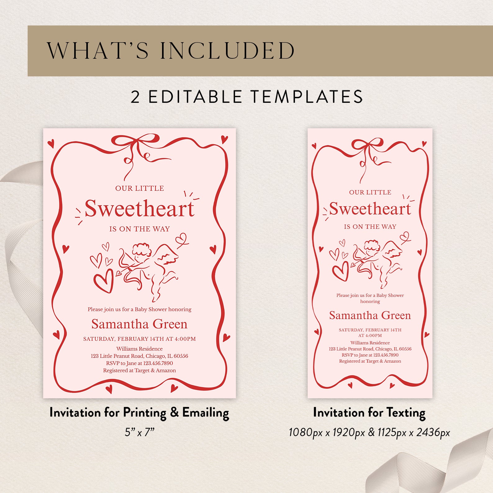 Celebrate your little sweetheart with this Valentine’s-inspired baby shower bundle. Featuring a red coquette ribbon border, playful hearts, and a charming cupid, this set includes an invitation, mobile invite, diaper raffle, books for baby, and a thank you card—perfect for a love-filled celebration!