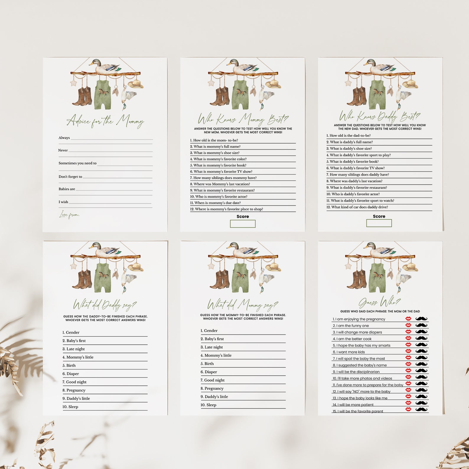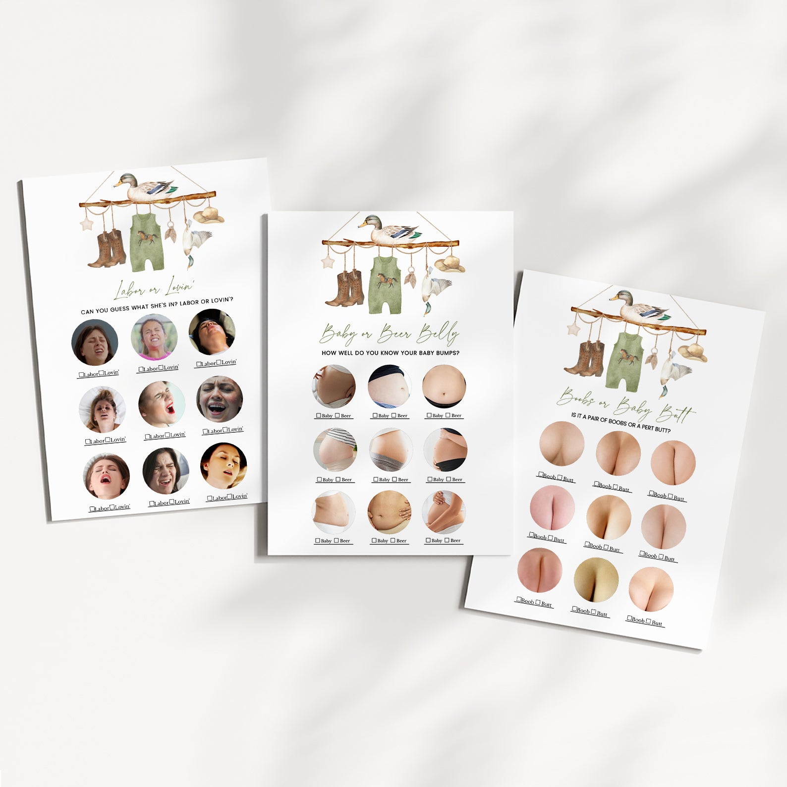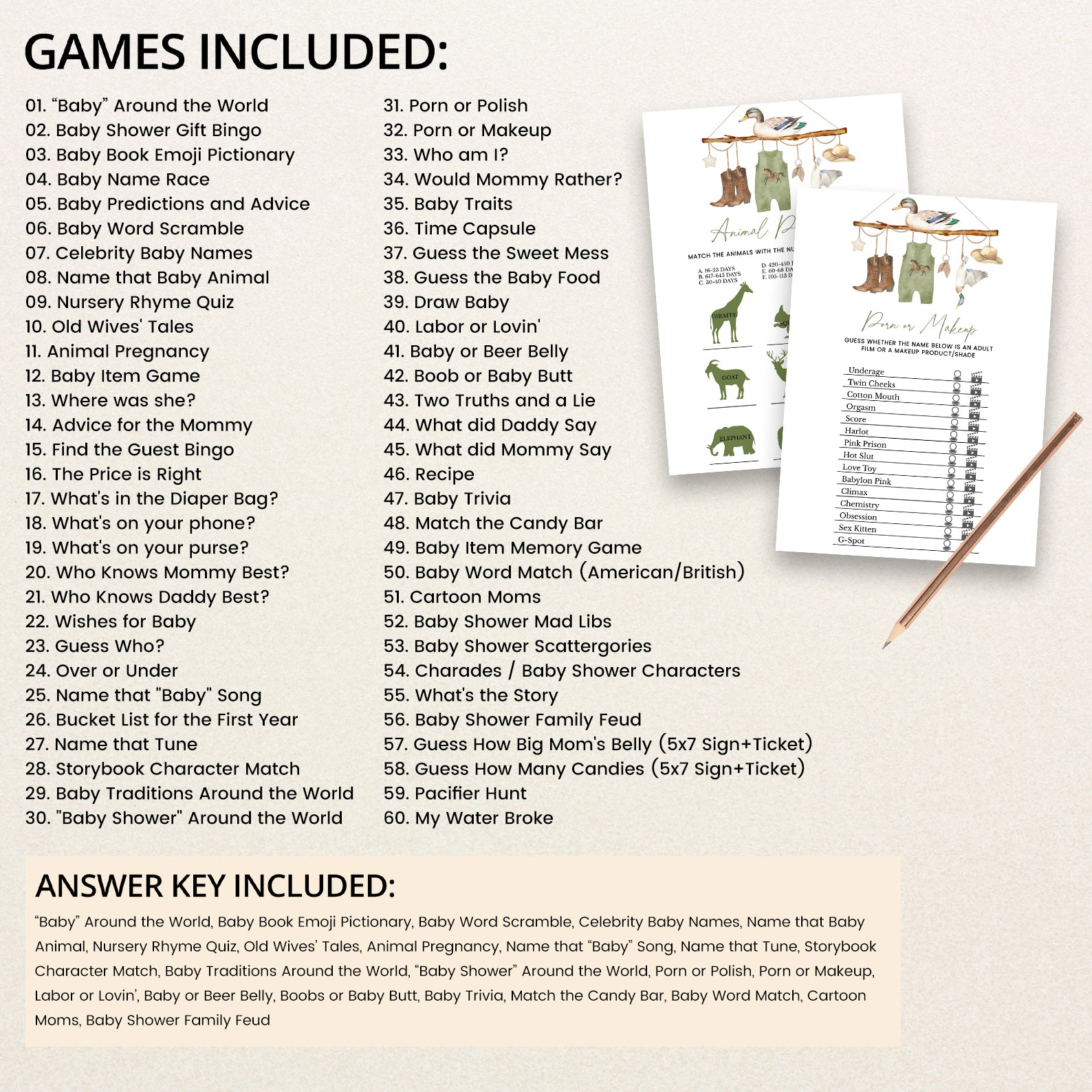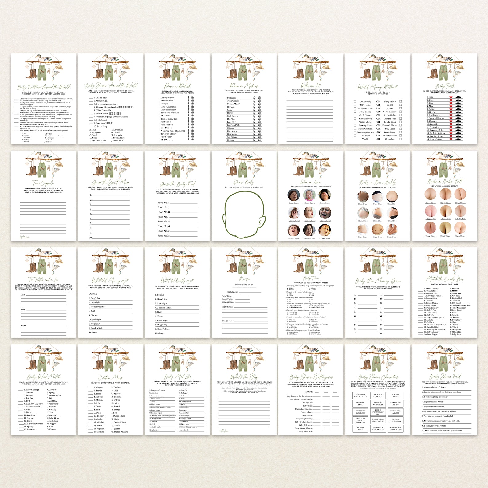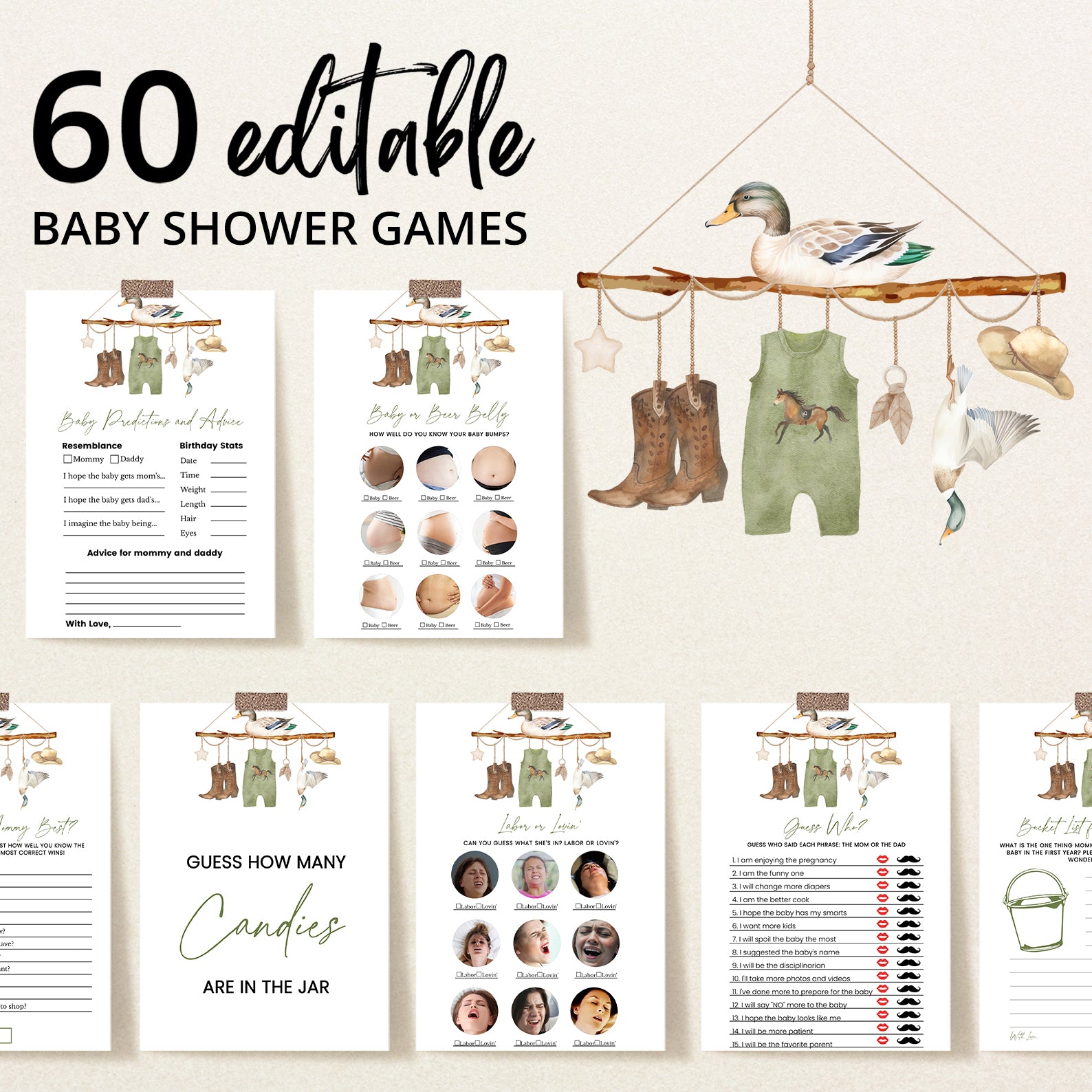 Bring the spirit of adventure to your baby shower with this exciting bundle of 60 editable baby shower games, designed to perfectly complement your rustic, outdoorsy theme. Featuring playful elements like cowboy boots, a baby jumpsuit with a horse print, and whimsical touches like hanging ducks and straw hats, this collection captures the fun of the great outdoors. Fully customizable, each game is easy to personalize, making it perfect for a lively and memorable celebration. Whether you're hosting a country-style gathering or a nature-inspired shower, this bundle adds an extra dose of fun and excitement for your guests.