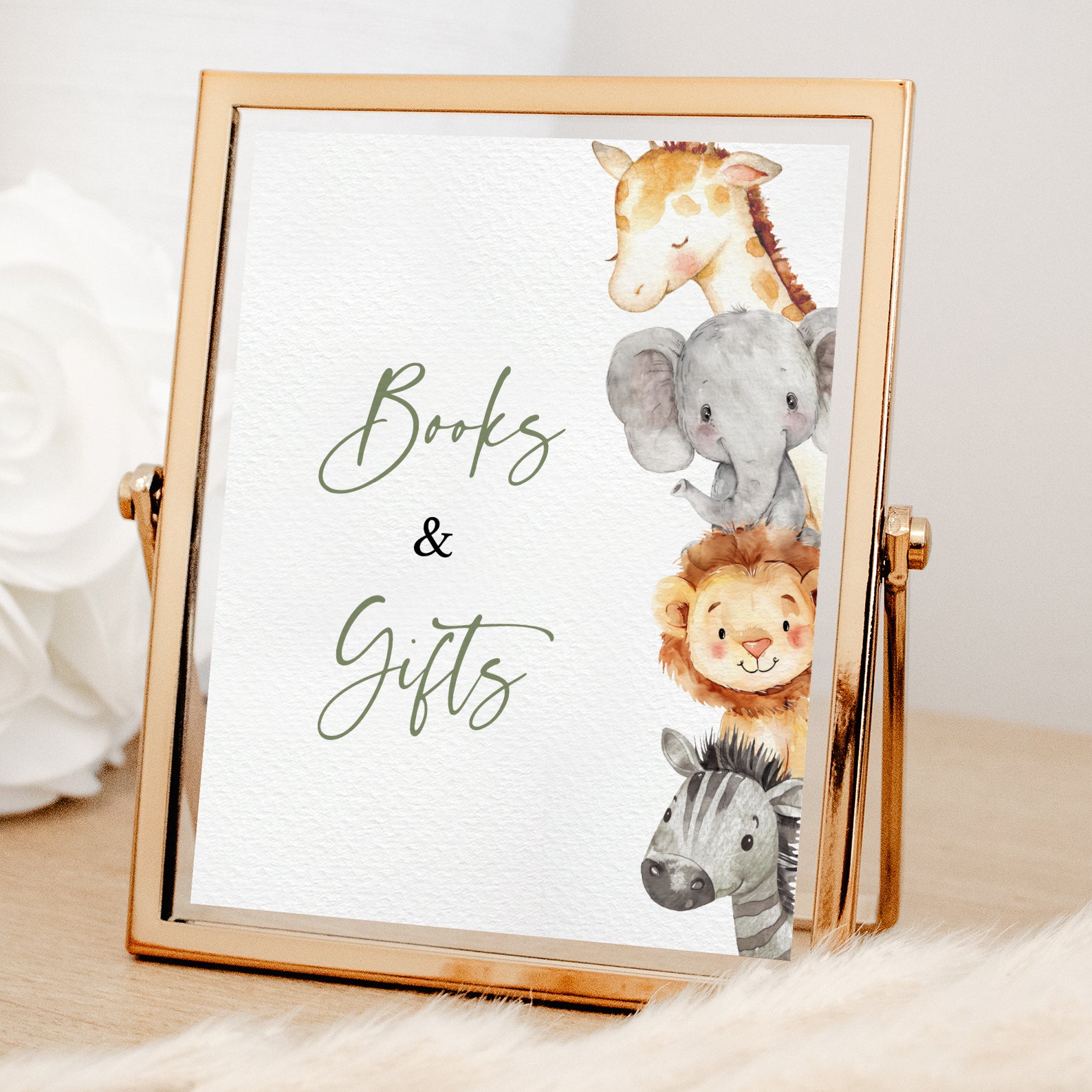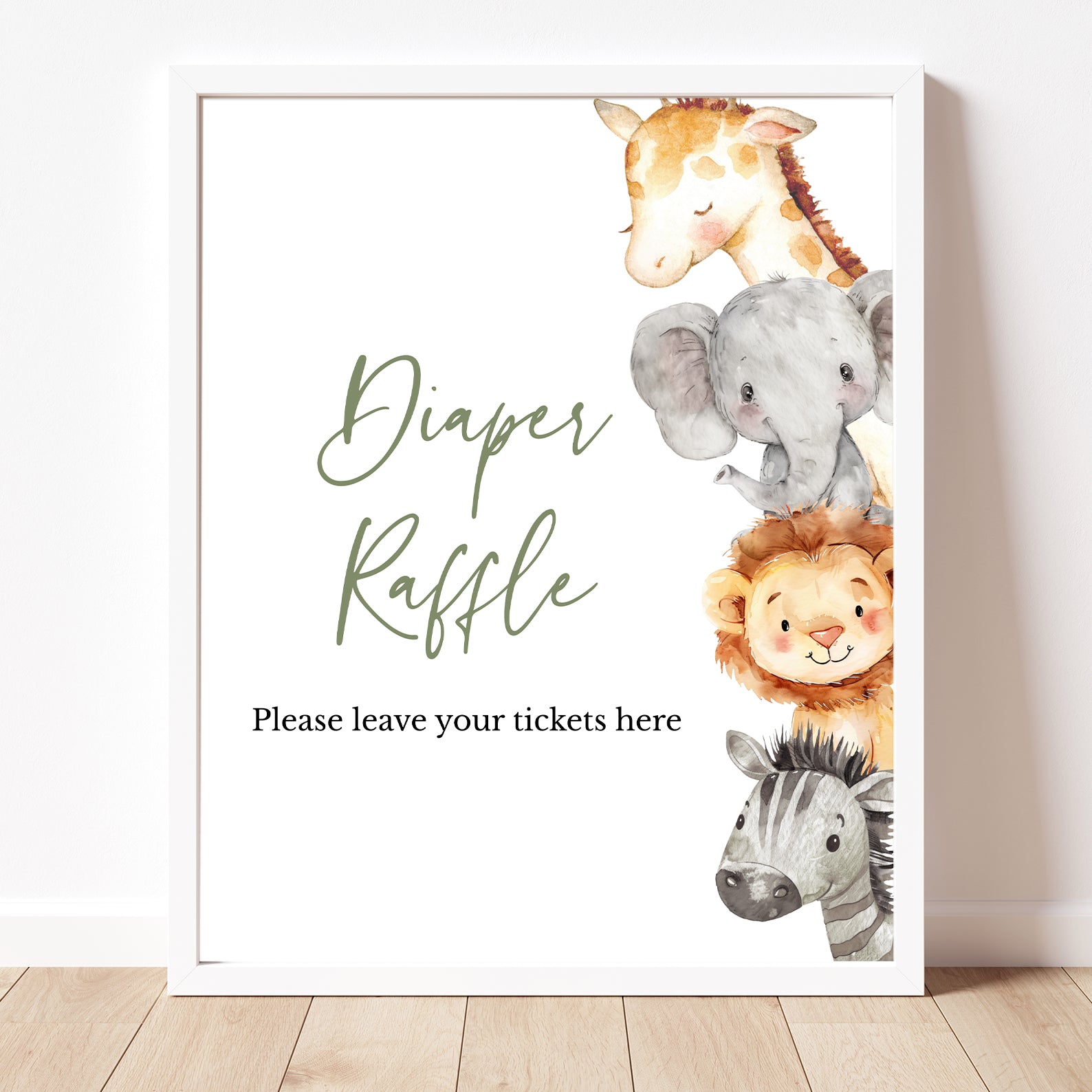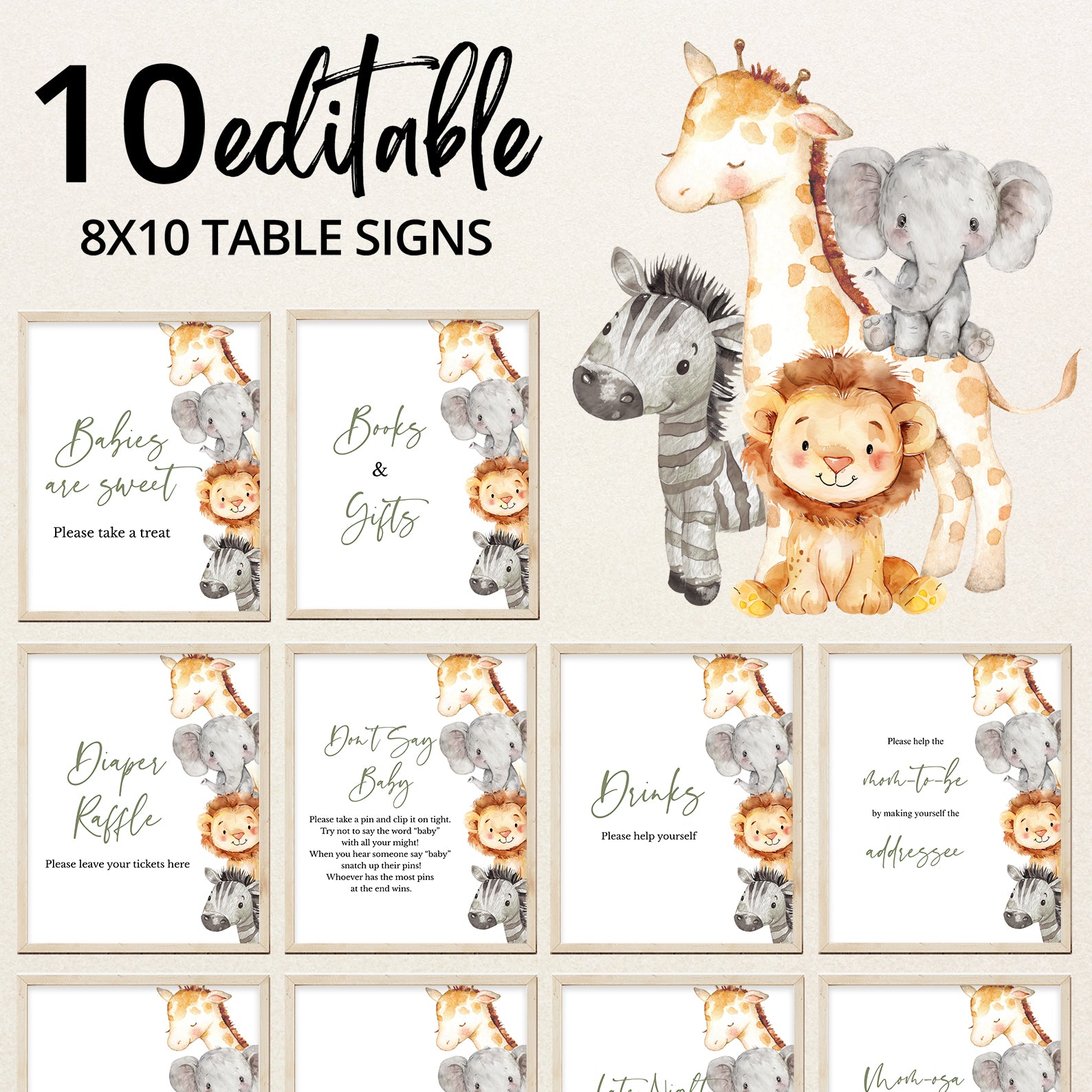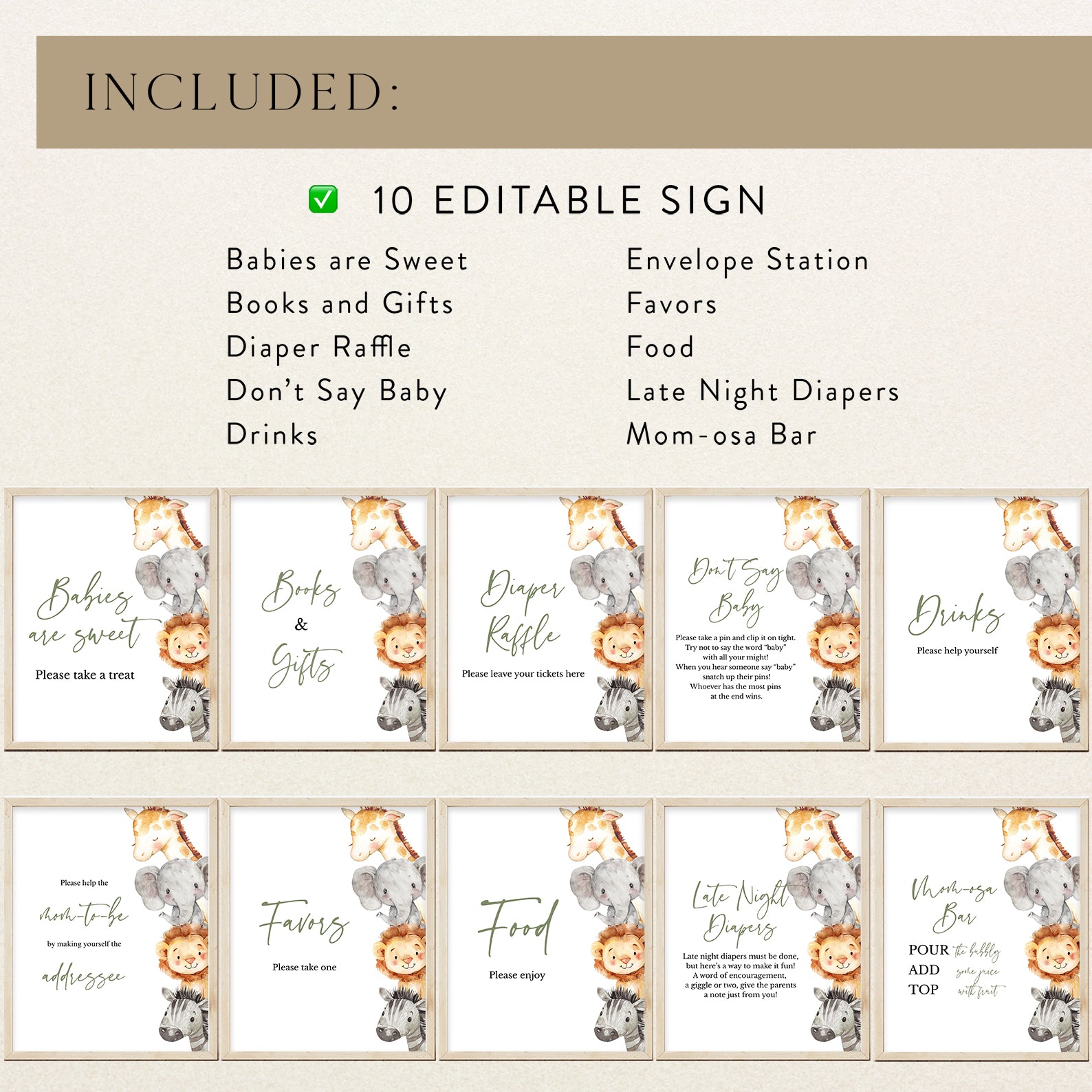 Bring the wild charm of the safari to your baby shower with this set of ten editable table signs featuring adorable animals like a giraffe, elephant, lion, and zebra. Designed with soft greenery and playful safari accents, these signs add a touch of adventure to your celebration. The set includes Babies Are Sweet, Books and Gifts, Diaper Raffle, Don't Say Baby, Drinks, Envelope Station, Favors, Food, Late Night Diapers, and Mom-osa Bar, making it perfect for a fun and memorable event!