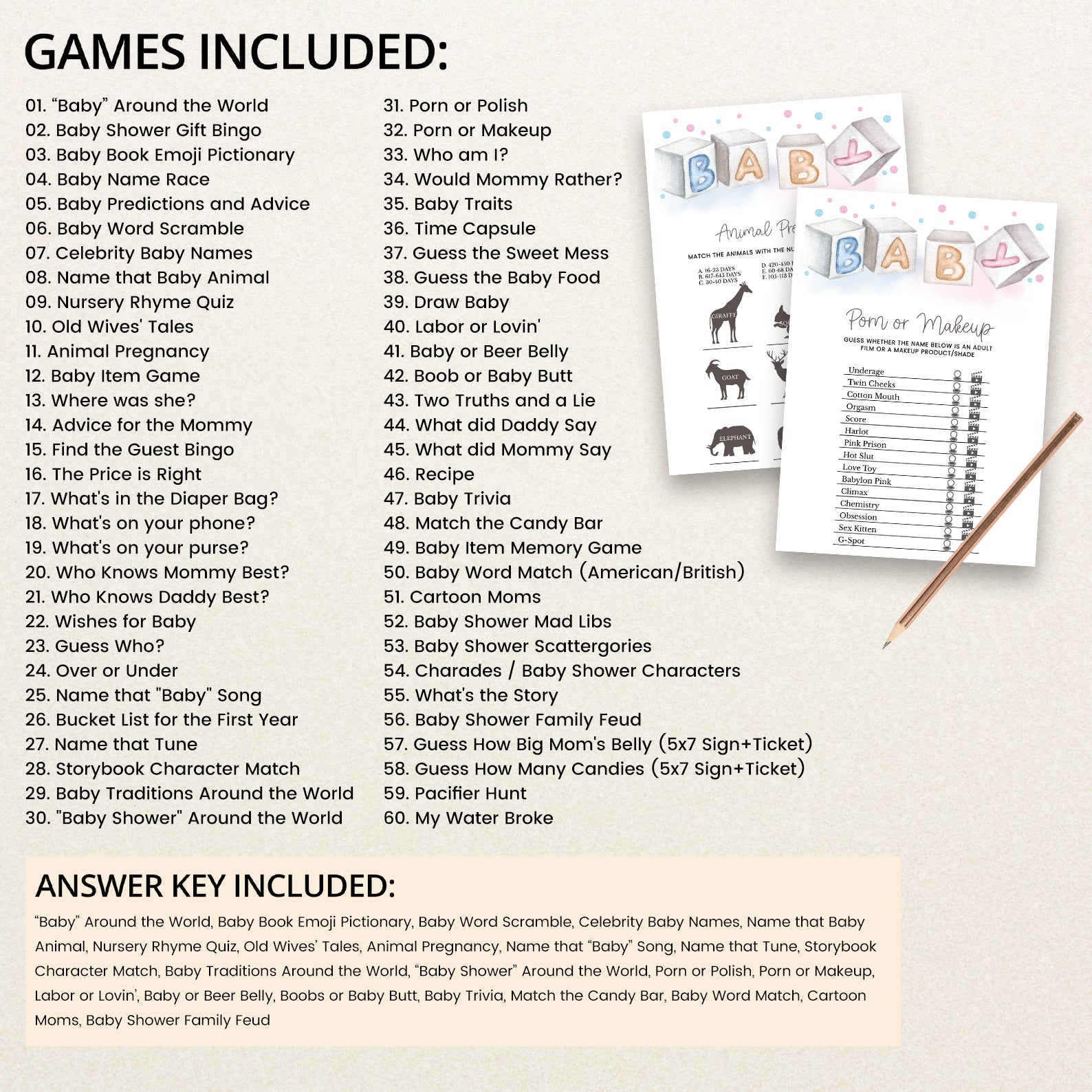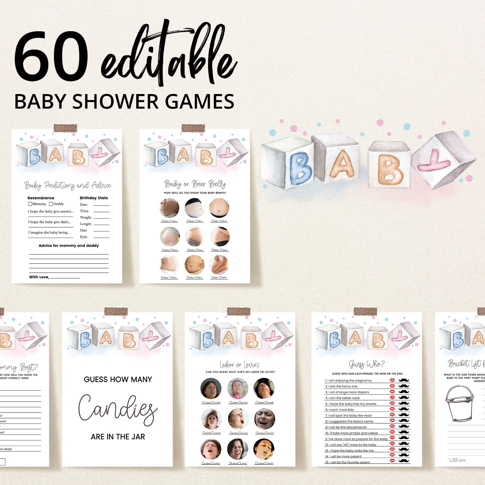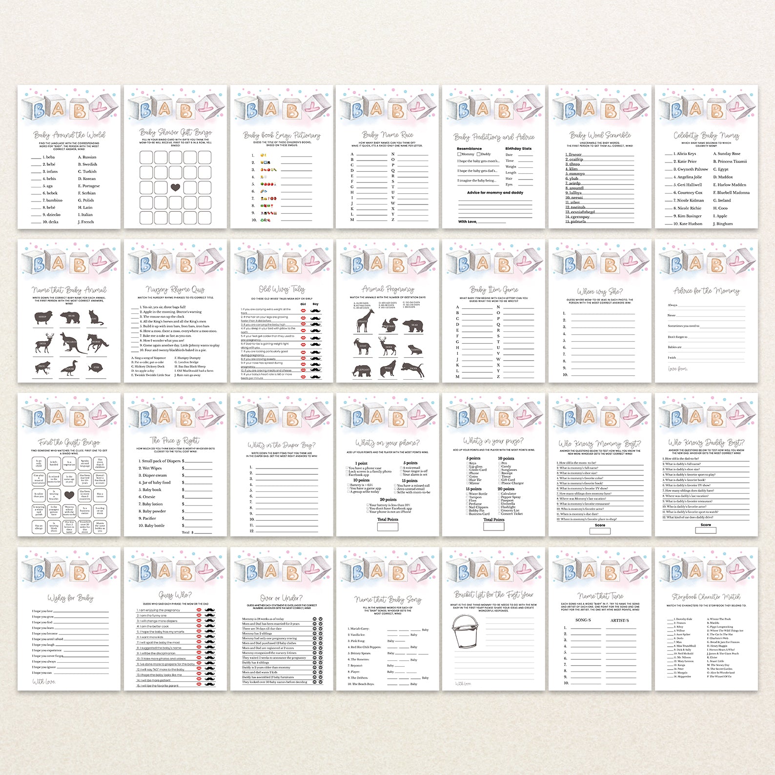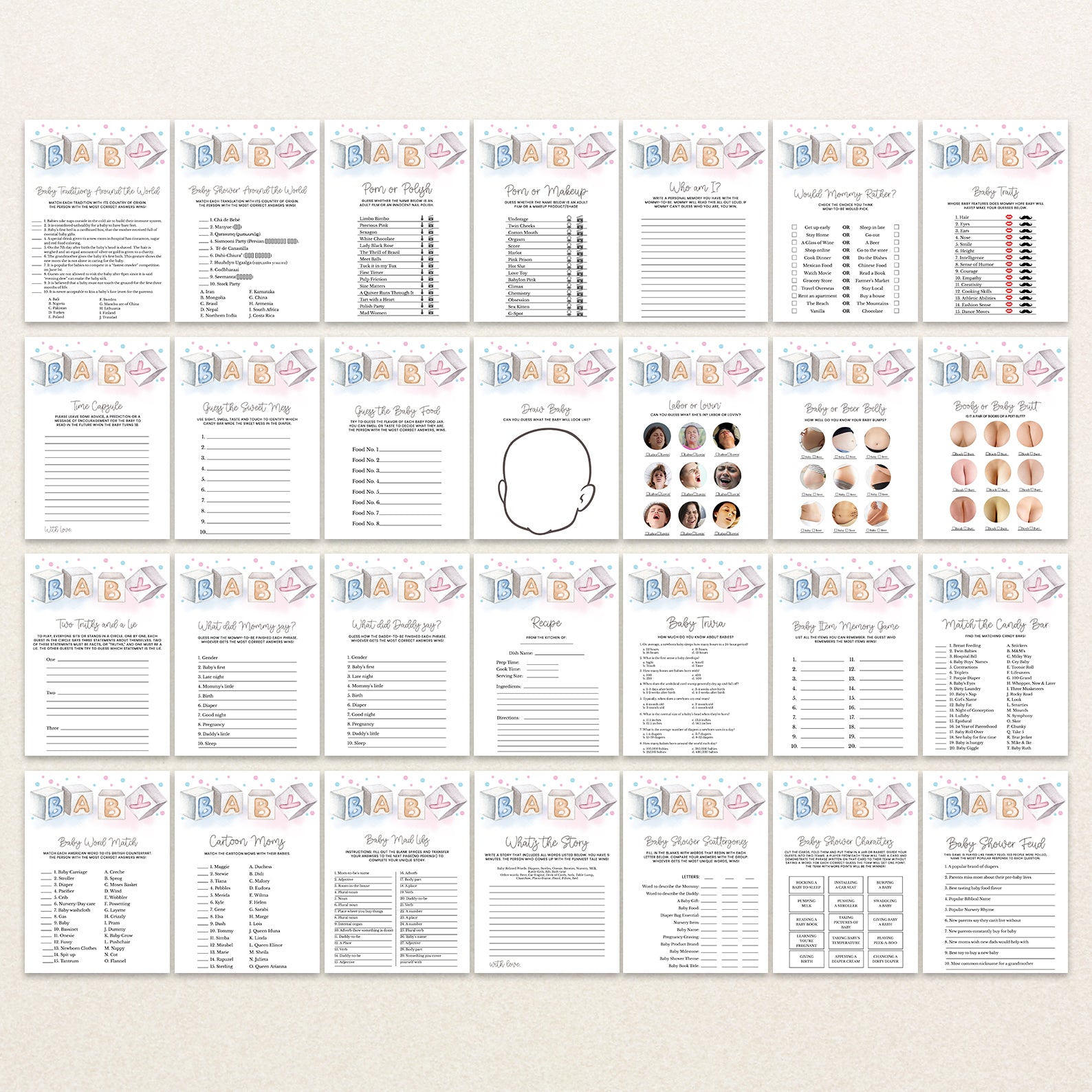 Celebrate your little one’s arrival with our Minimalist Gender Reveal Game Bundle! This bundle includes 60 fun and interactive games, inspired by soft pink and blue hues, and designed to match the minimalist charm of the gender reveal theme. With playful baby blocks and bubble accents, this game bundle adds a touch of fun and elegance to your celebration, ensuring your guests enjoy every moment as you reveal the exciting news. Perfect for modern parents-to-be, it’s the ideal way to keep your guests entertained!