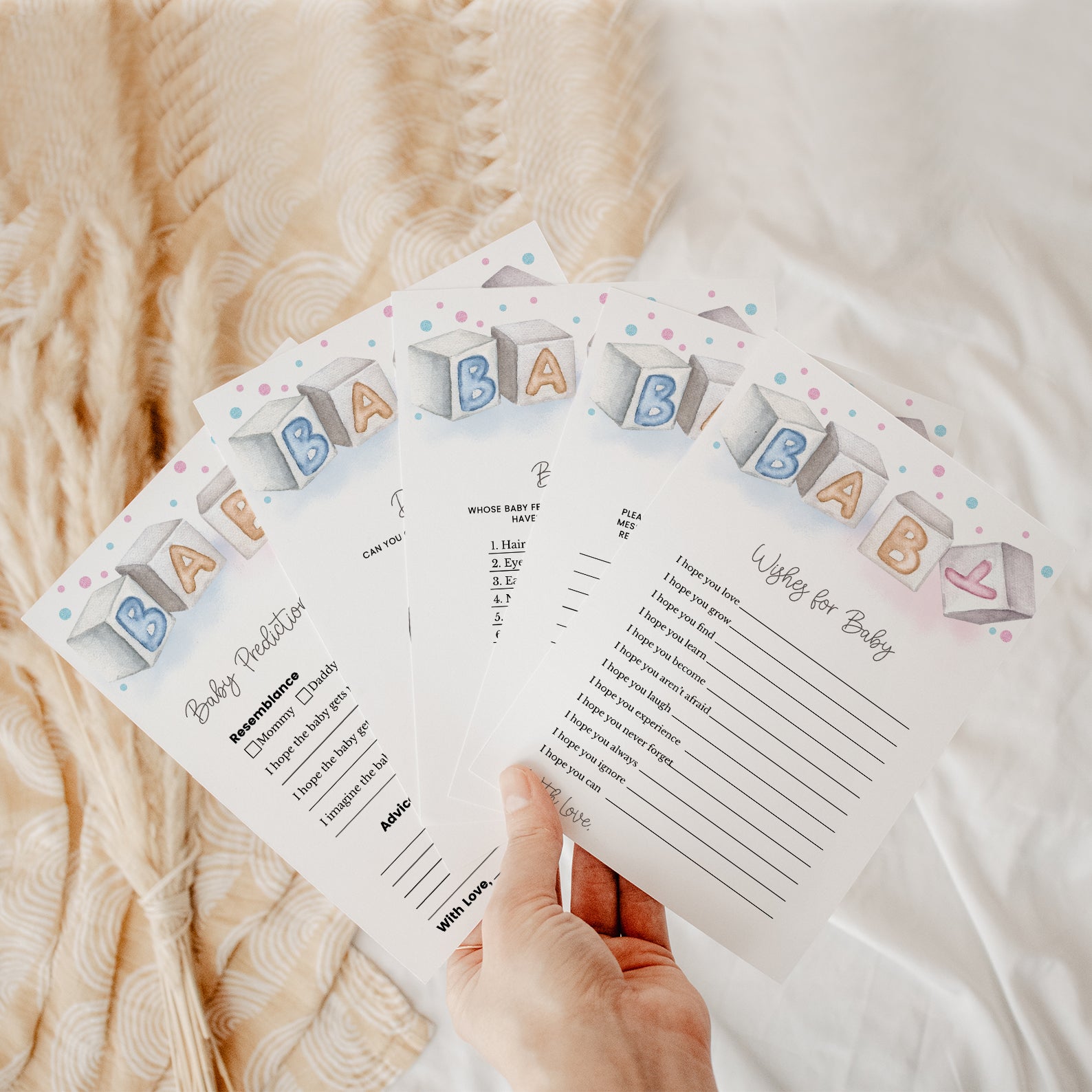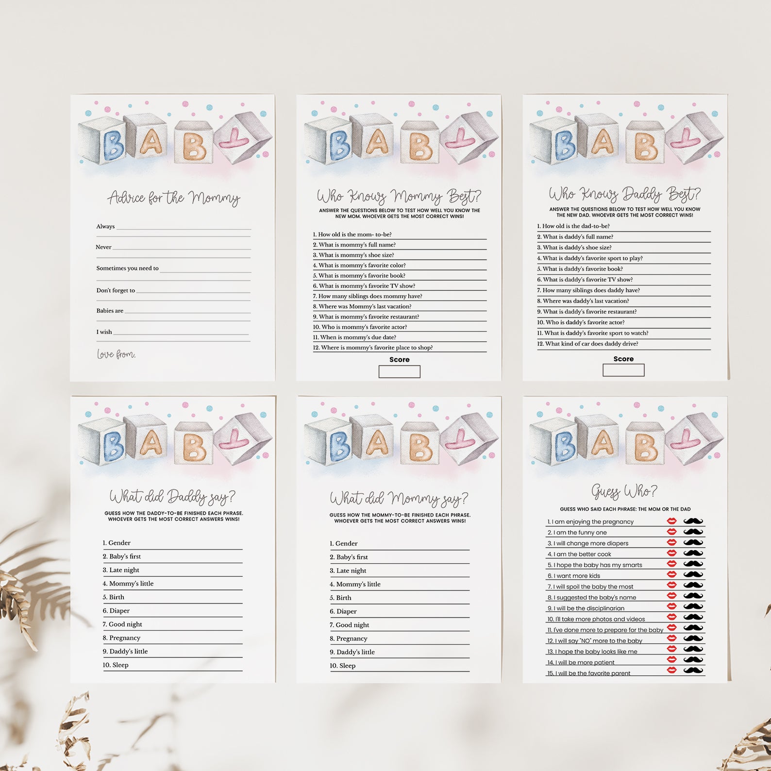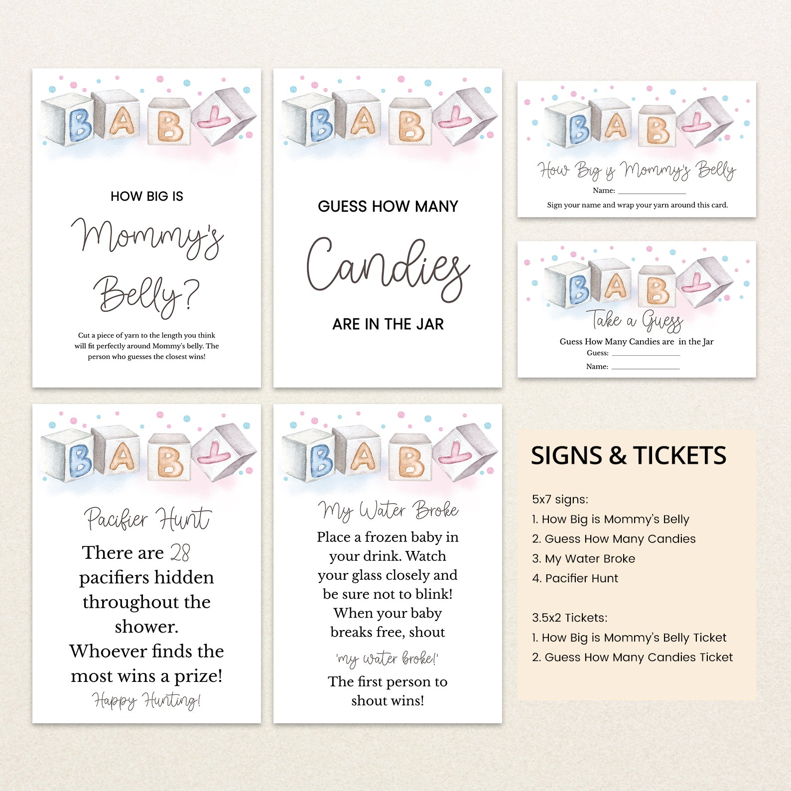 - Purchase this Minimalist Gender Reveal Game Bundle: Baby Blocks & Bubbles template