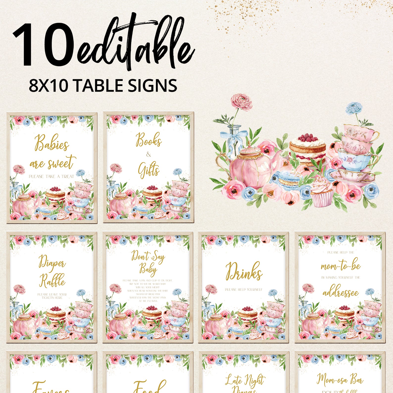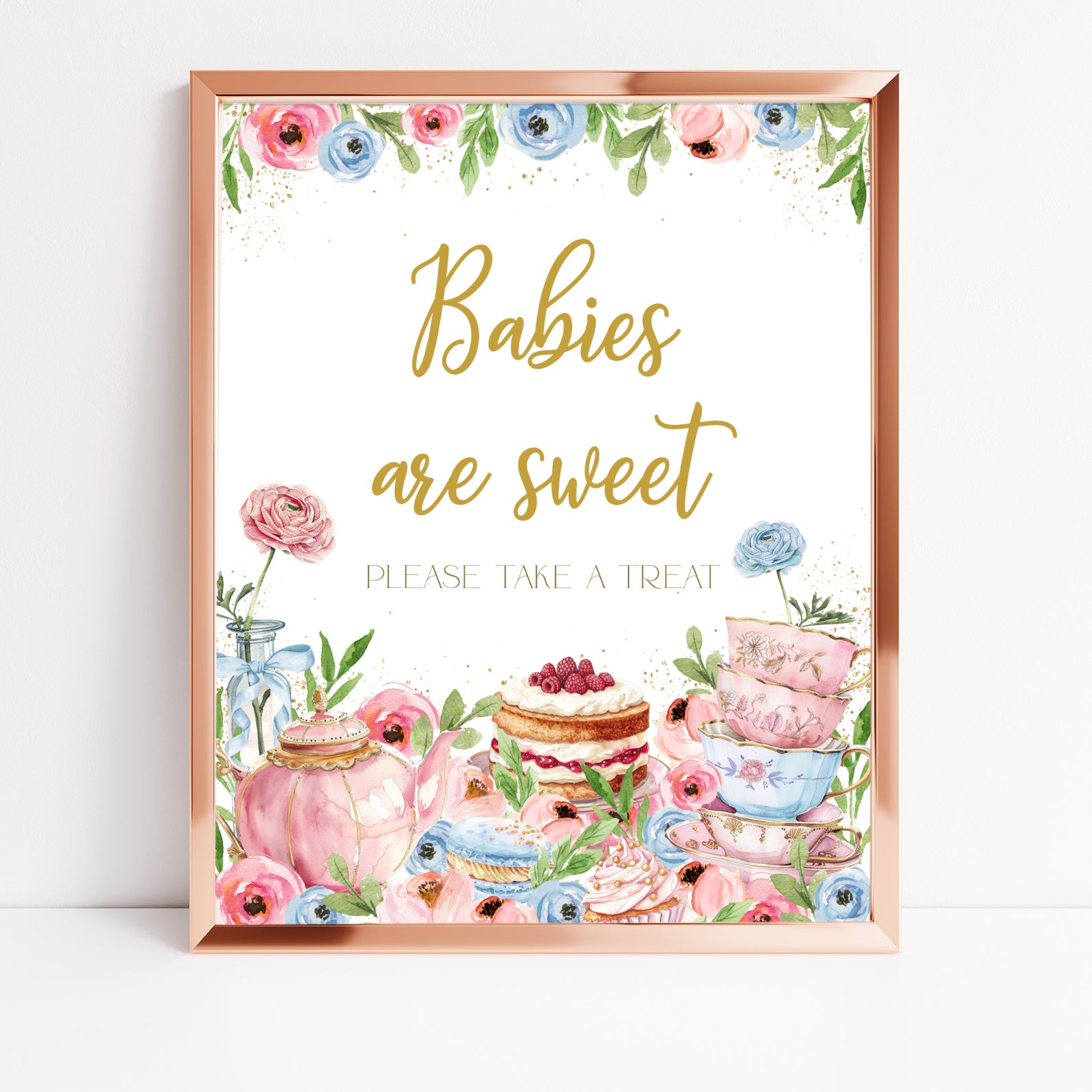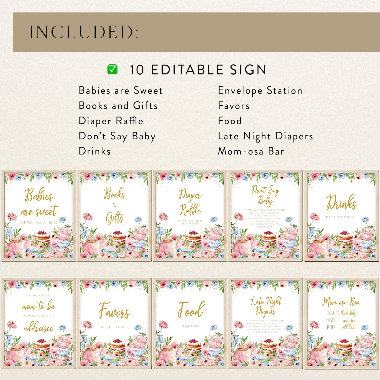 Add a touch of elegance to your baby shower with these charming tea party-themed table signs! Featuring delicate pink and blue florals, whimsical gold accents, and elegant script, this set includes Babies Are Sweet, Books & Gifts, Diaper Raffle, Don't Say Baby, Drinks, Envelope Station, Favors, Food, Late Night Diapers, and Mom-osa Bar. Perfect for creating a cohesive and sophisticated atmosphere at your celebration!