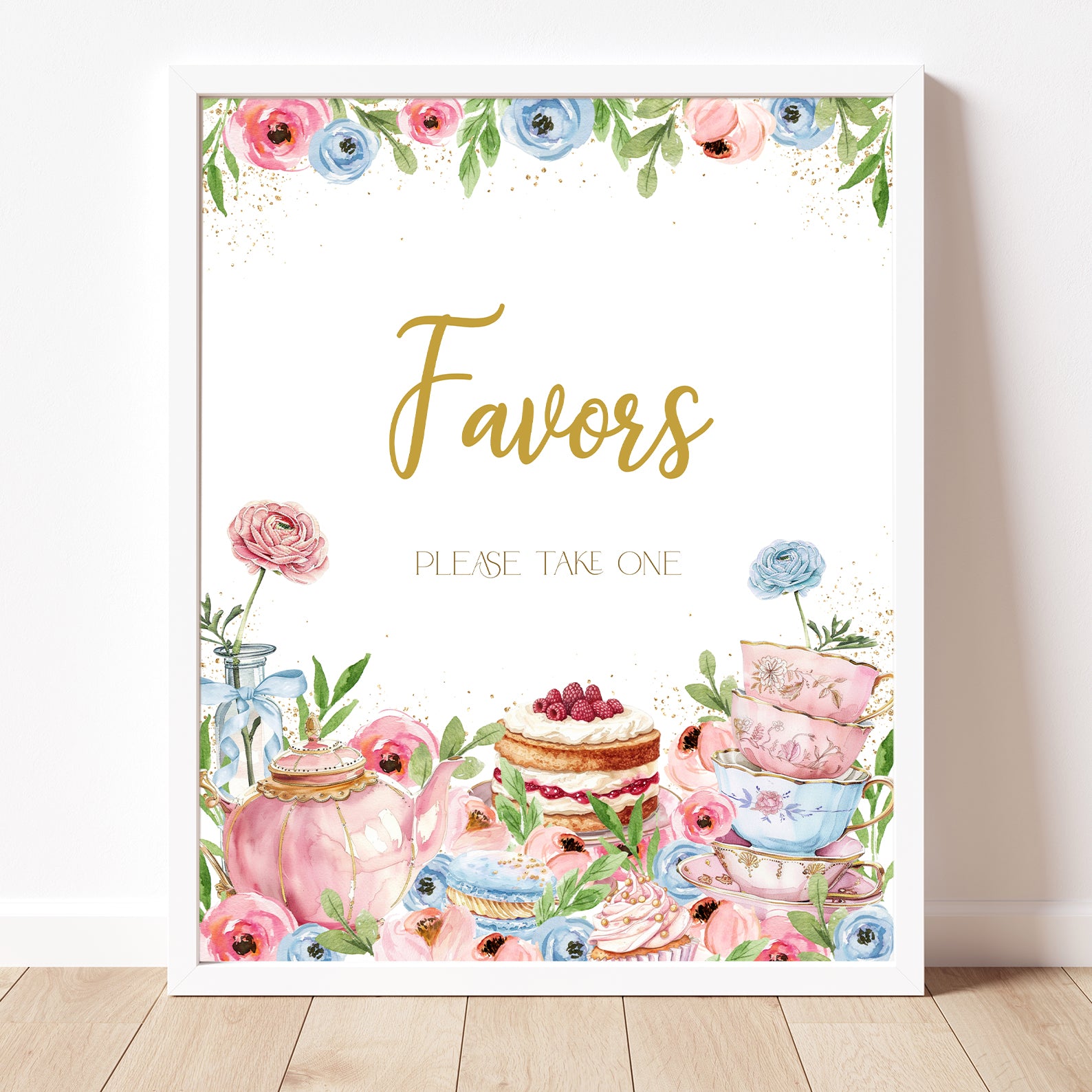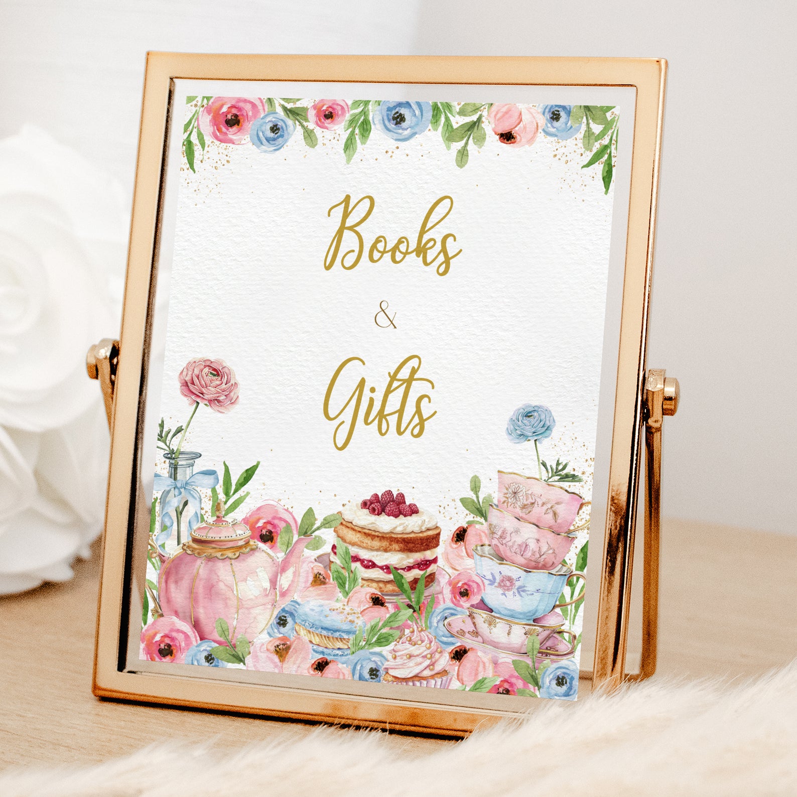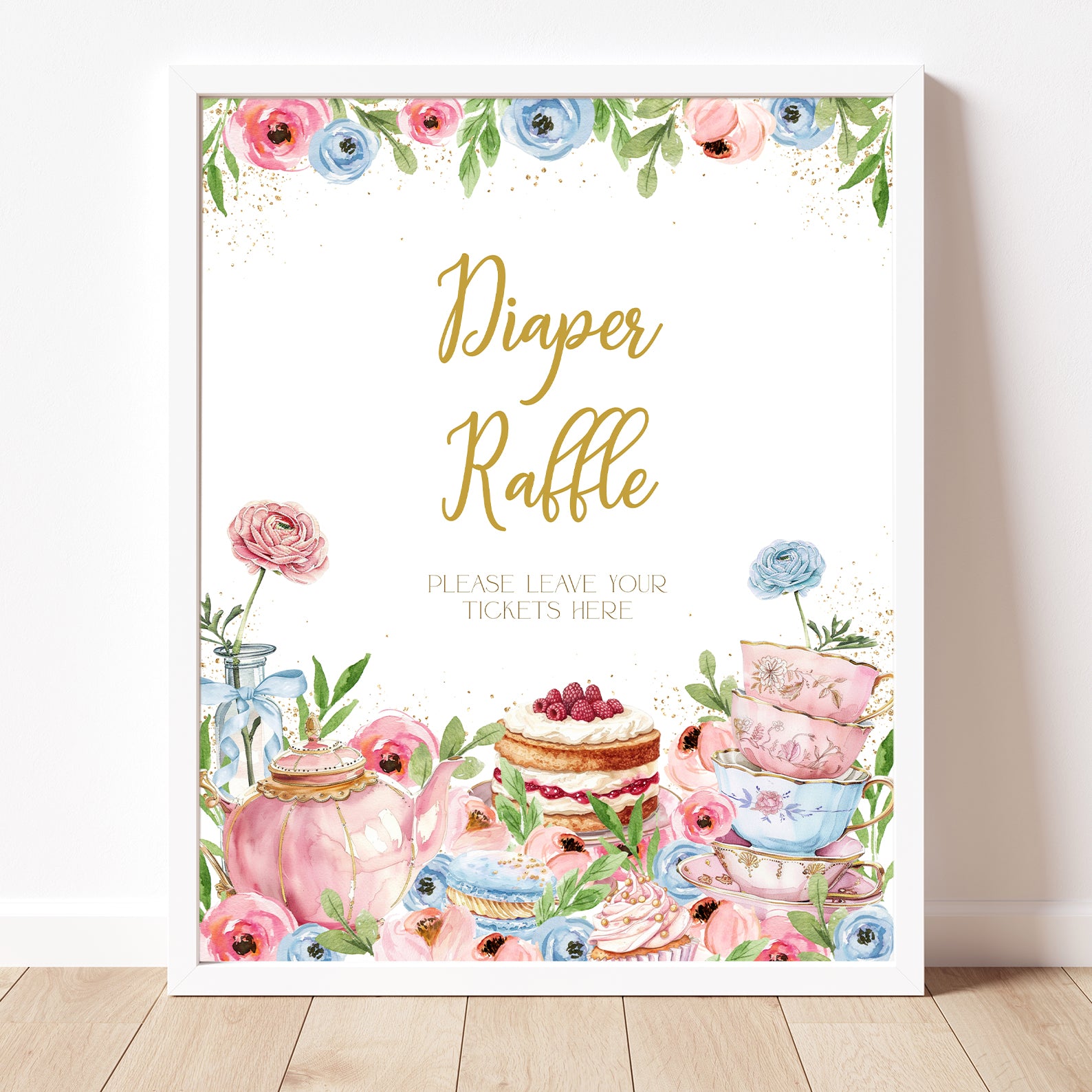 Add a touch of elegance to your baby shower with these charming tea party-themed table signs! Featuring delicate pink and blue florals, whimsical gold accents, and elegant script, this set includes Babies Are Sweet, Books & Gifts, Diaper Raffle, Don't Say Baby, Drinks, Envelope Station, Favors, Food, Late Night Diapers, and Mom-osa Bar. Perfect for creating a cohesive and sophisticated atmosphere at your celebration!