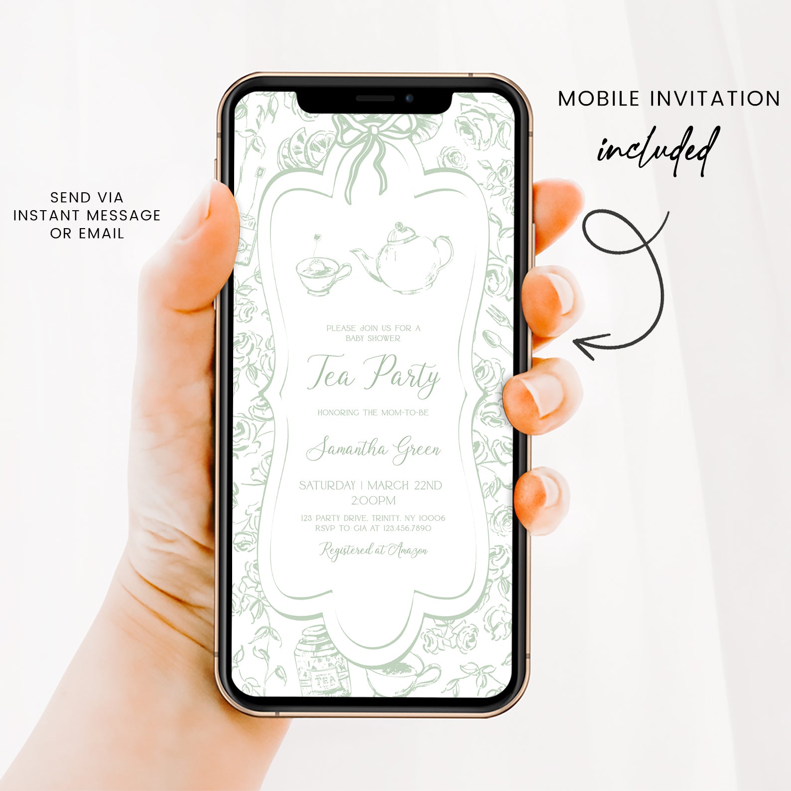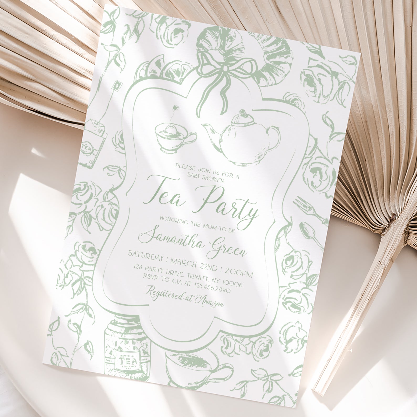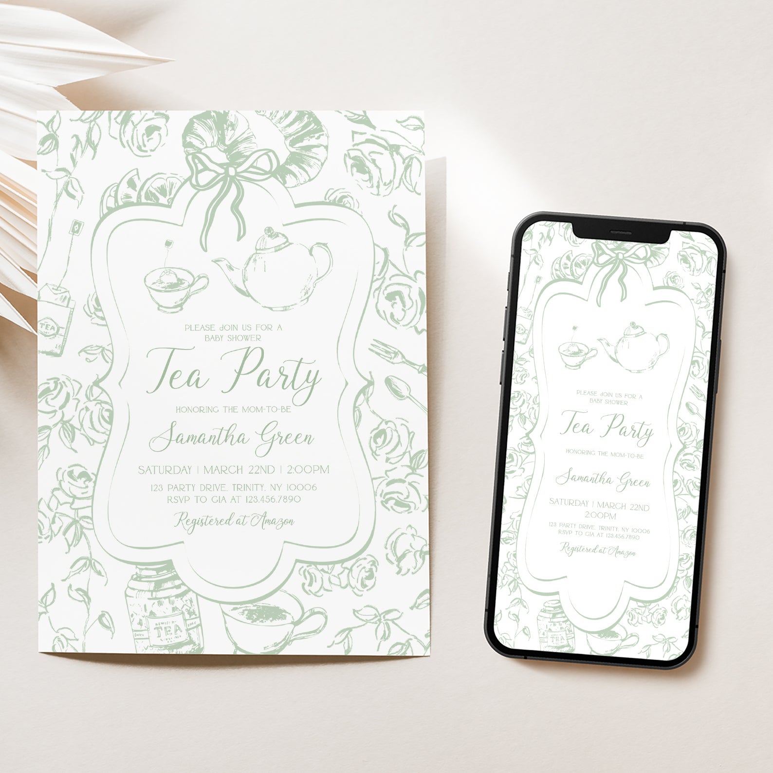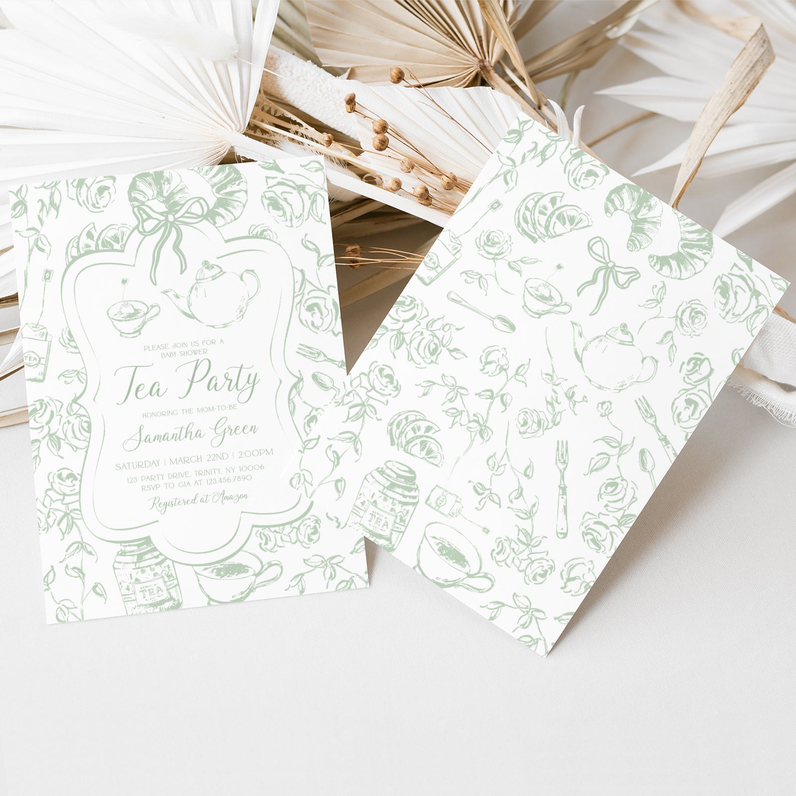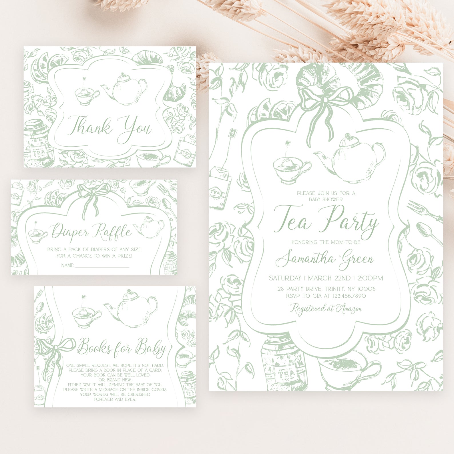 Green Tea Party Baby Shower Invitation Bundle with Floral Accents