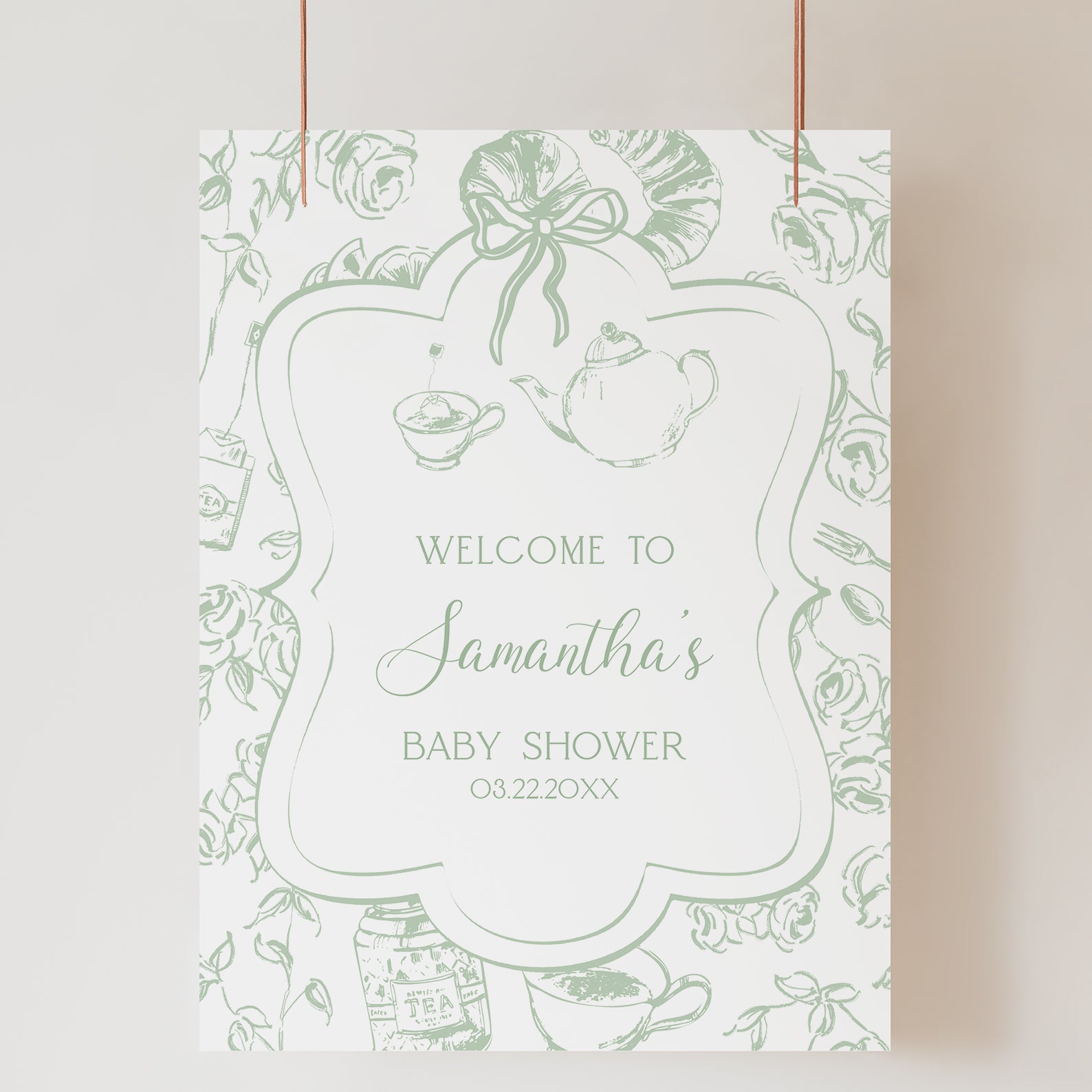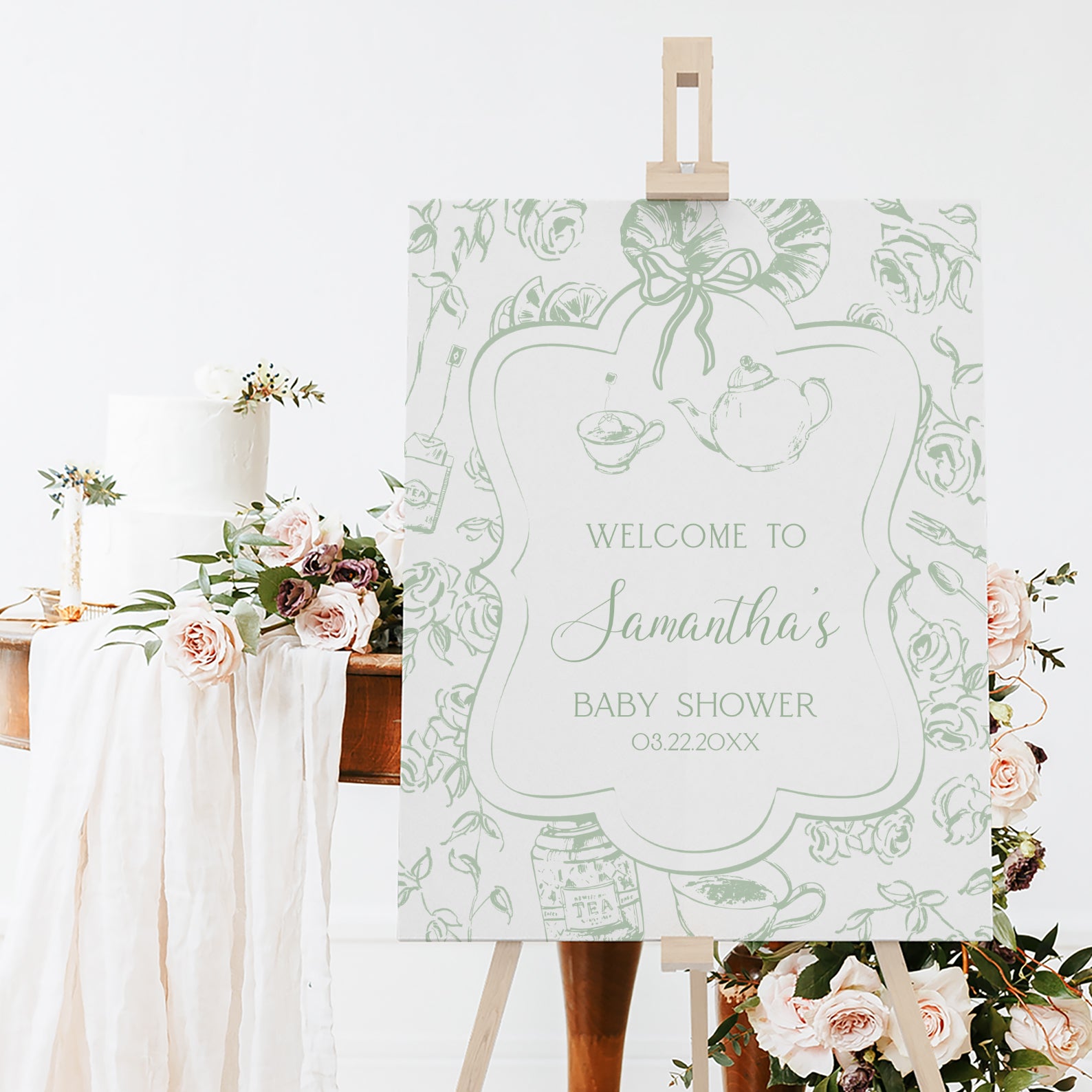 Green Tea Party Baby Shower Welcome Sign with Floral Accents