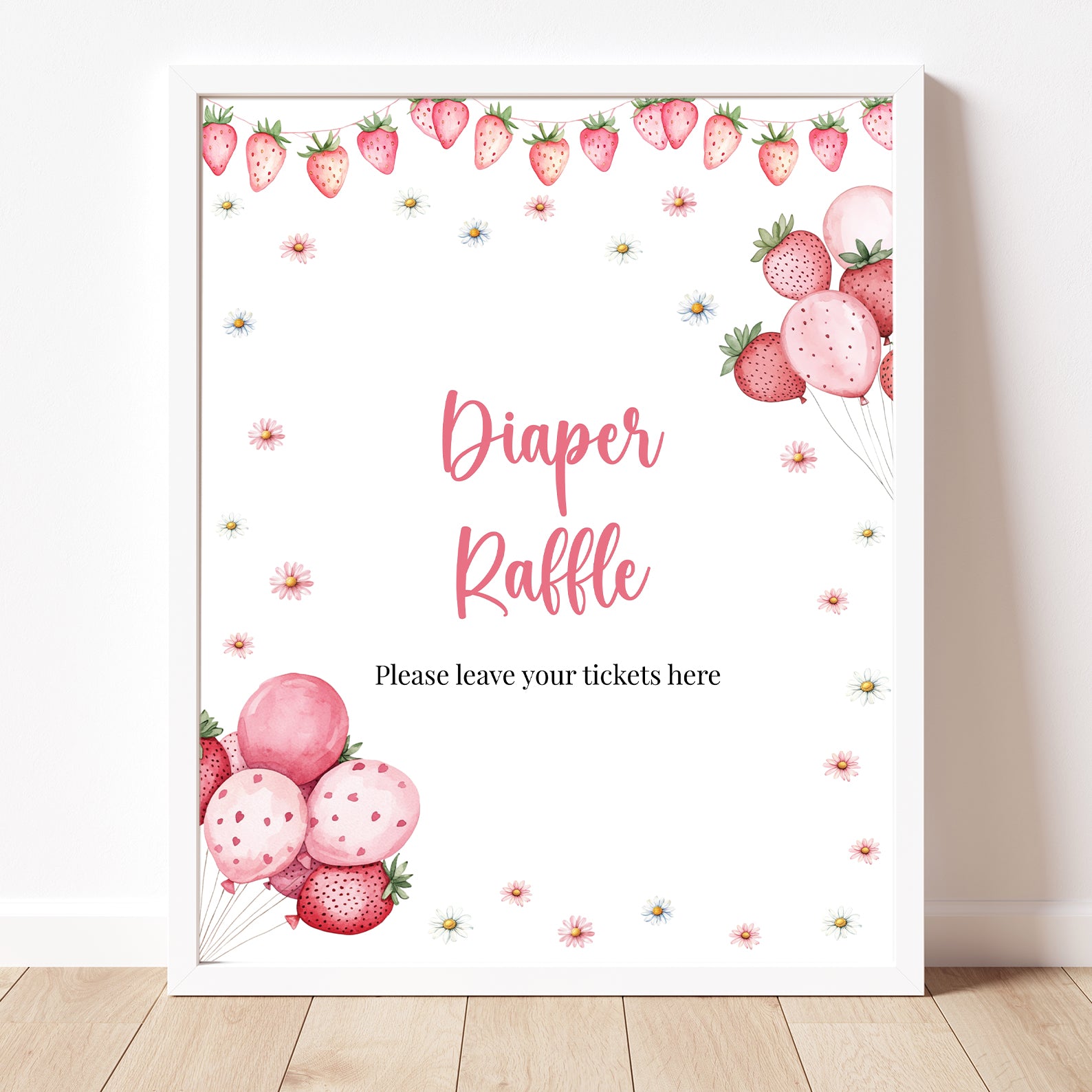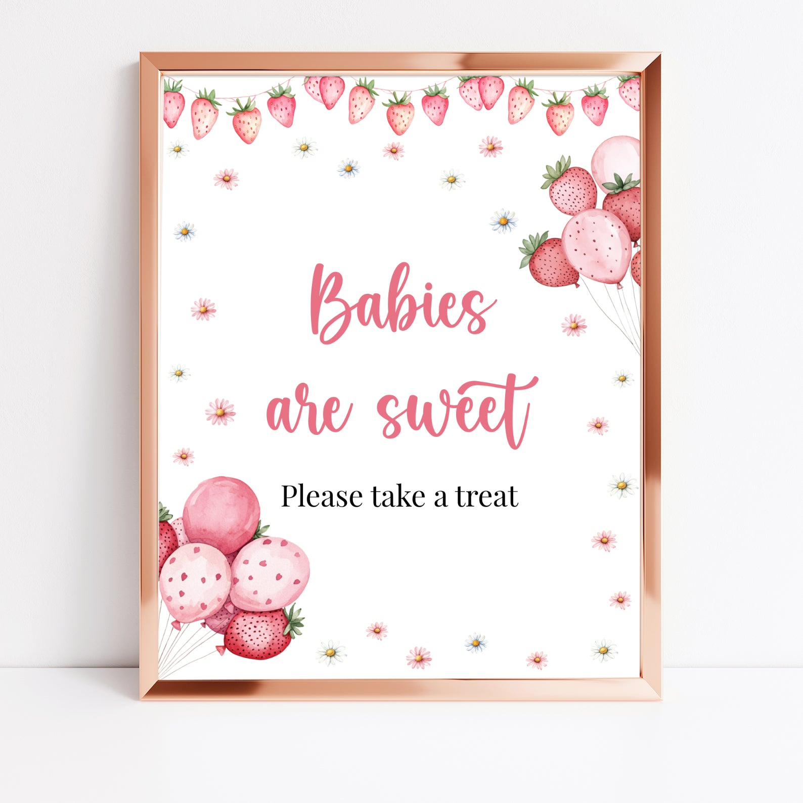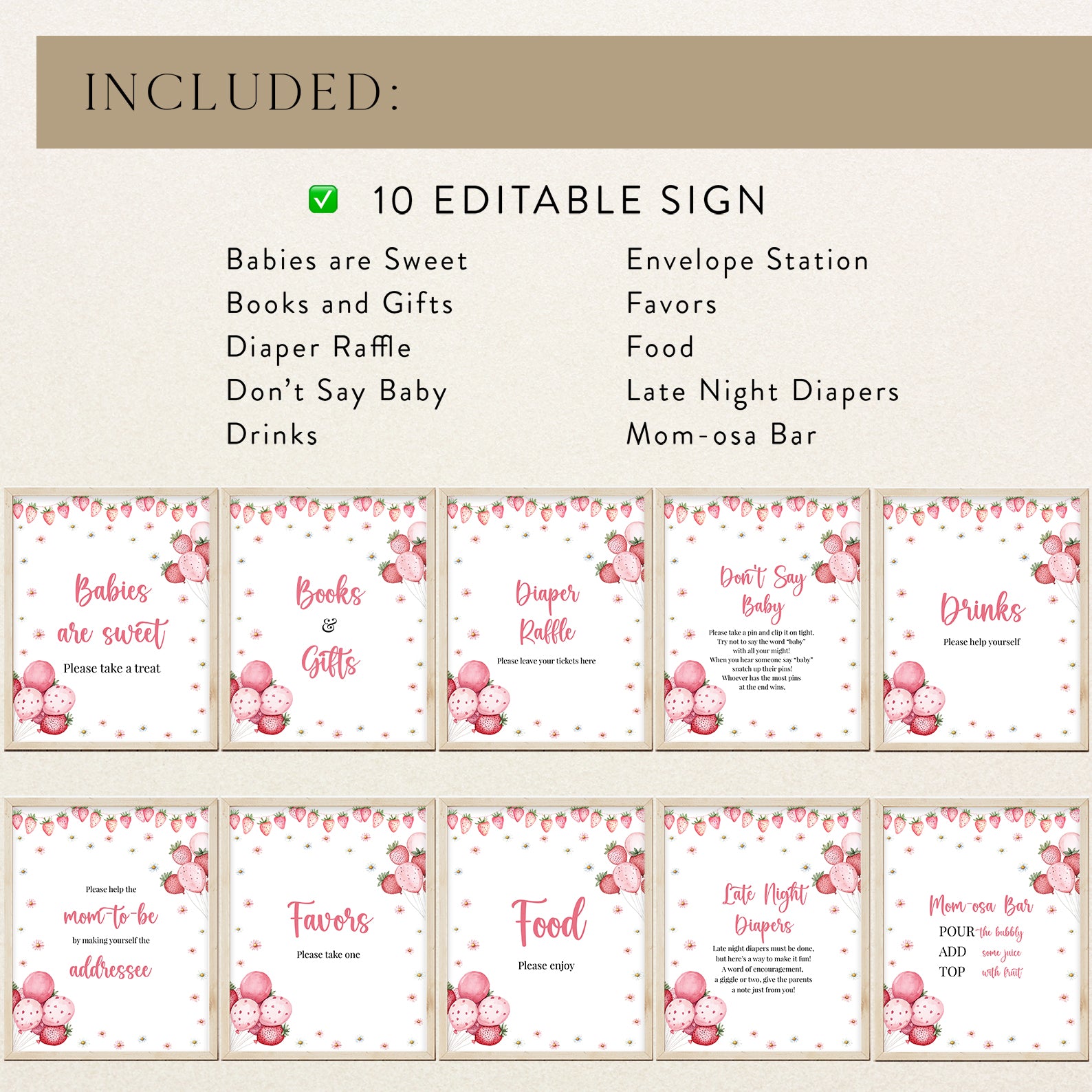 Add a sweet touch to your baby shower with this charming set of ten editable table signs! Featuring a delightful pink theme, each sign is adorned with a whimsical watercolor strawberry banner, playful pink balloons, strawberry-shaped balloons, and falling pink and white daisy flowers. This bundle includes signs for Babies Are Sweet, Books and Gifts, Diaper Raffle, Don't Say Baby, Drinks, Envelope Station, Favors, Food, Late Night Diapers, and Mom-osa Bar—perfect for enhancing your berry sweet celebration décor!